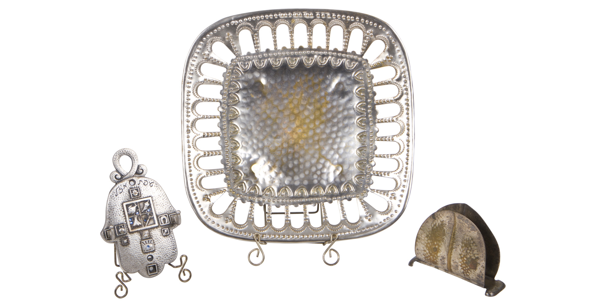 לוט של שלושה כלי מתכת ישנים, צלחת למצות, מתלה מגבות או מפתחות בצורת חמסה ומעמד למפיות, רוחב הצלחת: 29 ס"מ.
