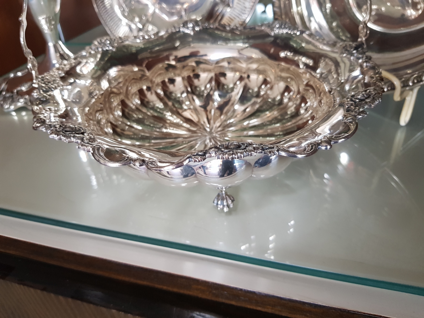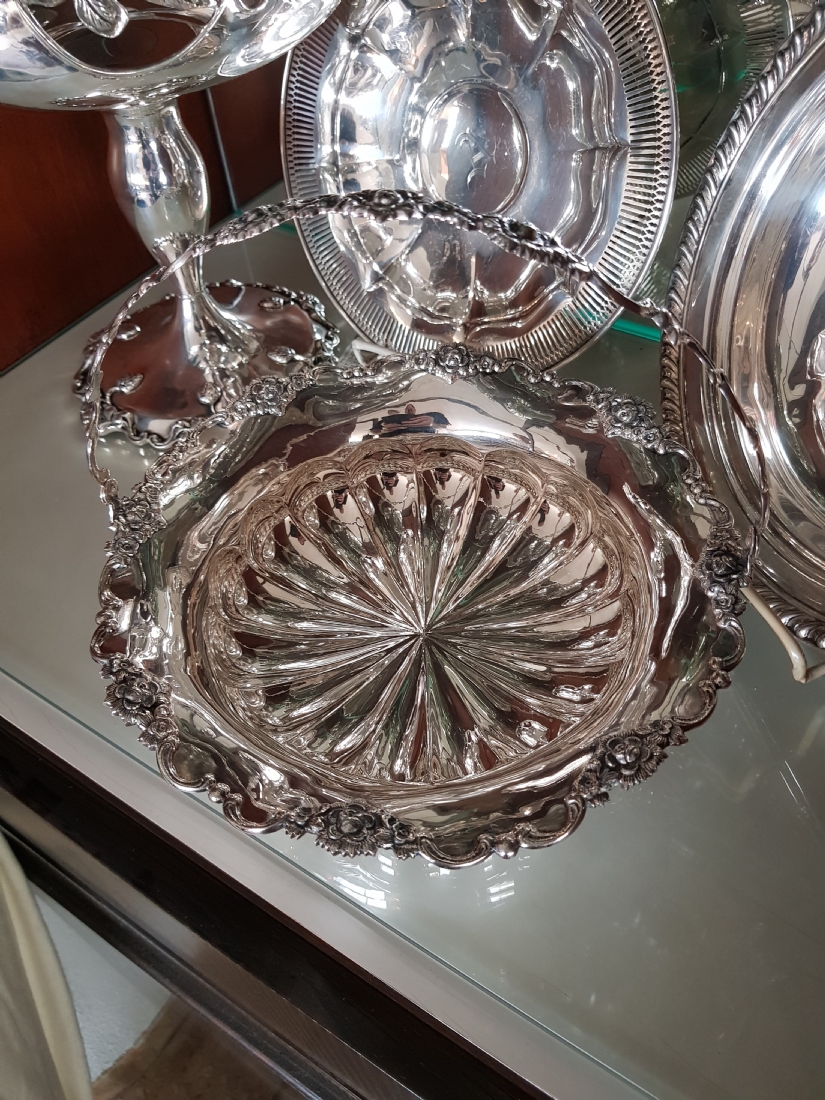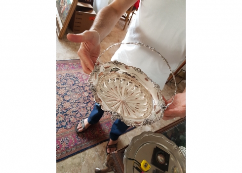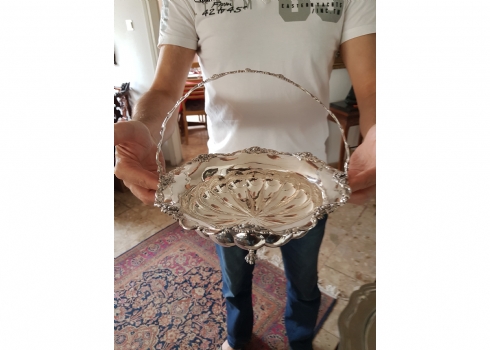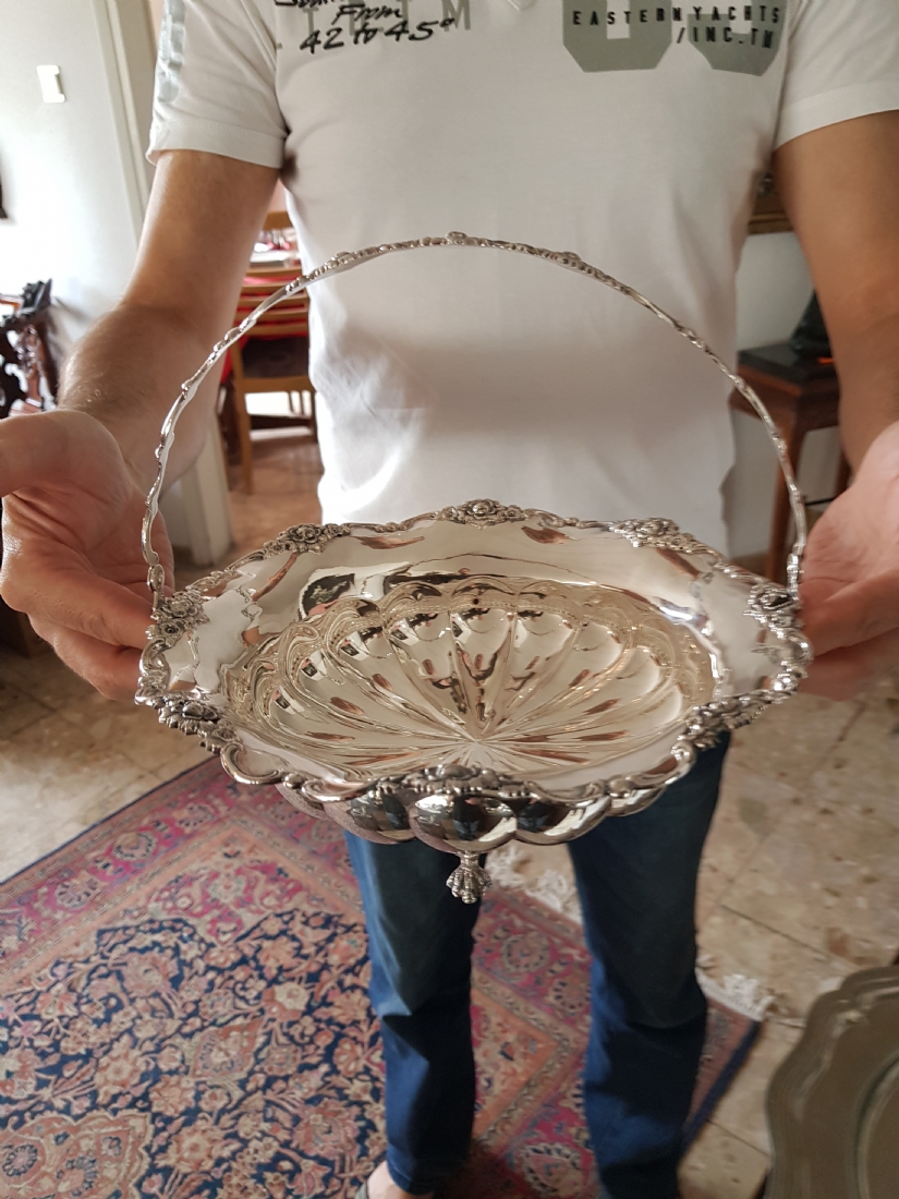 סלסלת כסף עשויה כסף 'סטרלינג' חתום: '925', משקל: 544 גרם, גובה עם הידית: 23 ס"מ, קוטר: 24 ס"מ.