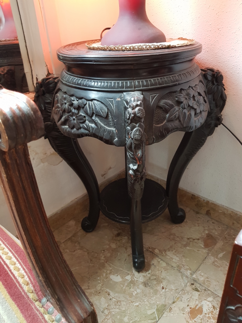 מעמד עץ סיני ישן ויפה עשוי עץ מגולף, גובה: 64 ס"מ, קוטר המשטח העליון: 35 ס"מ.