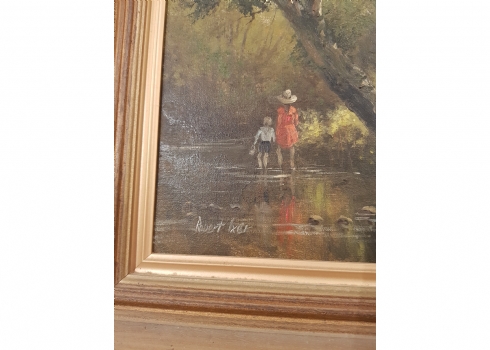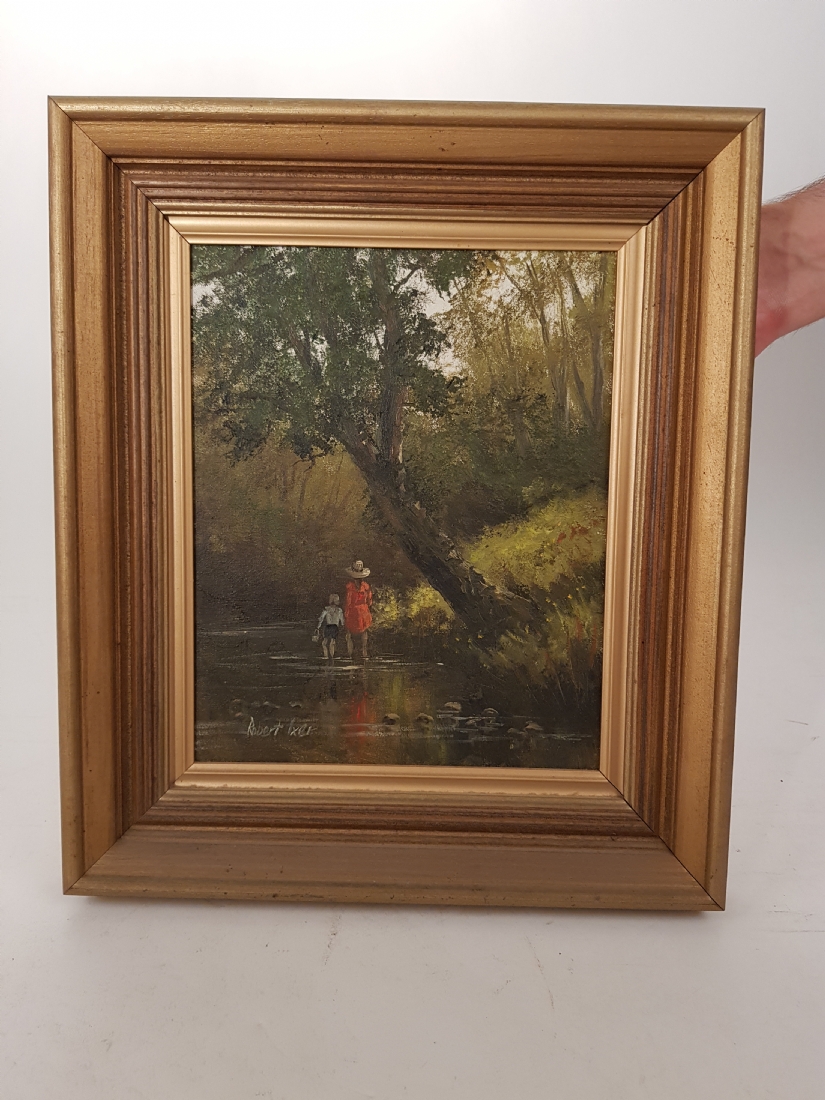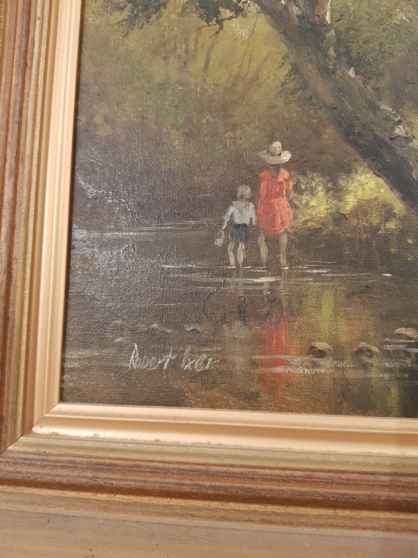 'שני ילדים צועדים לנחל' - ציור ישן, שמן על בד, חתום: 'Robert Lxer', מידות: 25X20 ס"מ.