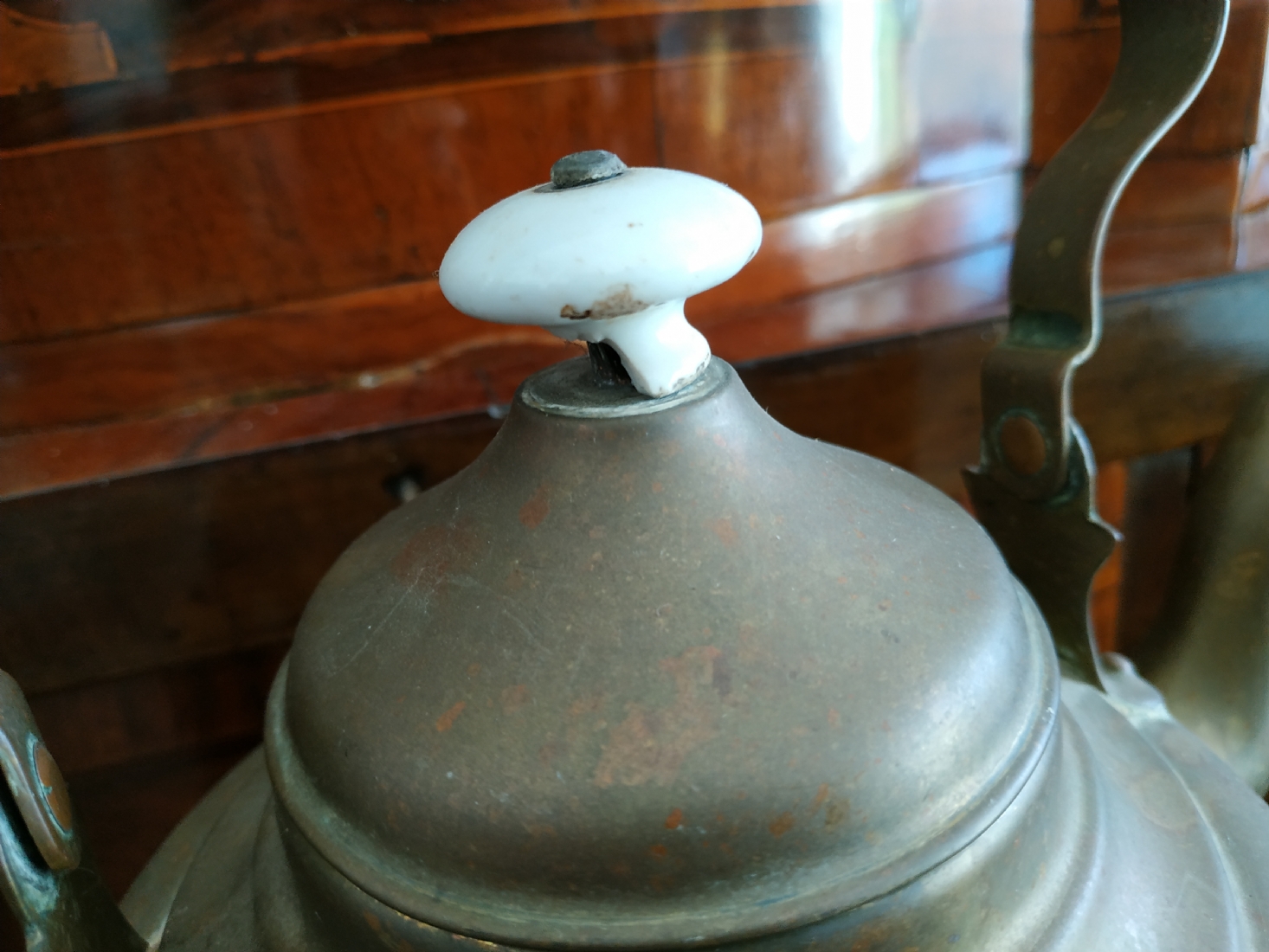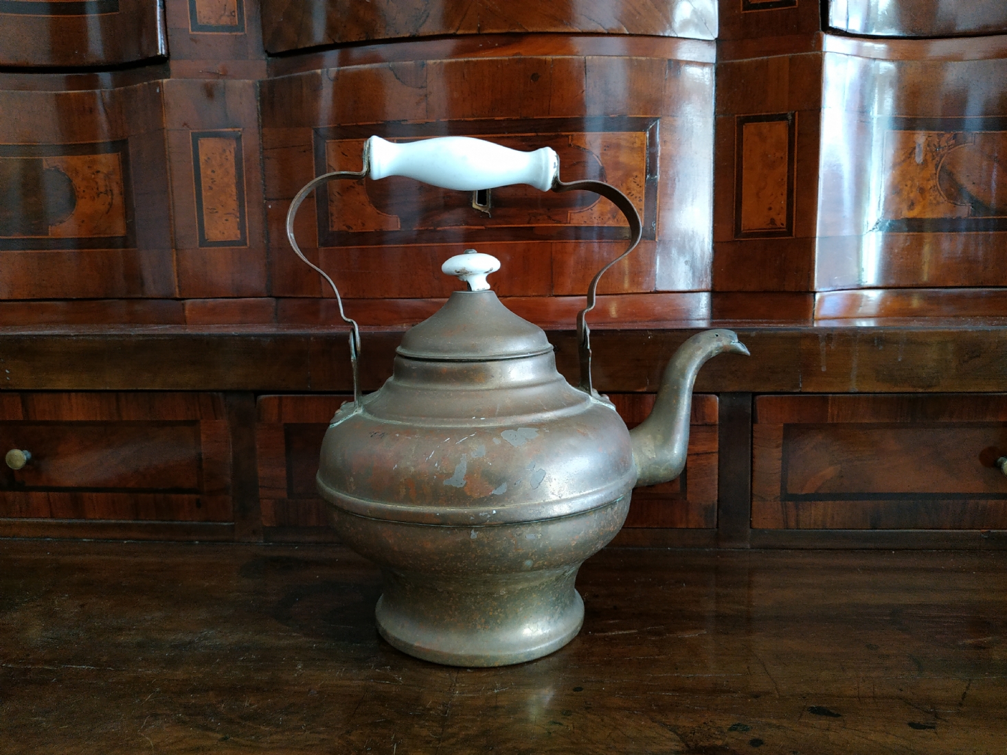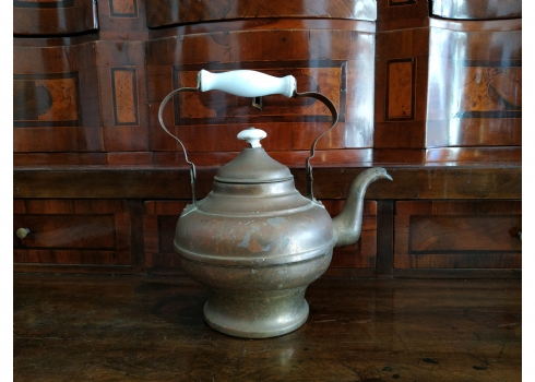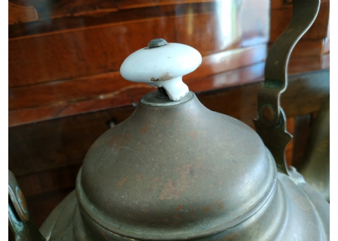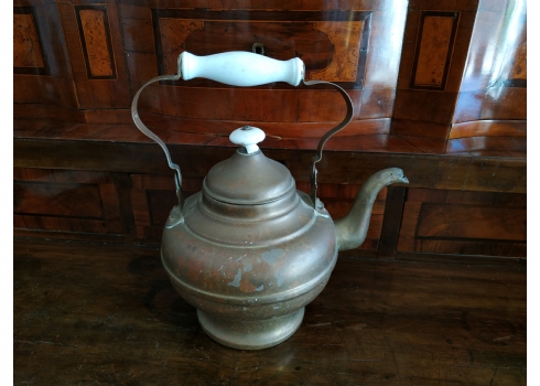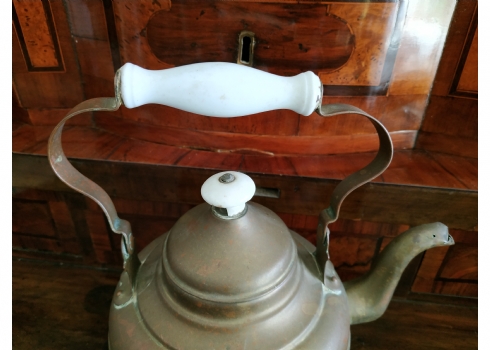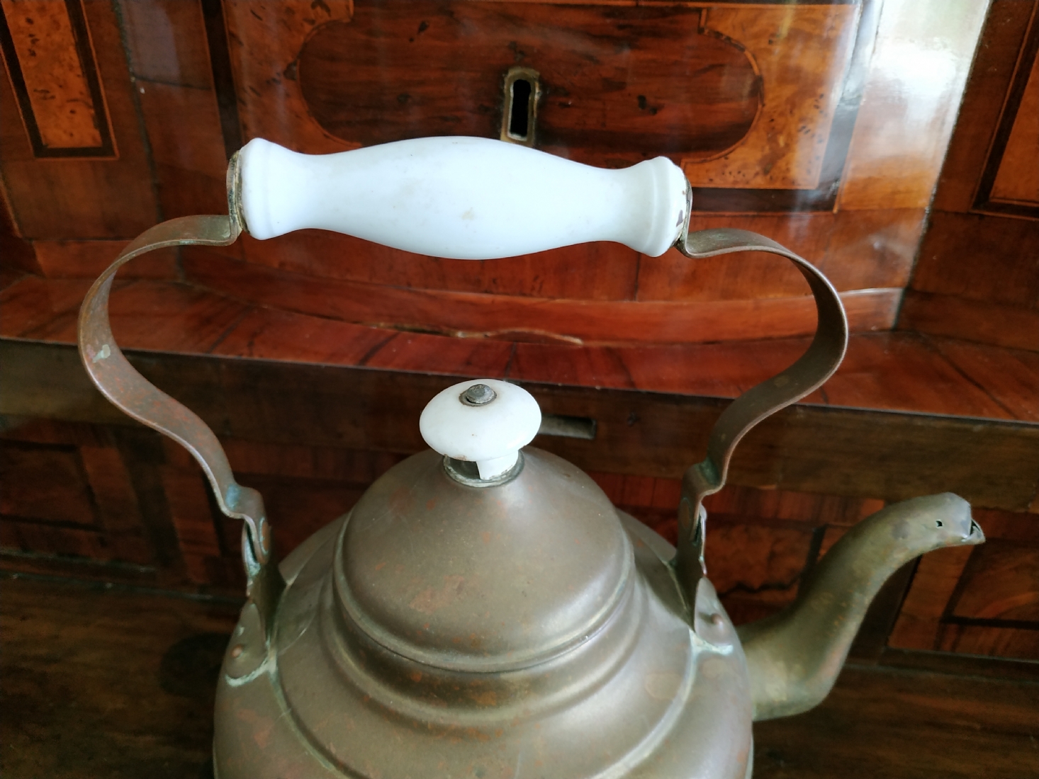 קומקום תה ישן כפי הנראה הולנדי, עשוי פליז וידיות עשויות חרסינה לבנות (פגם), גובה: 25 ס"מ.