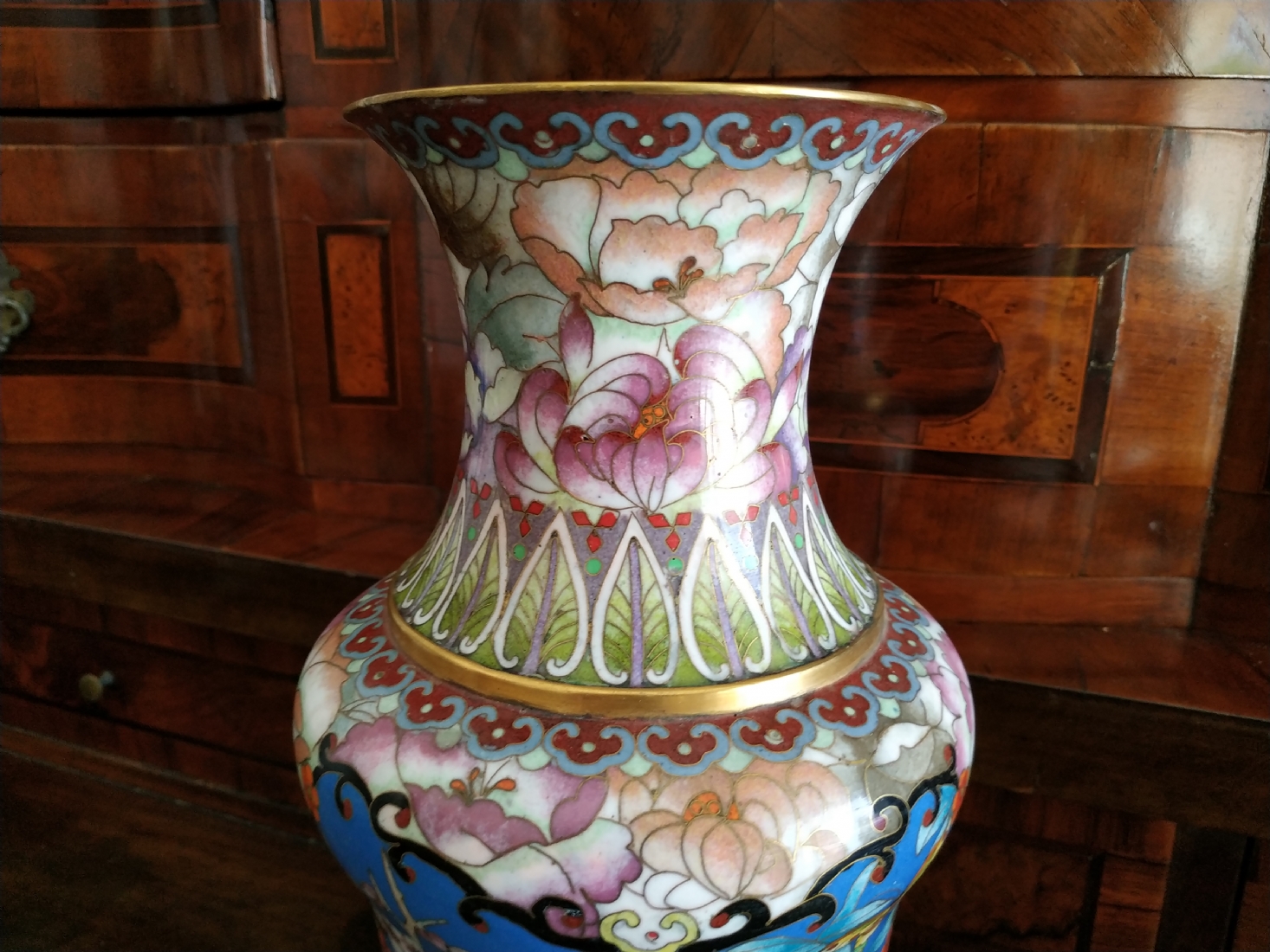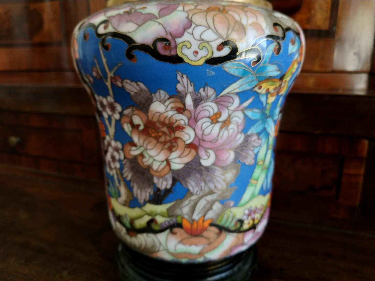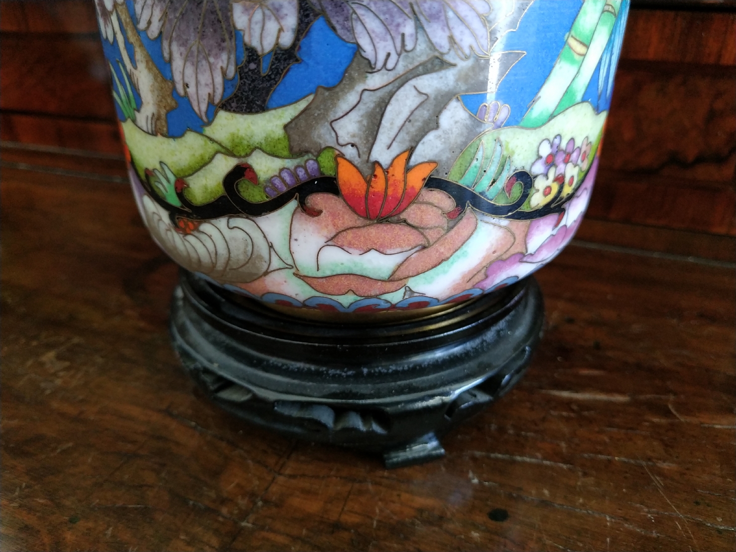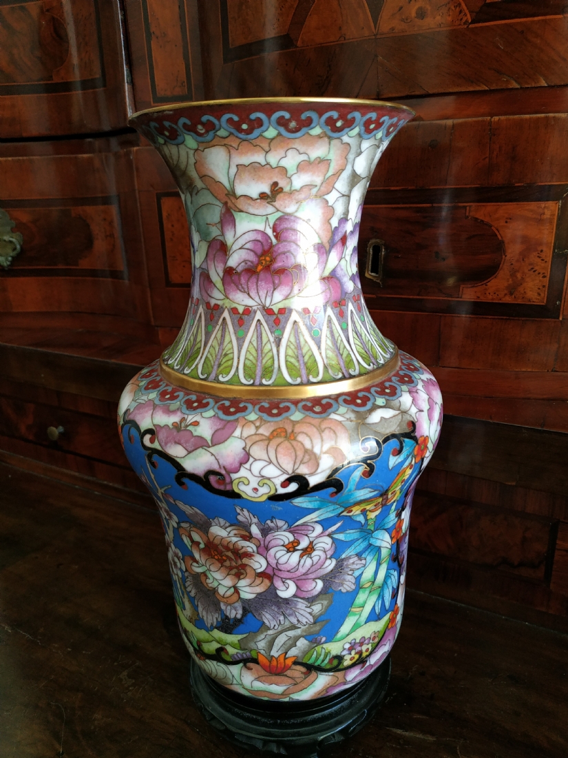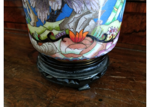 כד סיני, עשוי בעבודת קלואזונה (Cloisonné), מעמד עץ תואם, גובה כולל המעמד: 29 ס"מ.