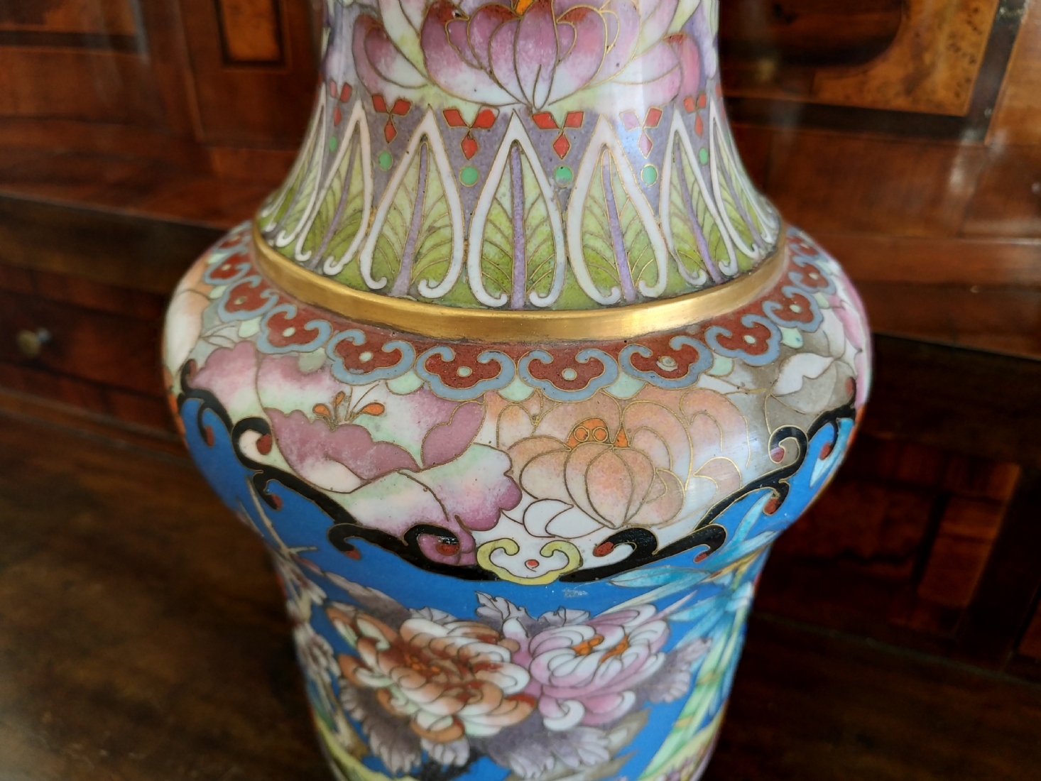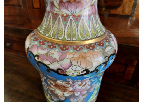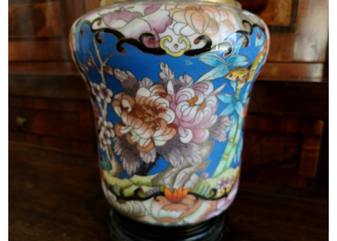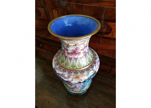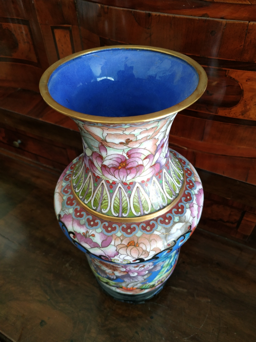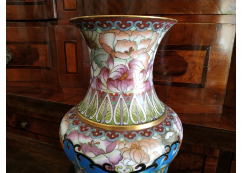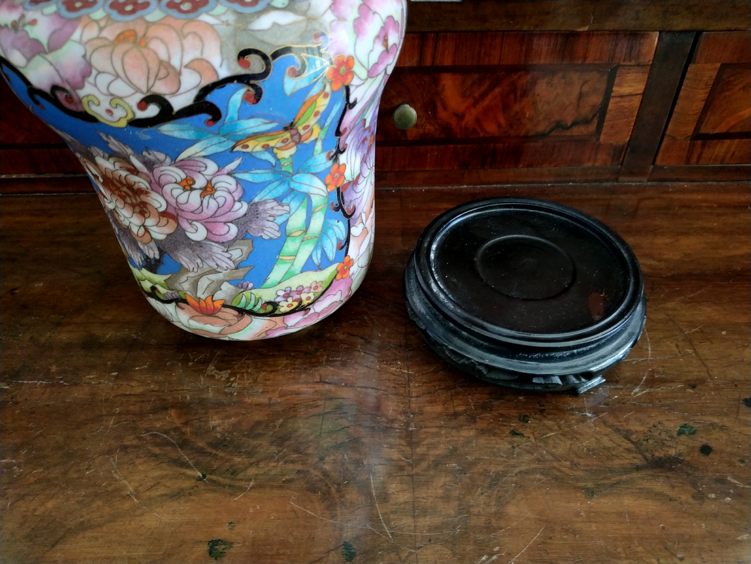 כד סיני, עשוי בעבודת קלואזונה (Cloisonné), מעמד עץ תואם, גובה כולל המעמד: 29 ס"מ.