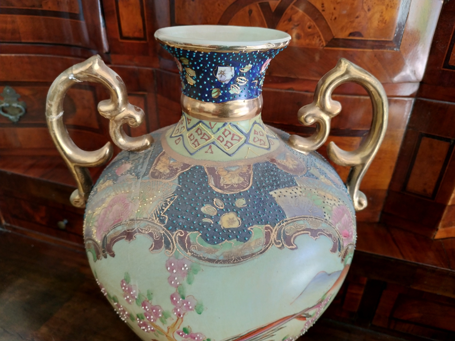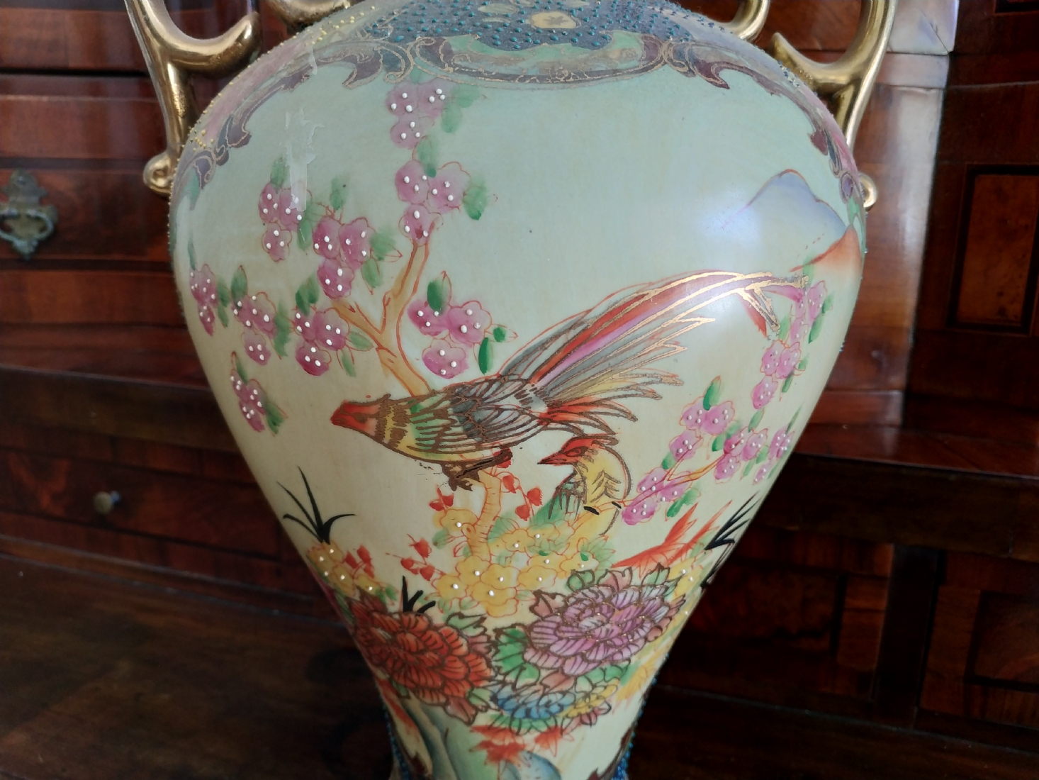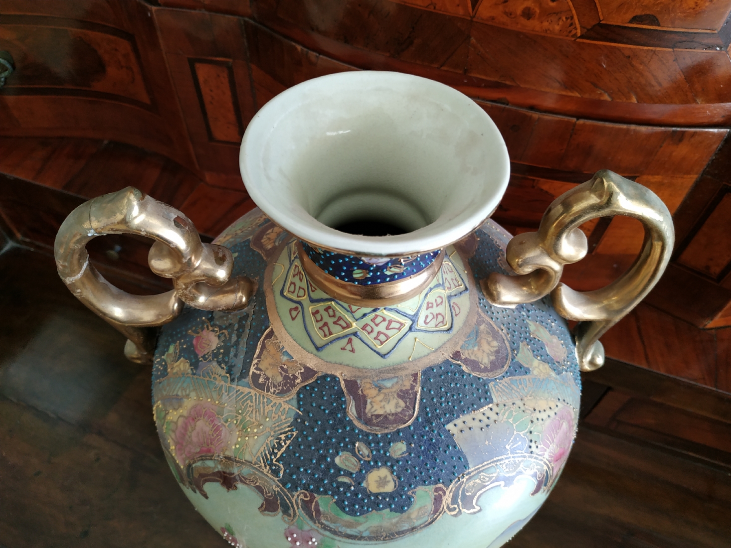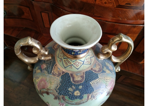 אגרטל סיני דקורטיבי בעל שתי ידיות מוזהבות, עשוי חרס מעוטר באמייל, גובה: 38 ס"מ.