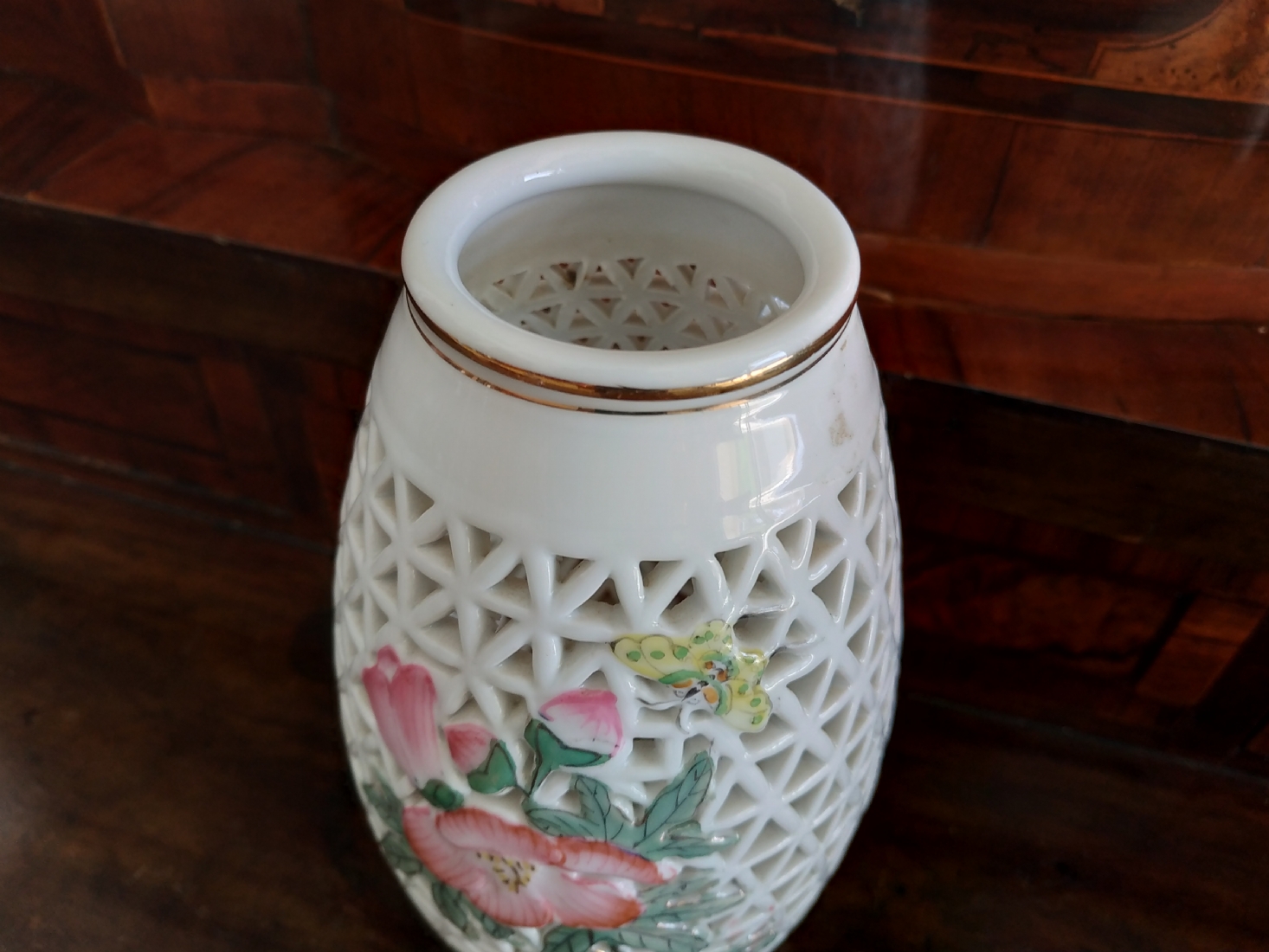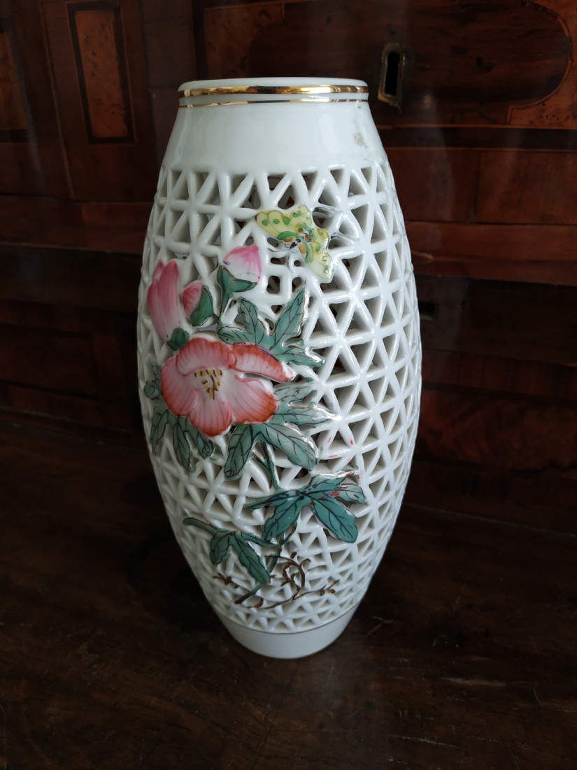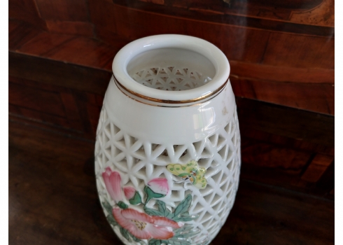 אגרטל חרסינה סיני מחורר מעוטר בדגם פרחוני