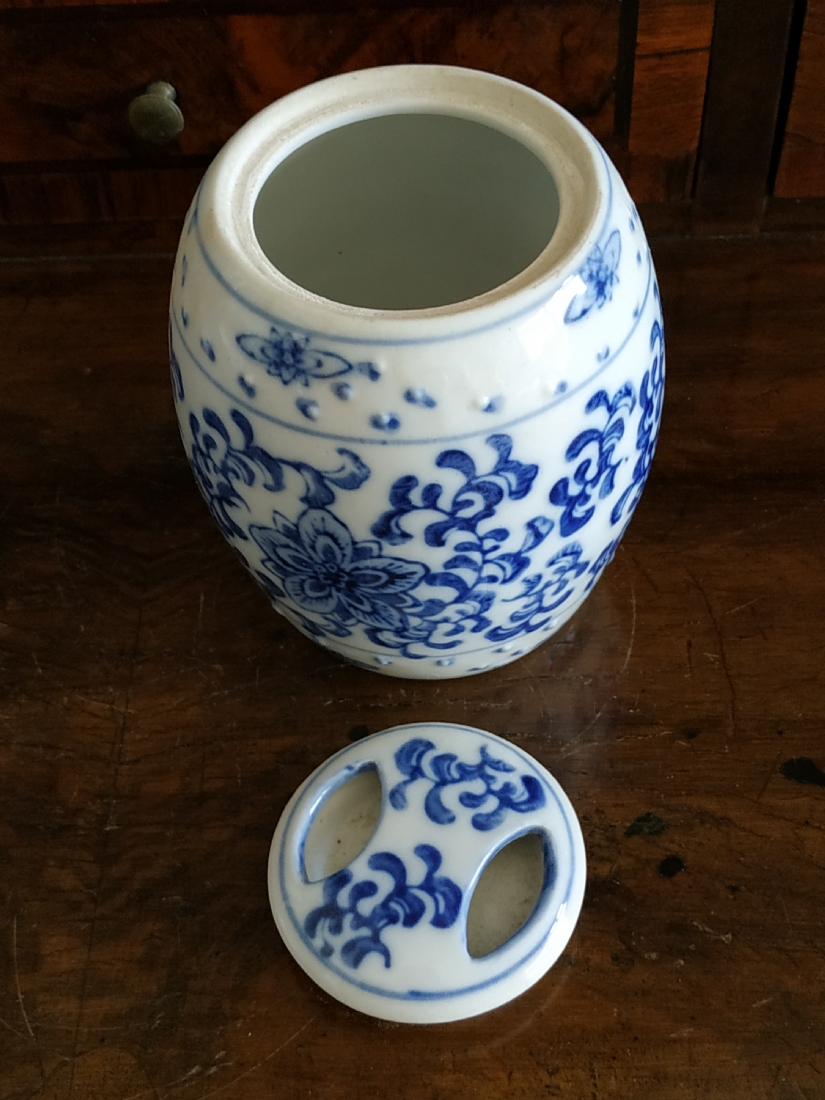 מיכל סיני בצורת חבית ומכסה תואם, מעוטרים בקובלט כחול
