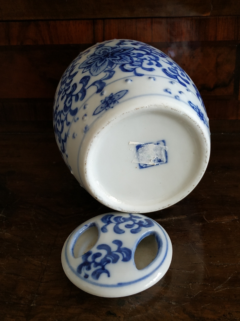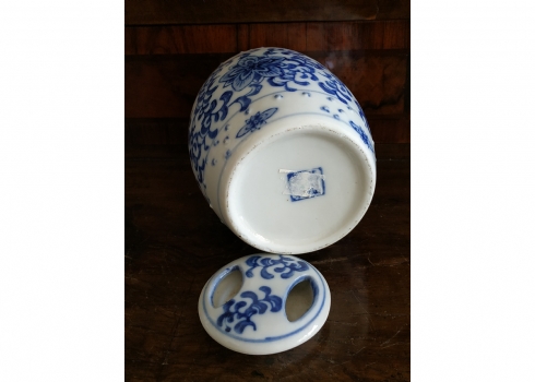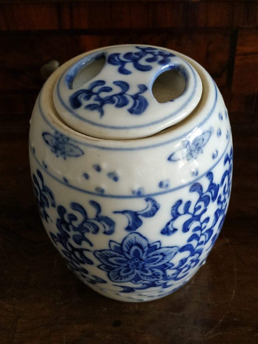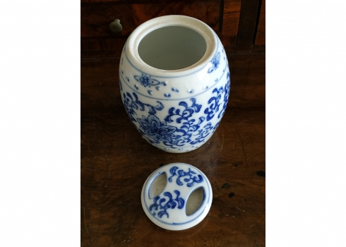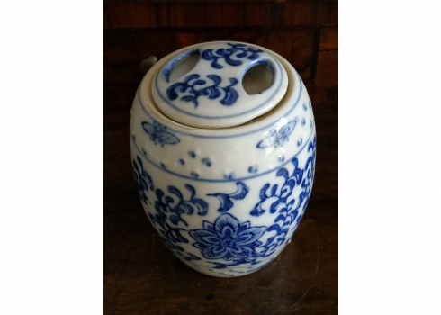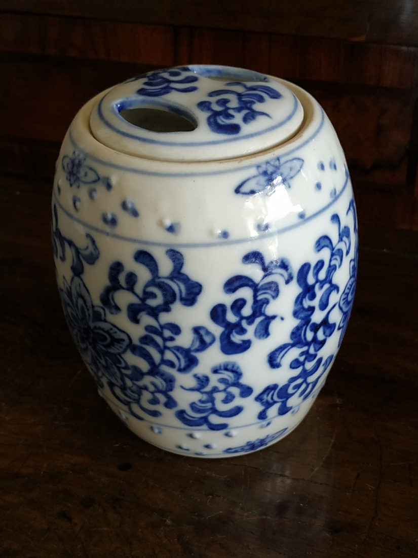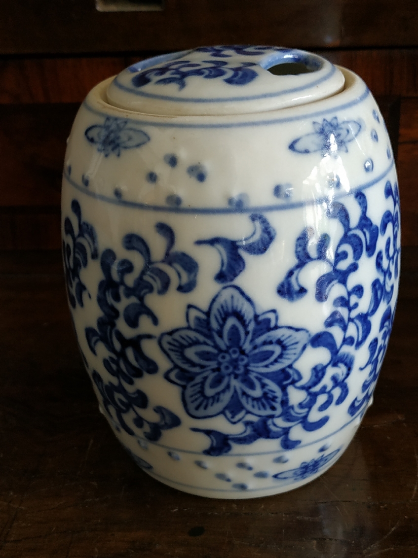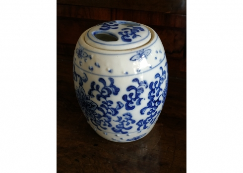 מיכל סיני בצורת חבית ומכסה תואם, מעוטרים בקובלט כחול, גובה: 12 ס"מ.