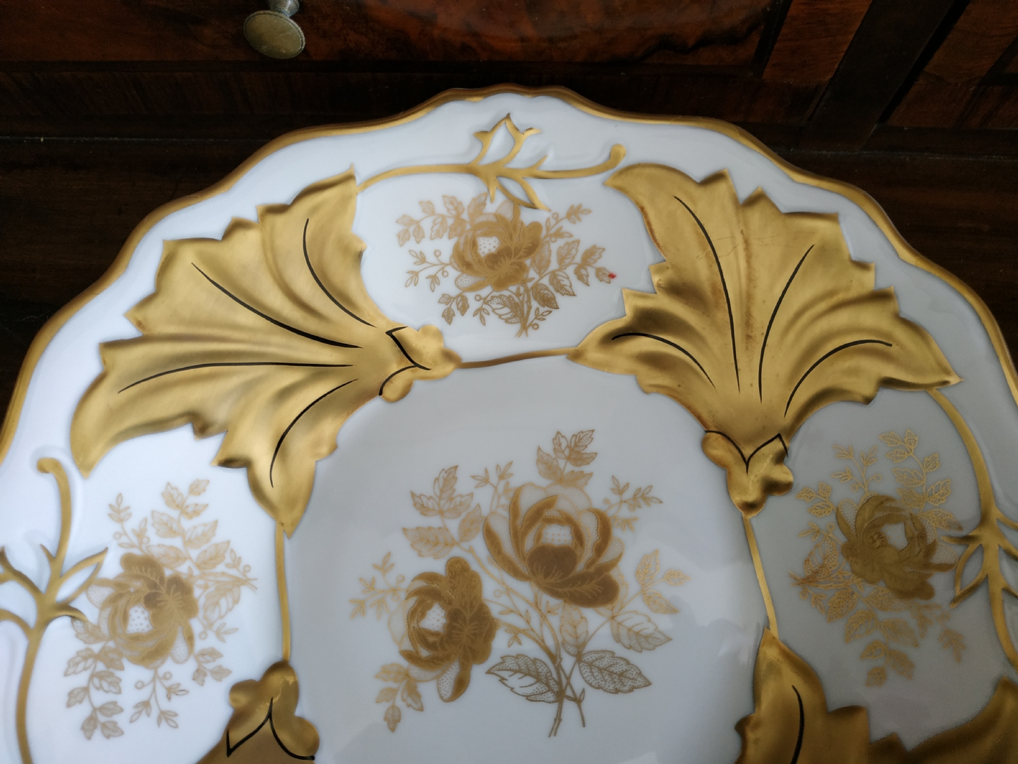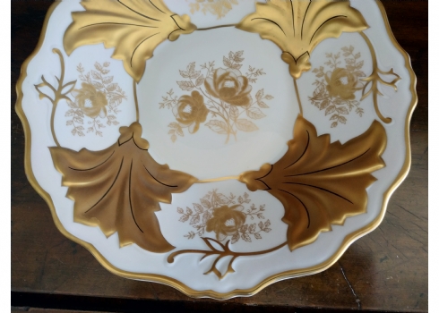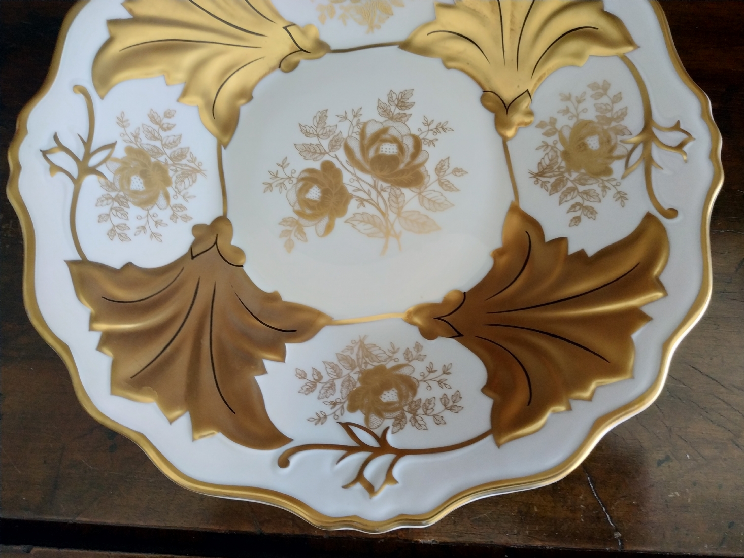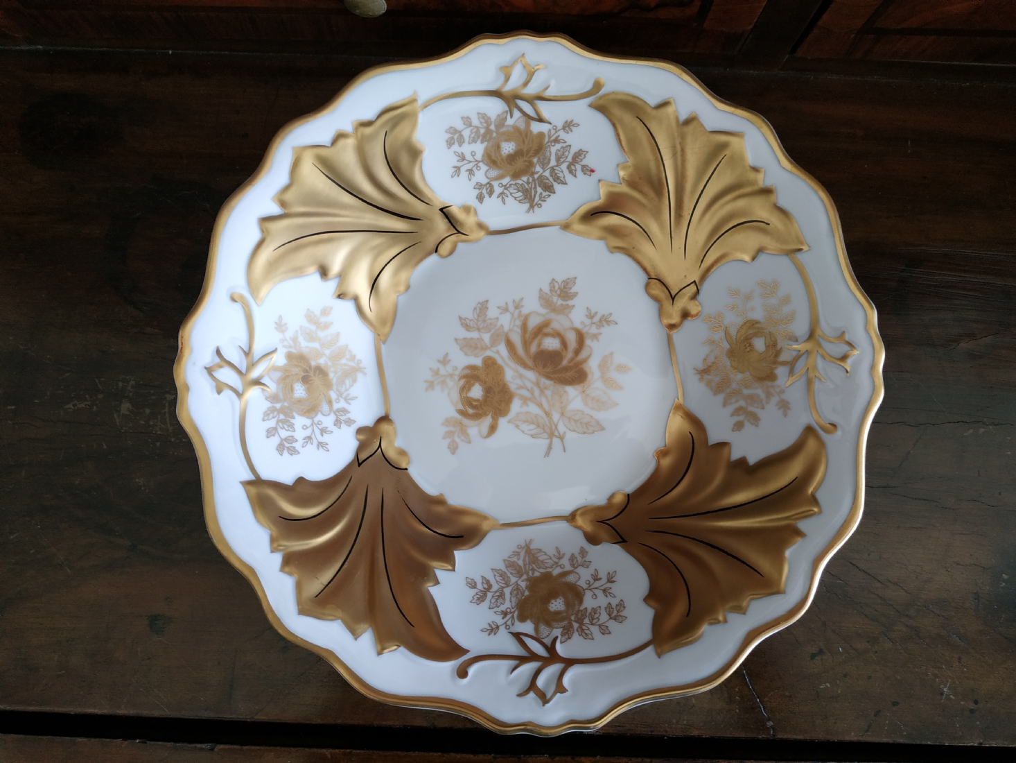 צלחת פורצלן גרמנית איכותית, חתומה, מעוטרת בזהב ובאמייל שחור, קוטר: 24 ס"מ.