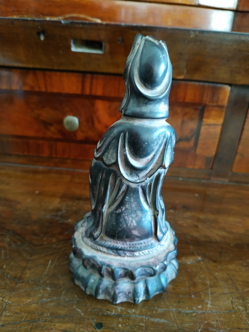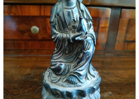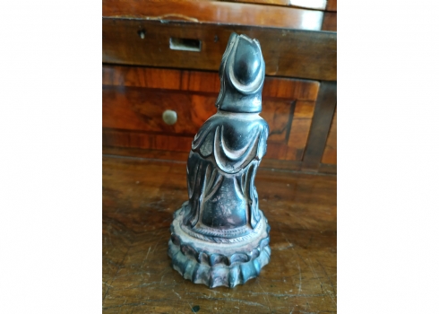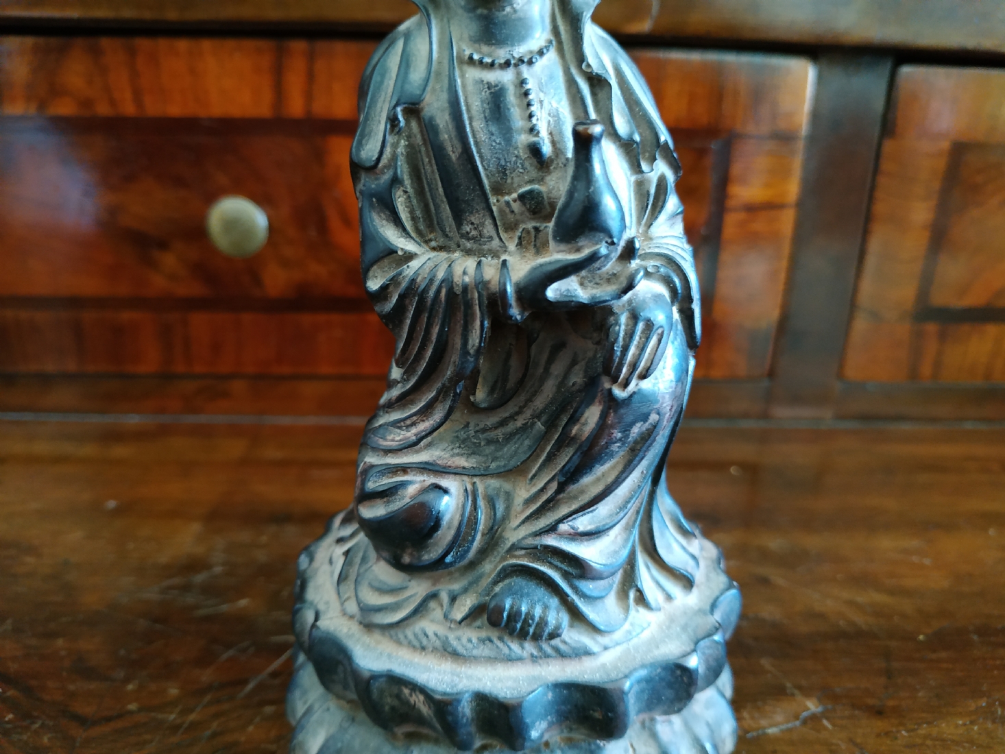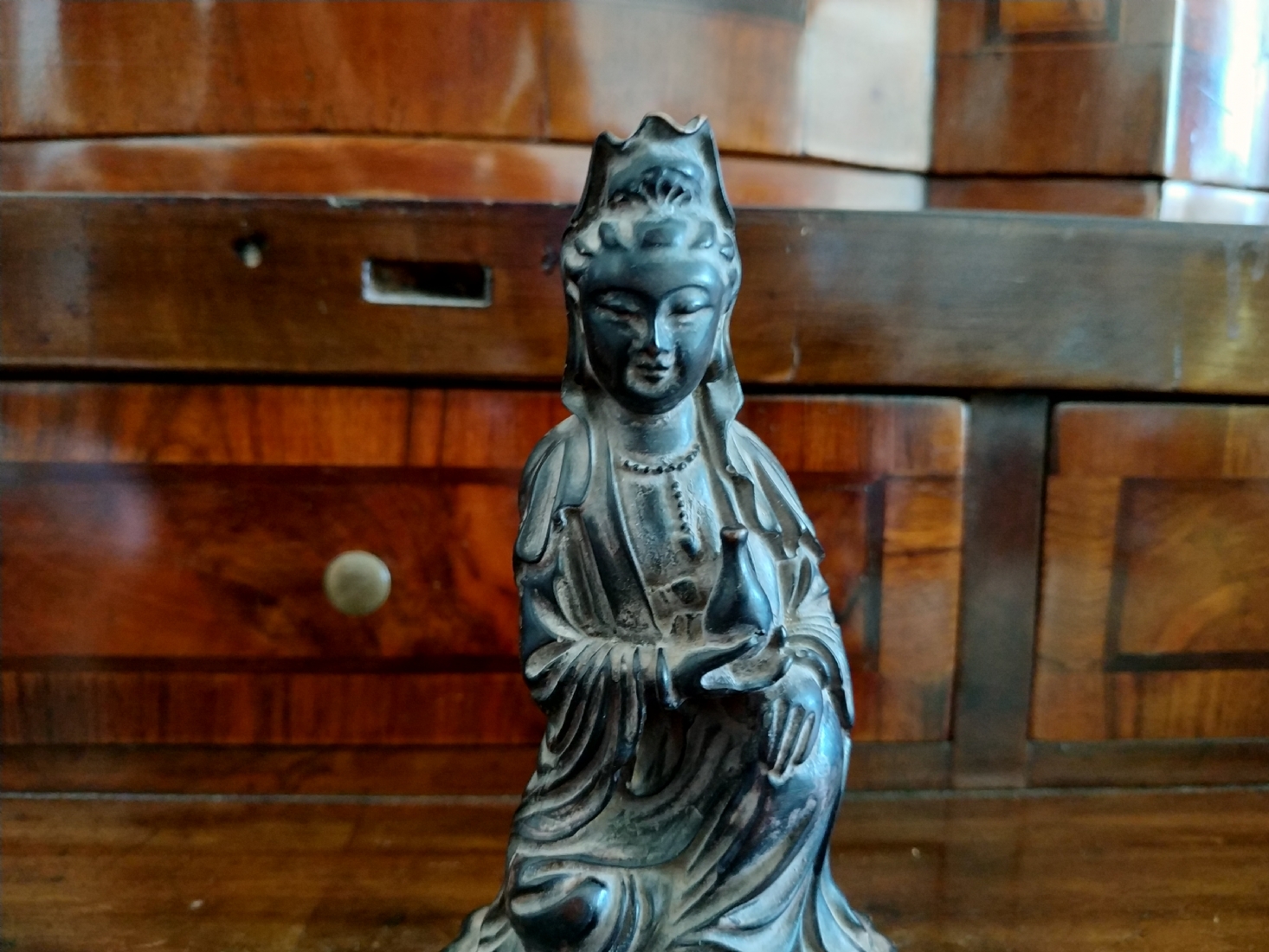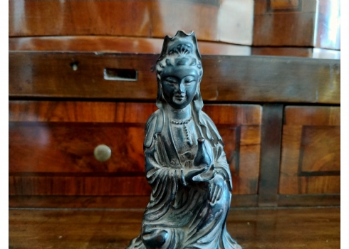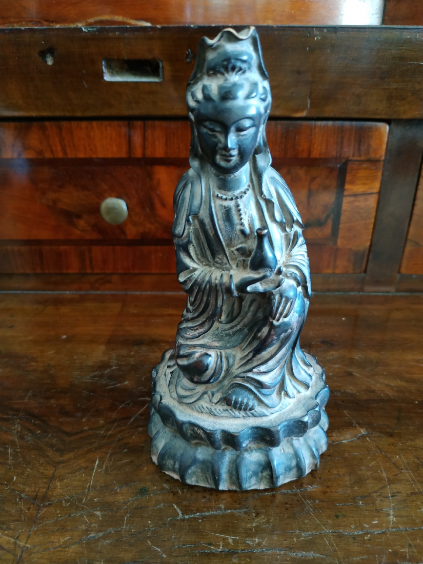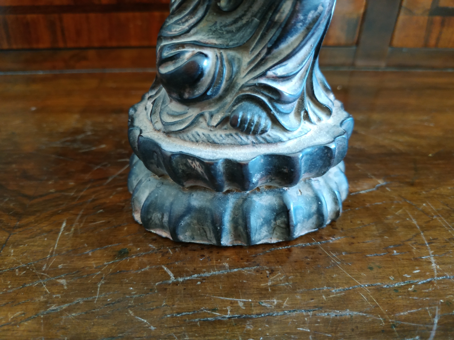 פסלון סיני ישן עשוי חומר יצוק, בדמות אלת הרחמים הבודהיסטית 'Guanyin', גובה: 14 ס"מ.