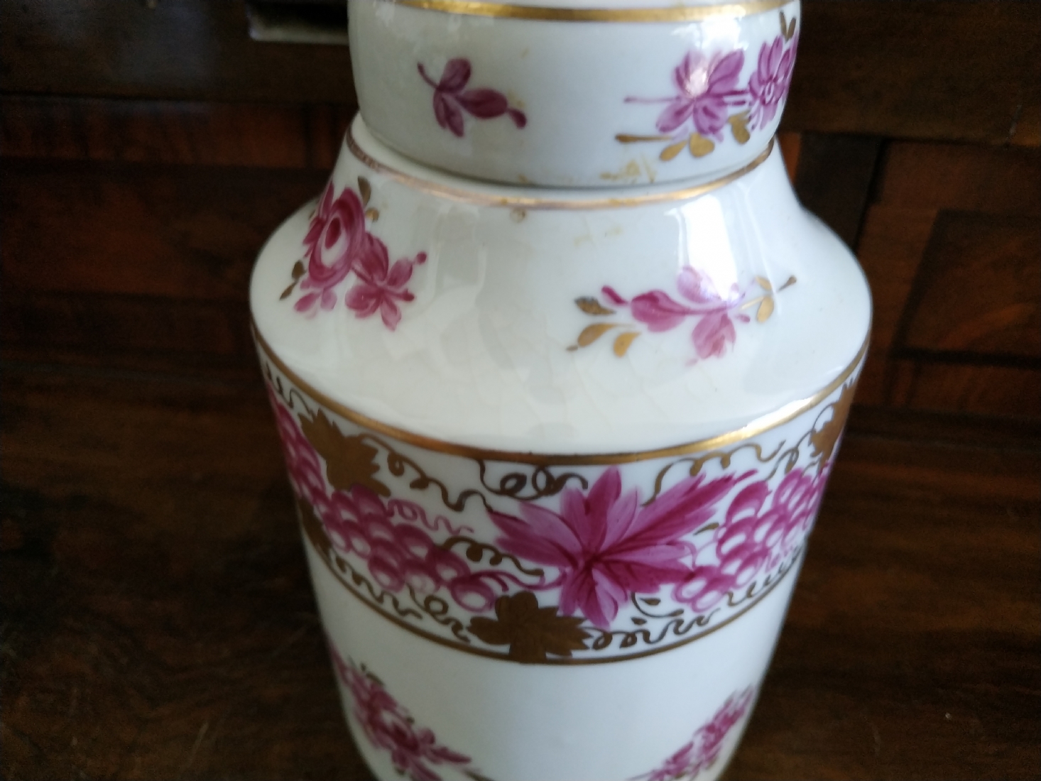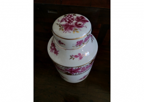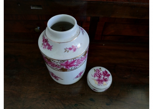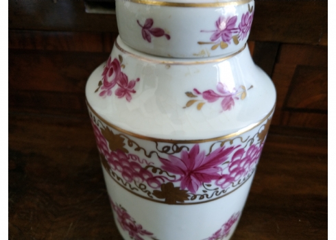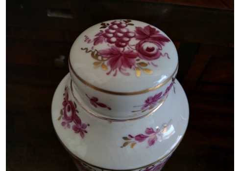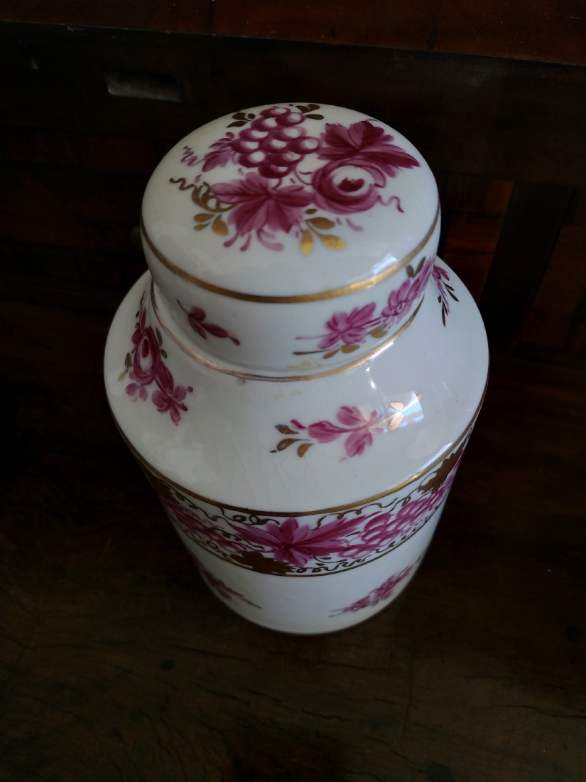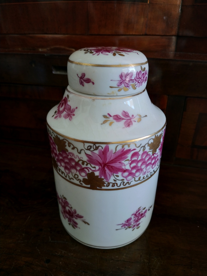 מיכל תה (Tea Caddy) ישן בסגנון 'צ'לסי' (Chelsea Porcelain) של המאה ה-18, עשוי פורצלן מעוטר ציורי יד באמייל סגול ובזהב, נושא חותמת מוזהבת בסגנון 'צ'לסי', גובה כולל מכסה: 16.5 ס"מ.