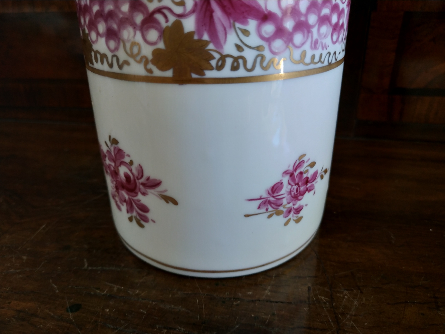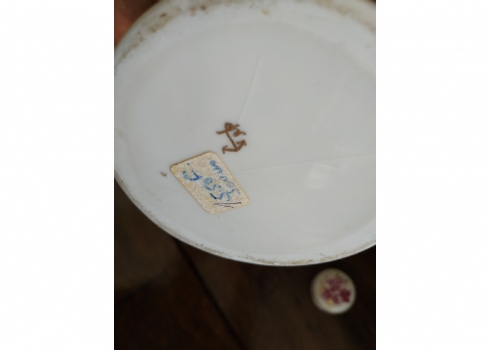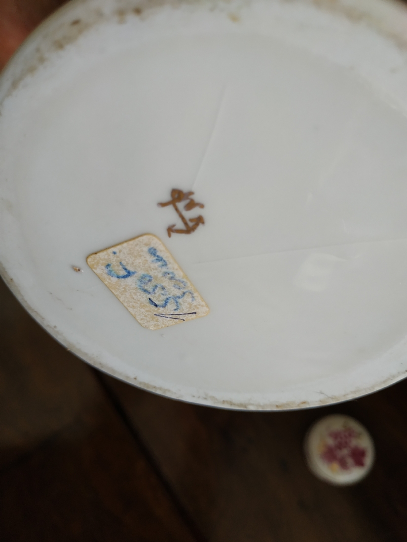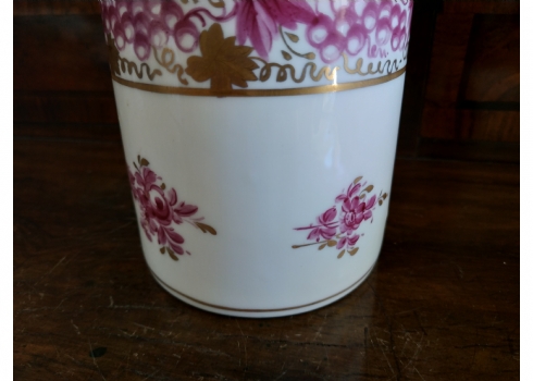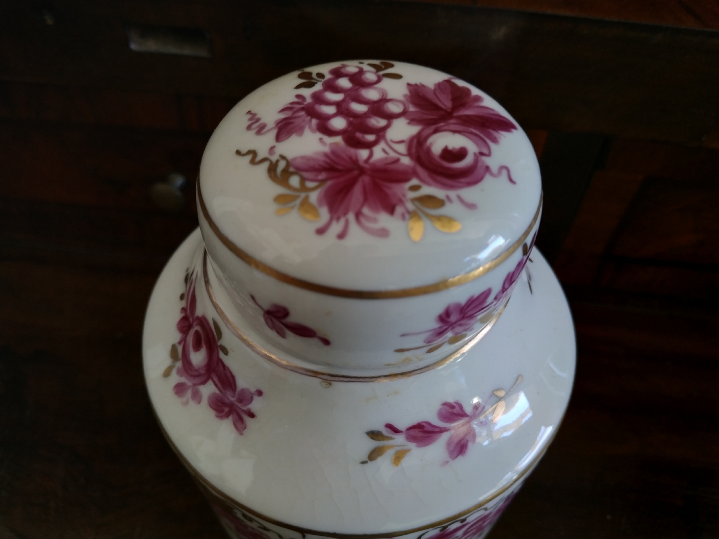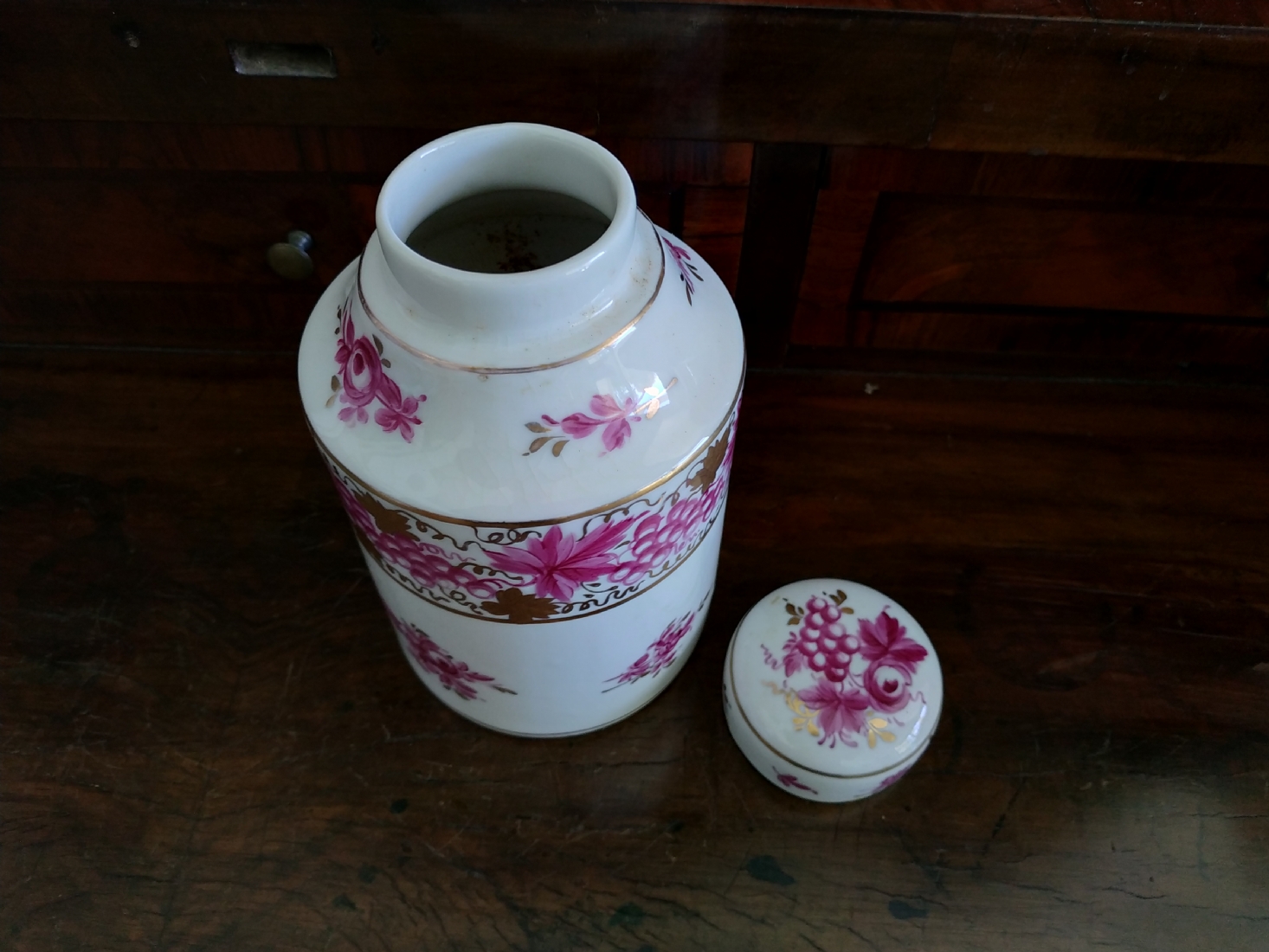 מיכל תה (Tea Caddy) ישן בסגנון 'צ'לסי' (Chelsea Porcelain) של המאה ה-18, עשוי פורצלן מעוטר ציורי יד באמייל סגול ובזהב, נושא חותמת מוזהבת בסגנון 'צ'לסי', גובה כולל מכסה: 16.5 ס"מ.