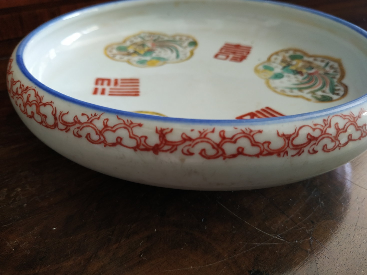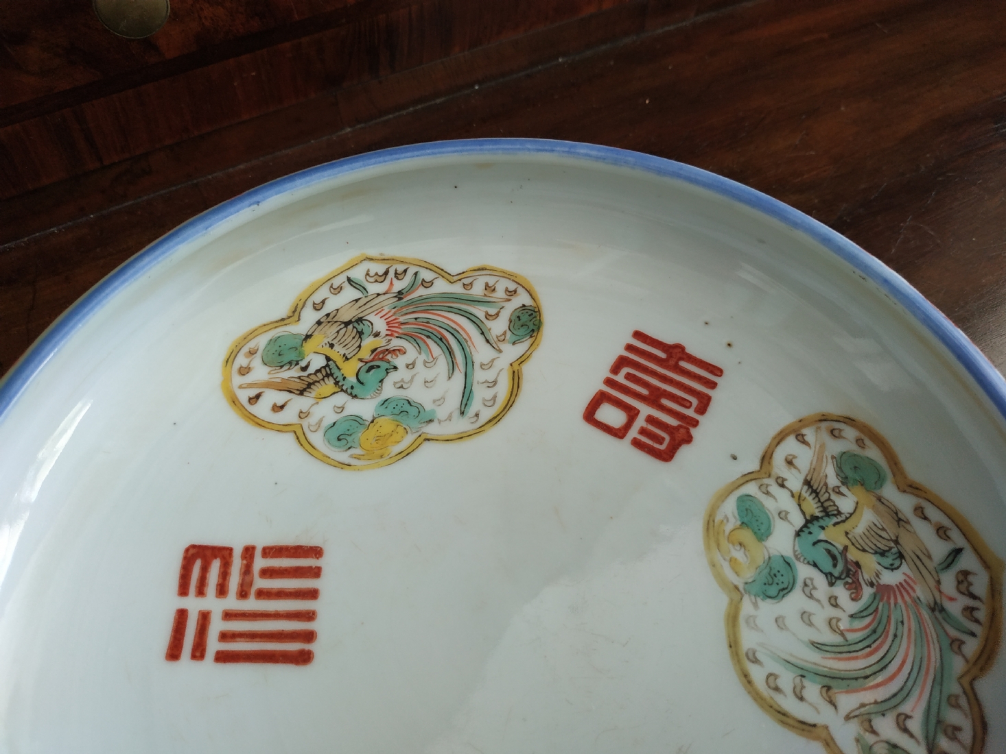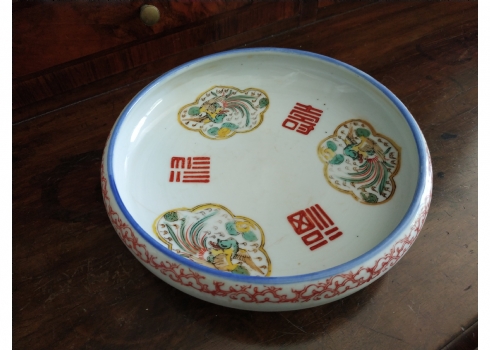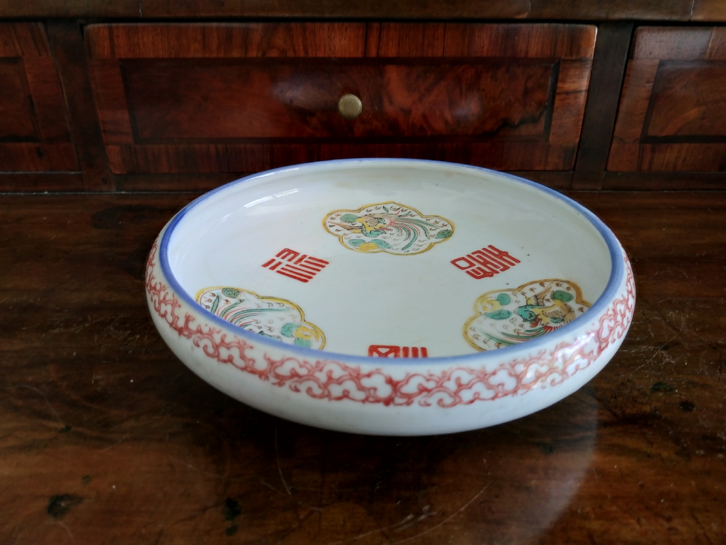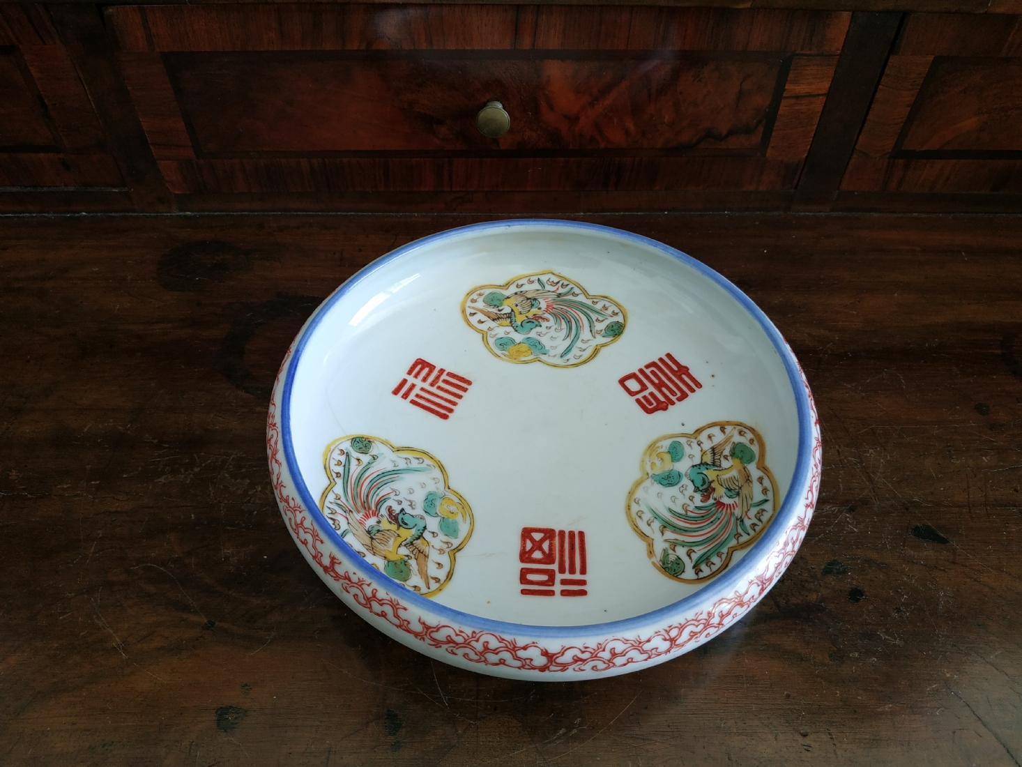 כלי חרסינה סיני מעוטר ציורי יד באמייל, חתום, קוטר: 18 ס"מ.