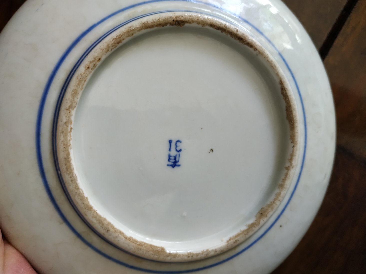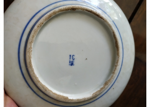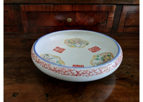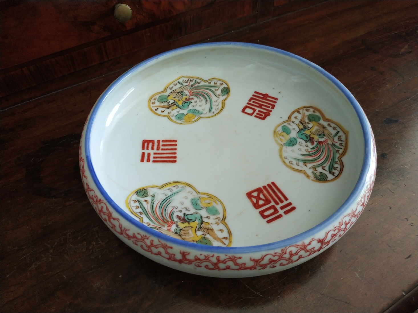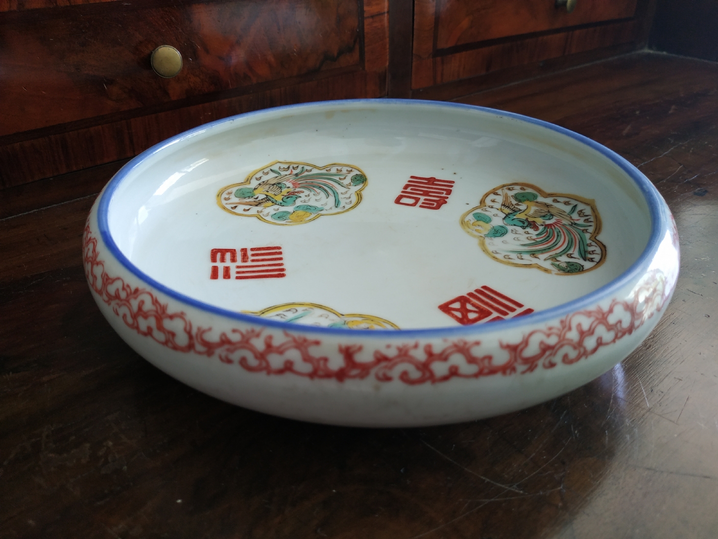כלי חרסינה סיני מעוטר ציורי יד באמייל, חתום, קוטר: 18 ס"מ.