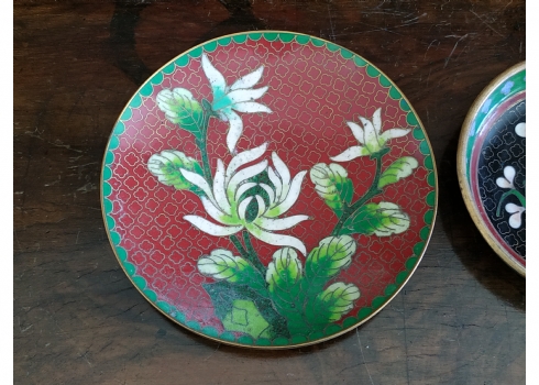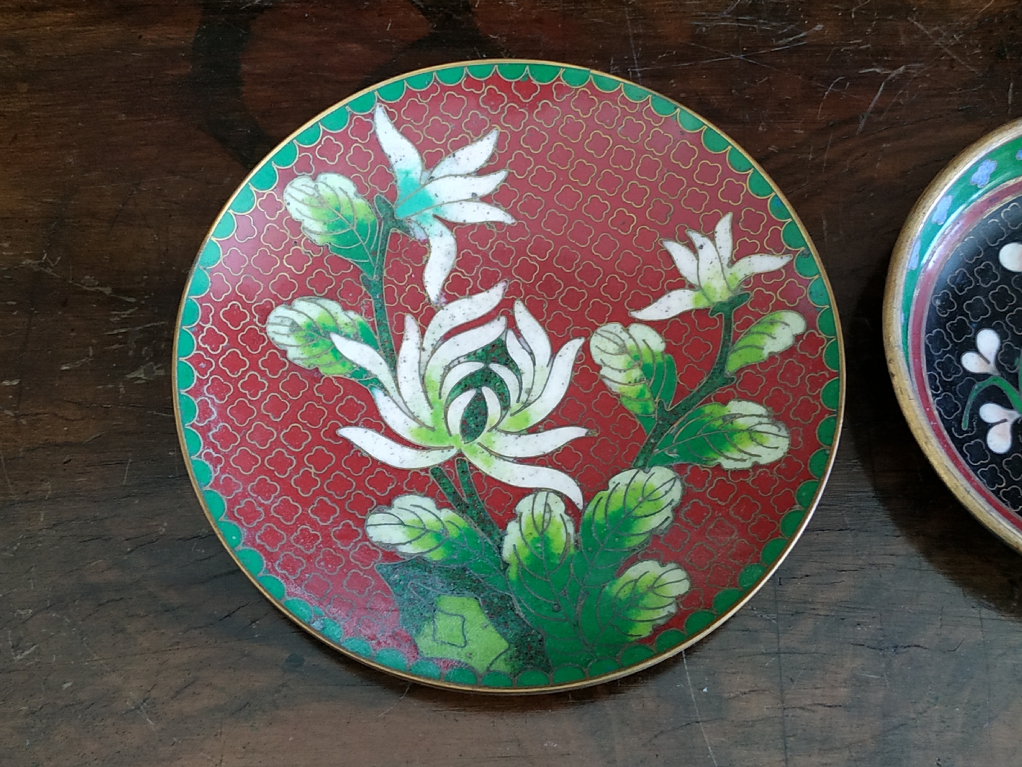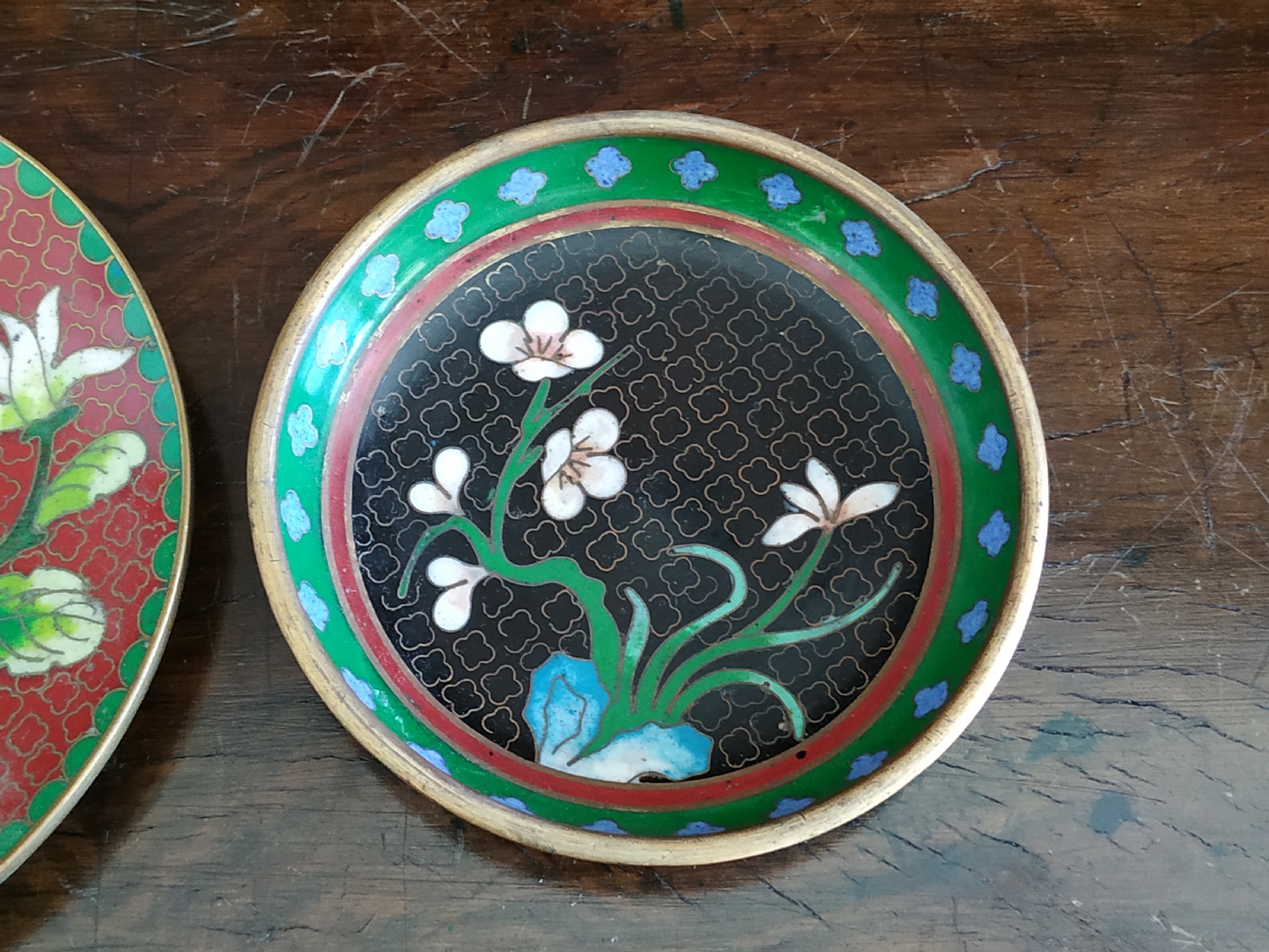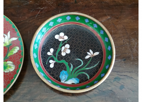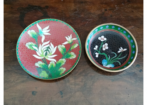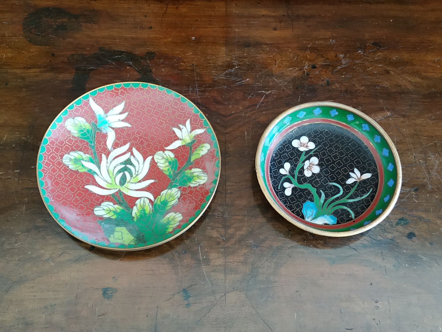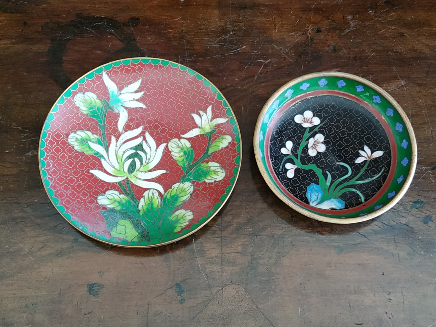 לוט של שתי צלוחיות קלאזונה (Cloisonne) סיניות ישנות, עשויות מתכת ואמייל, קוטר בהתאמה: 9 ס"מ, 11.5 ס"מ.