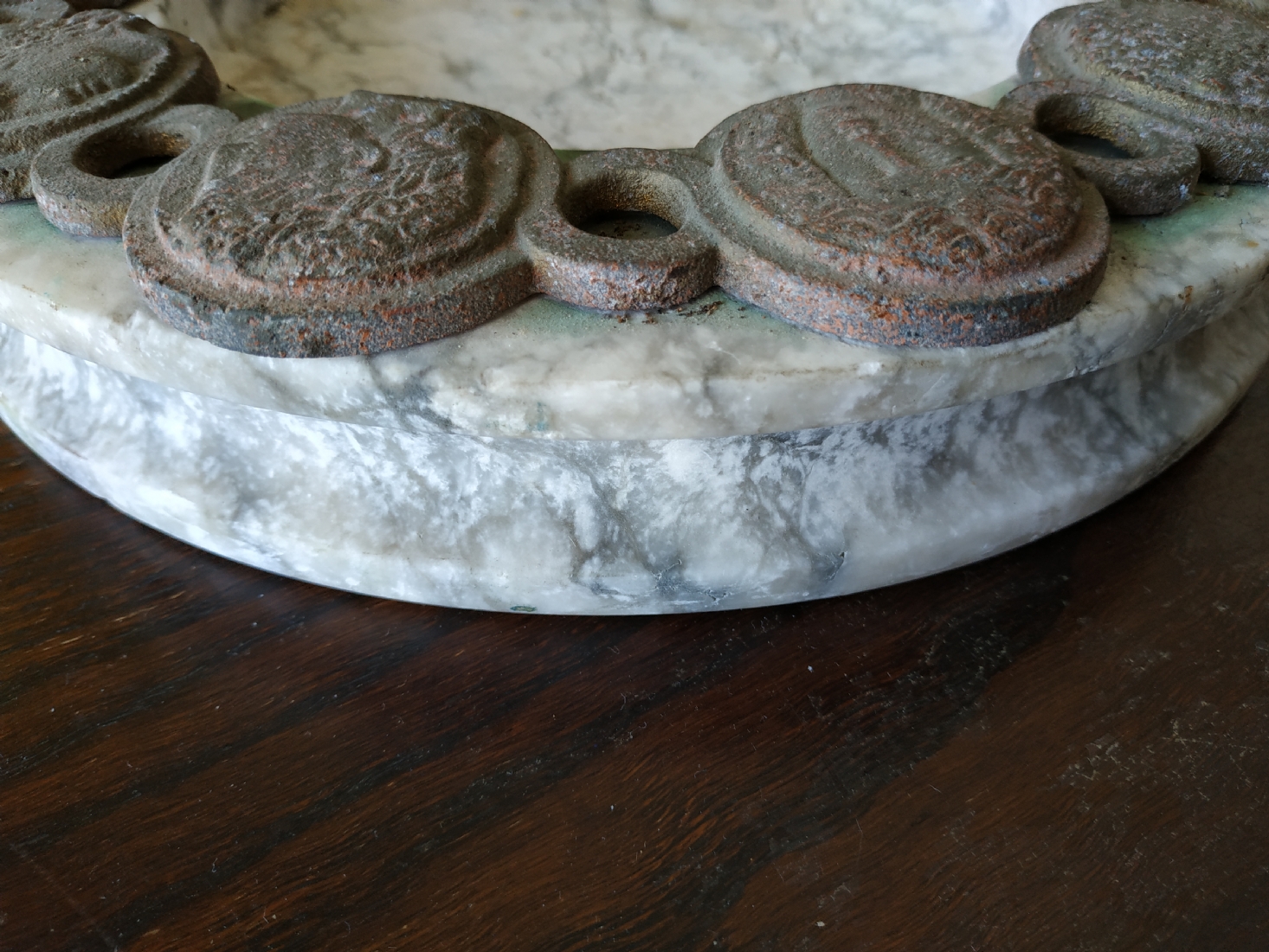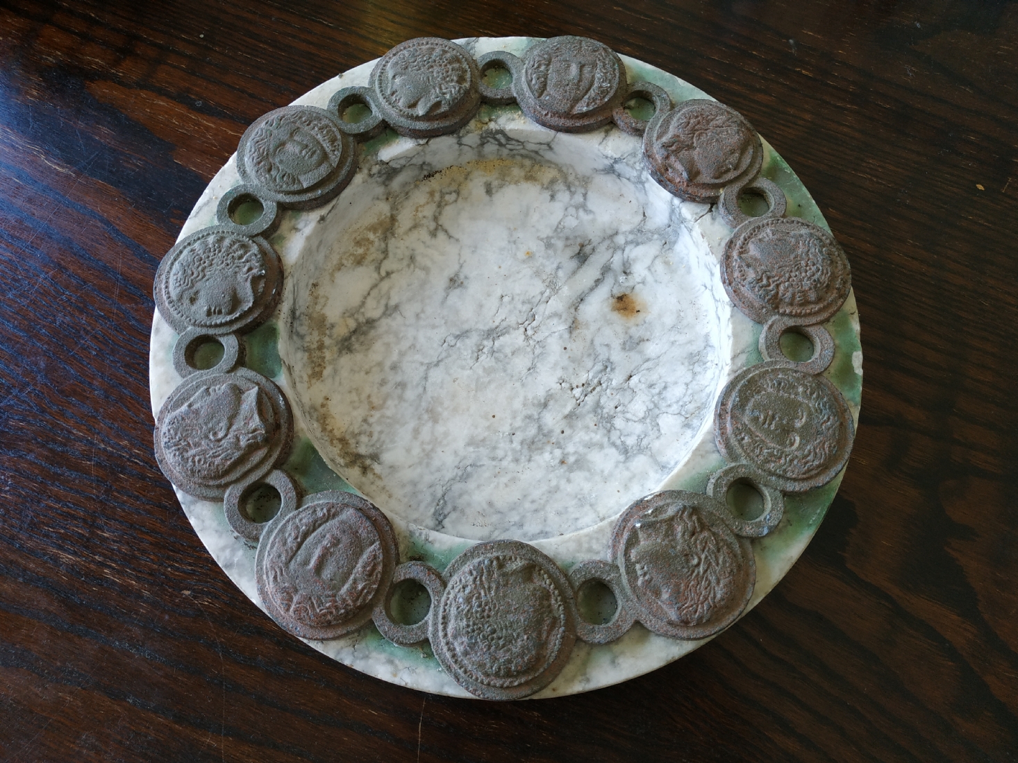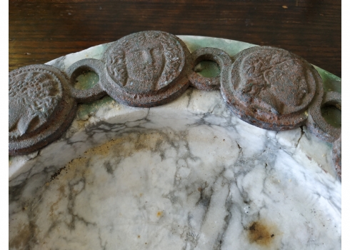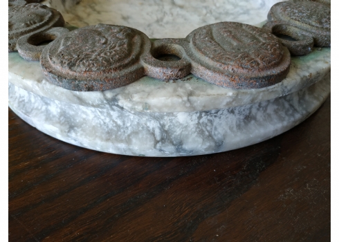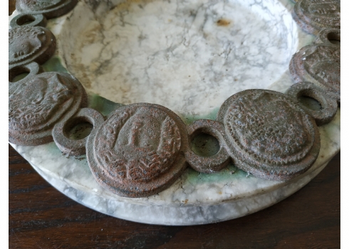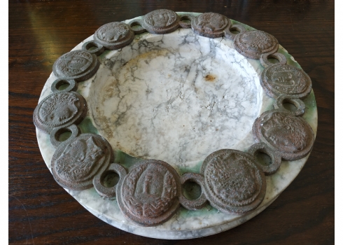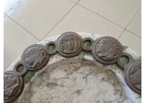 כלי עגול גדול ומאסיבי עשוי שיש, מעוטר בחלקו העליון מדליוני ברונזה בסגנון ניאו קלאסי, גובה: 4 ס"מ, קוטר: 28 ס"מ.