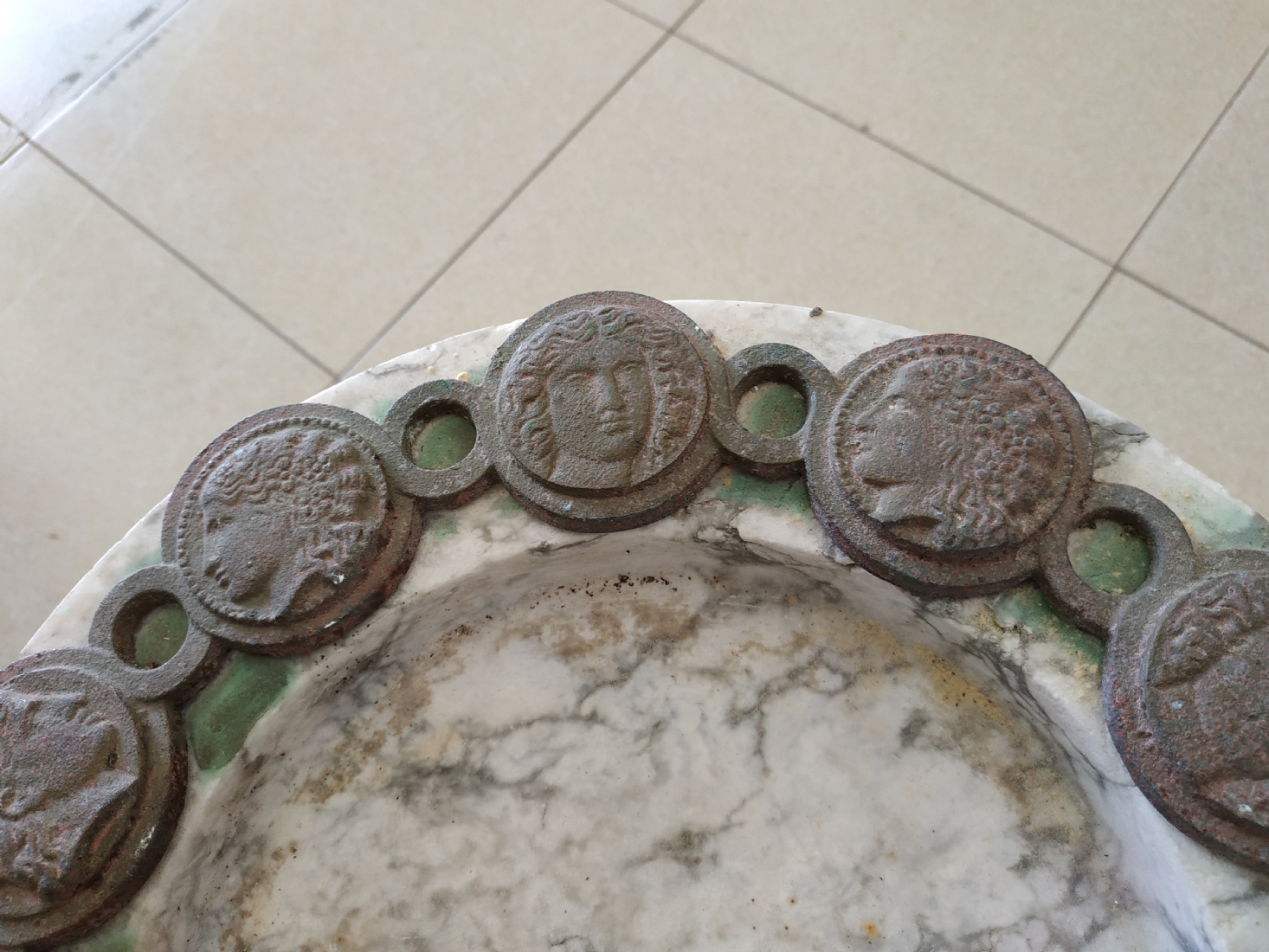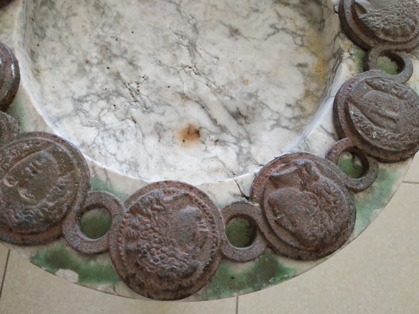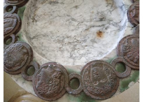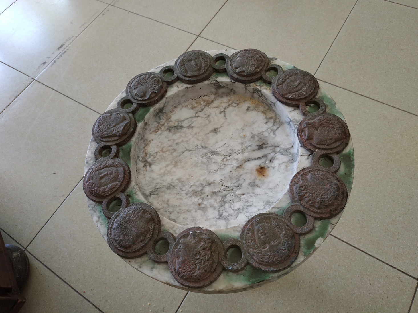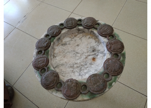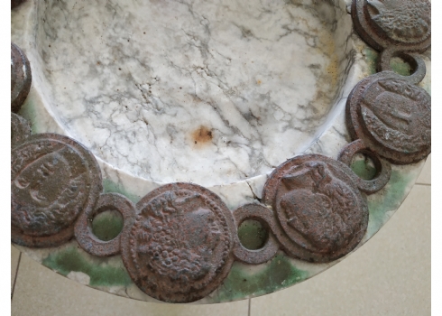 כלי עגול גדול ומאסיבי עשוי שיש, מעוטר בחלקו העליון מדליוני ברונזה