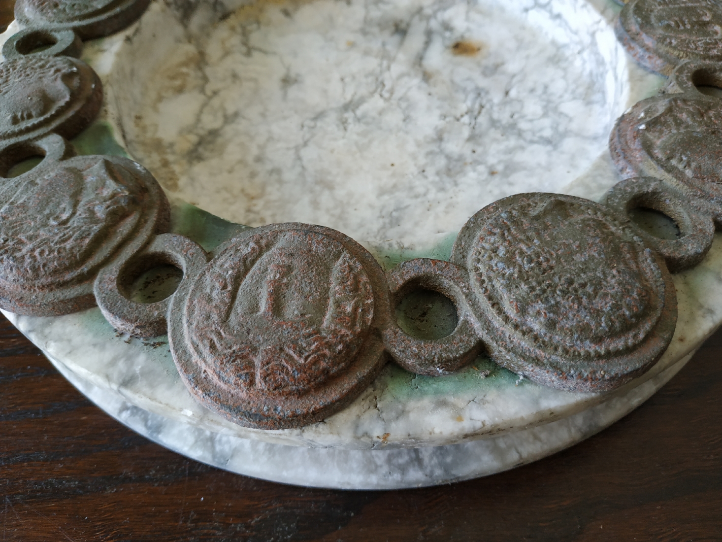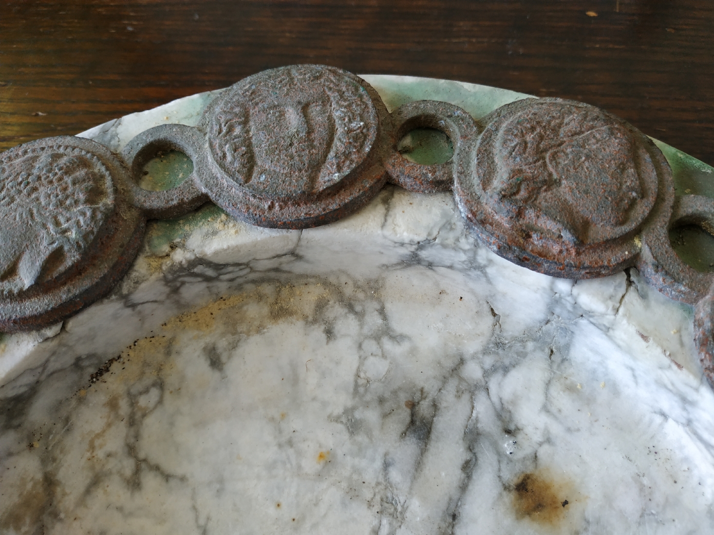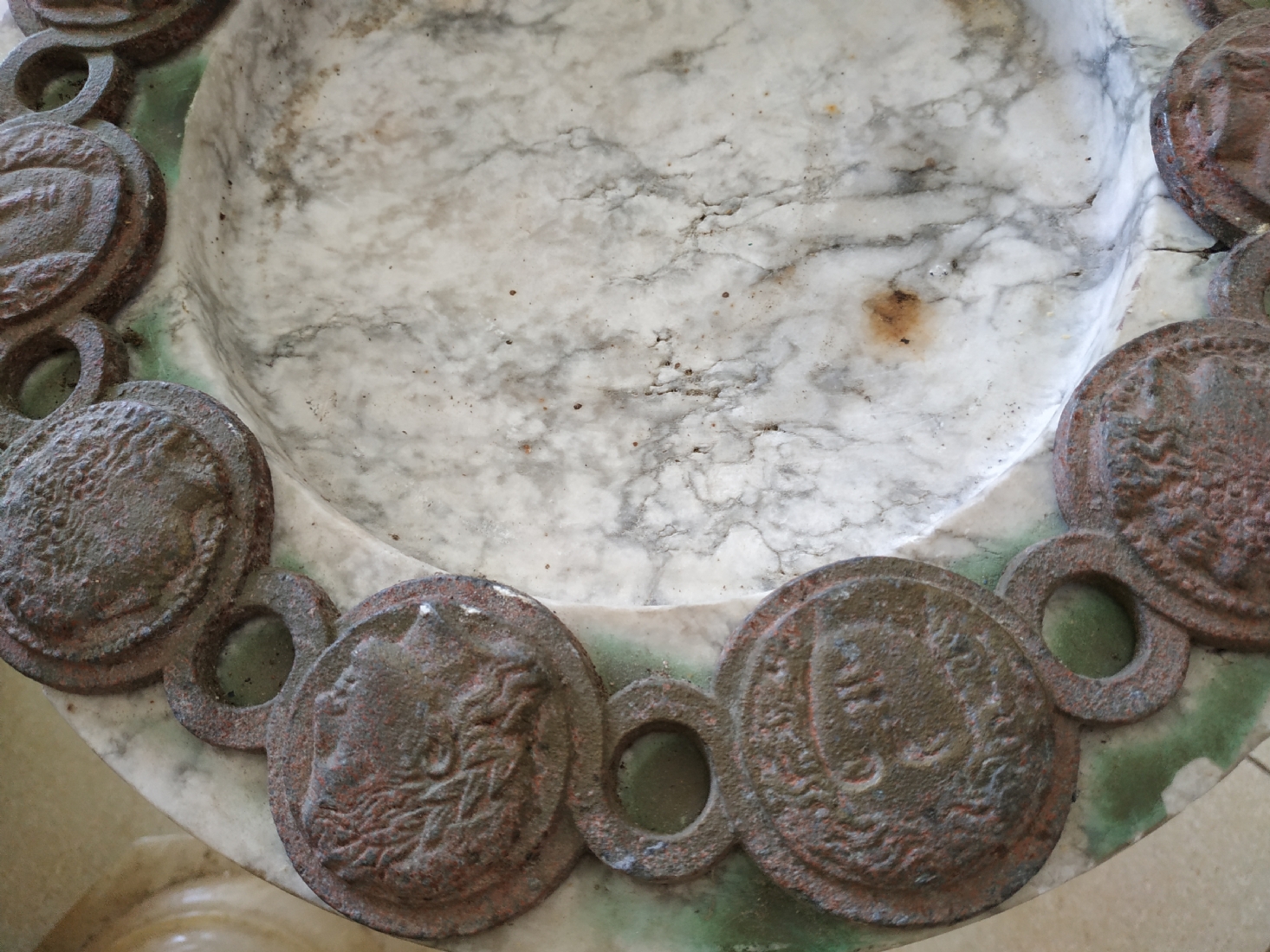 כלי עגול גדול ומאסיבי עשוי שיש, מעוטר בחלקו העליון מדליוני ברונזה
