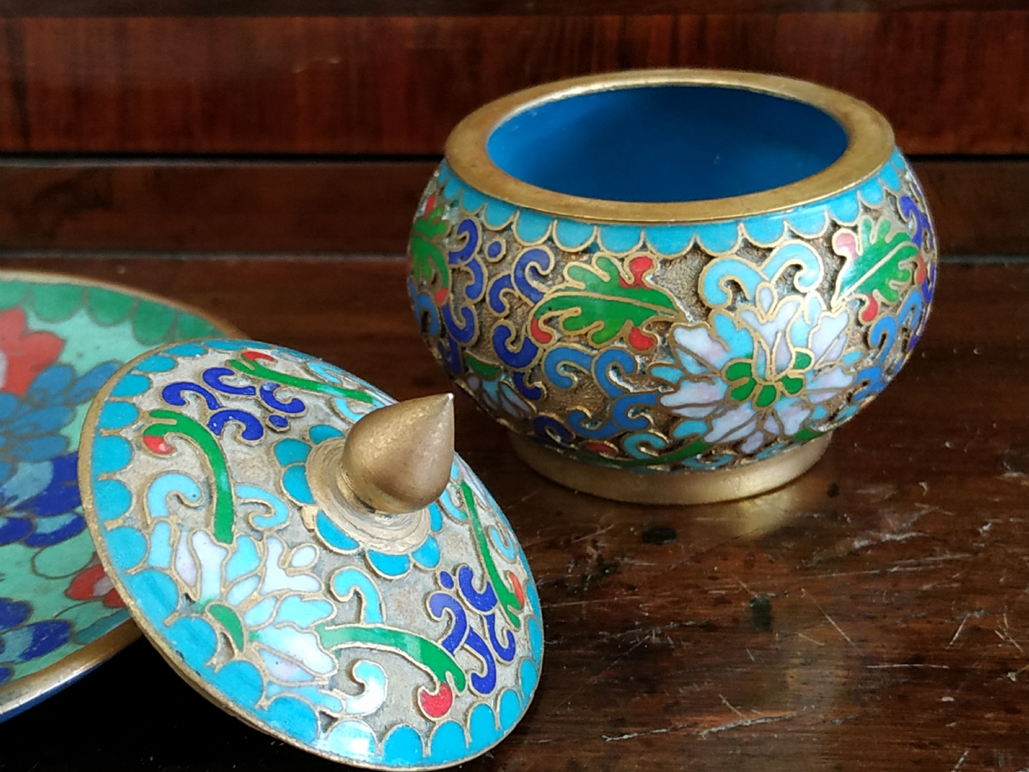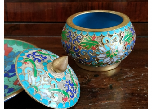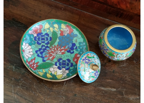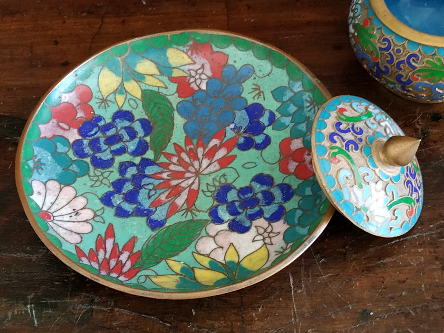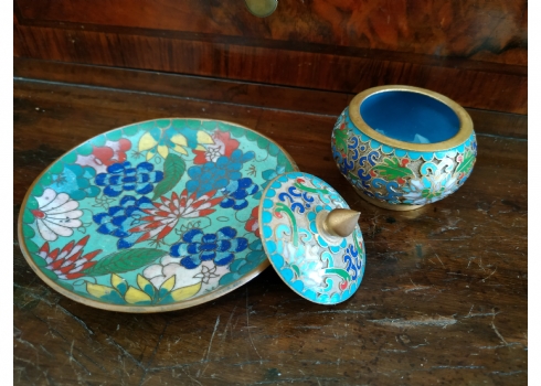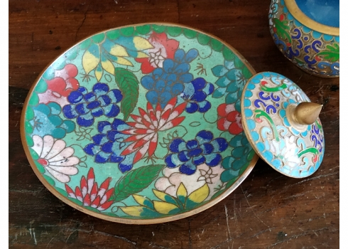 לוט של שני פרטי נוי סינים קטנים, עשויים מתכת ומעוטרים באמייל בעבודת קלואזונה (Cloisonné), קוטר הצלוחית: 9.5 ס,מ.