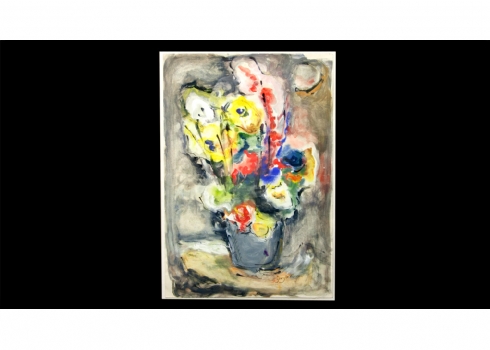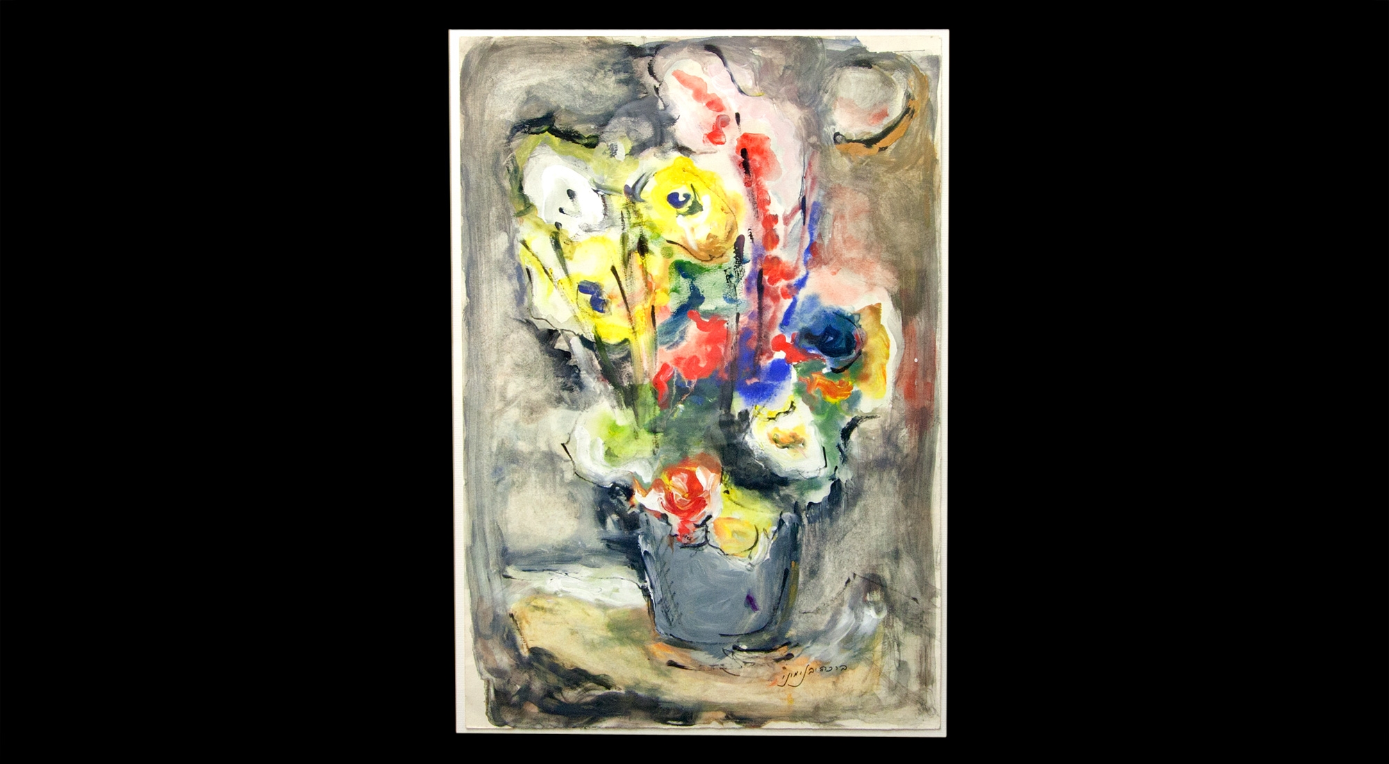מספר הפריט בקטלוג 366ברכה בנימיני, (1891-1993) - 'פרחים בכד אפור', גואש ואקוורל על נייר, חתום, מידות 50X35 ס"מ.