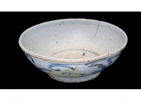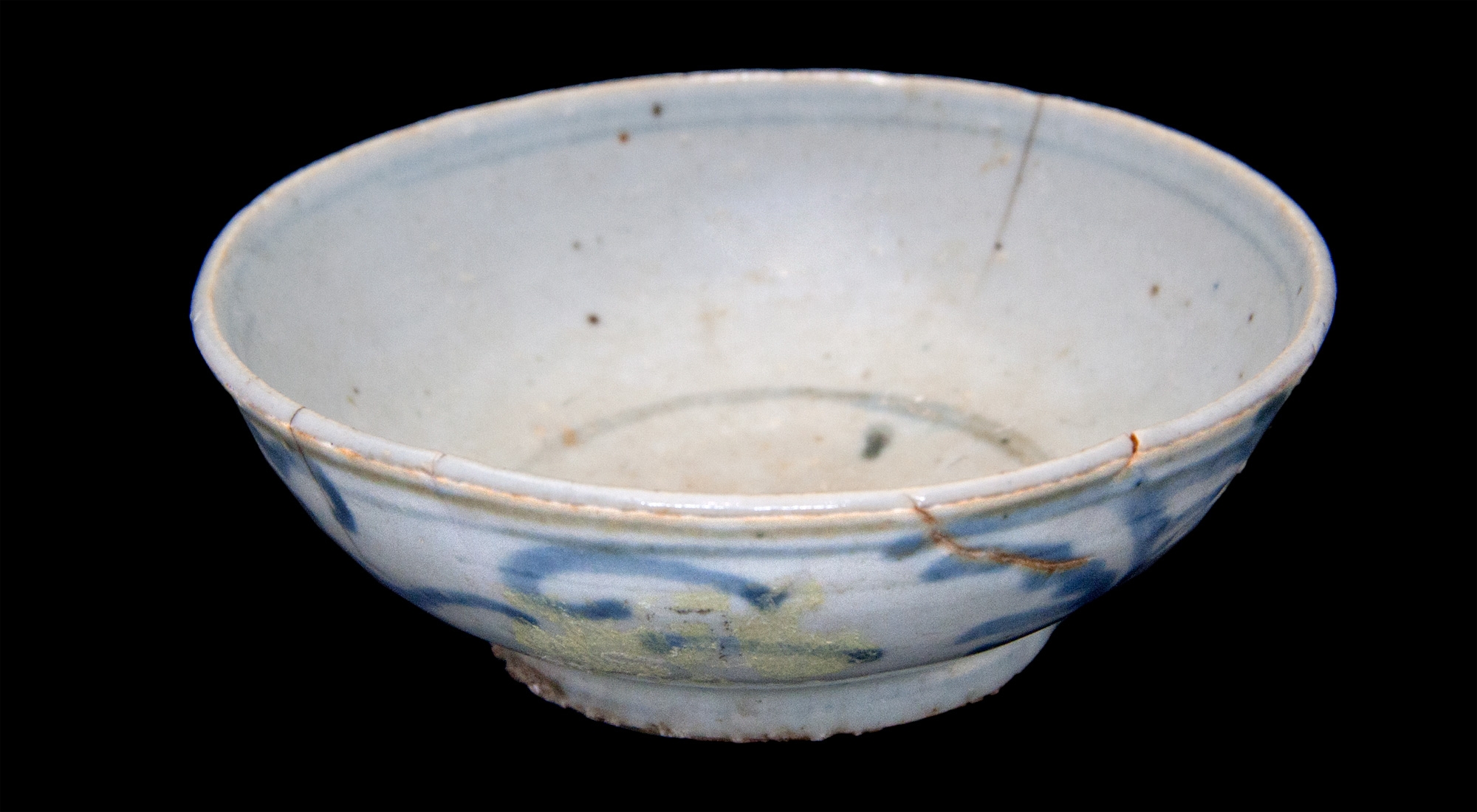 קערה אסייתית ישנה מחרס, מעוטרת עיטורי יד בכחול קובלט, קוטר: 12.5 ס"מ.