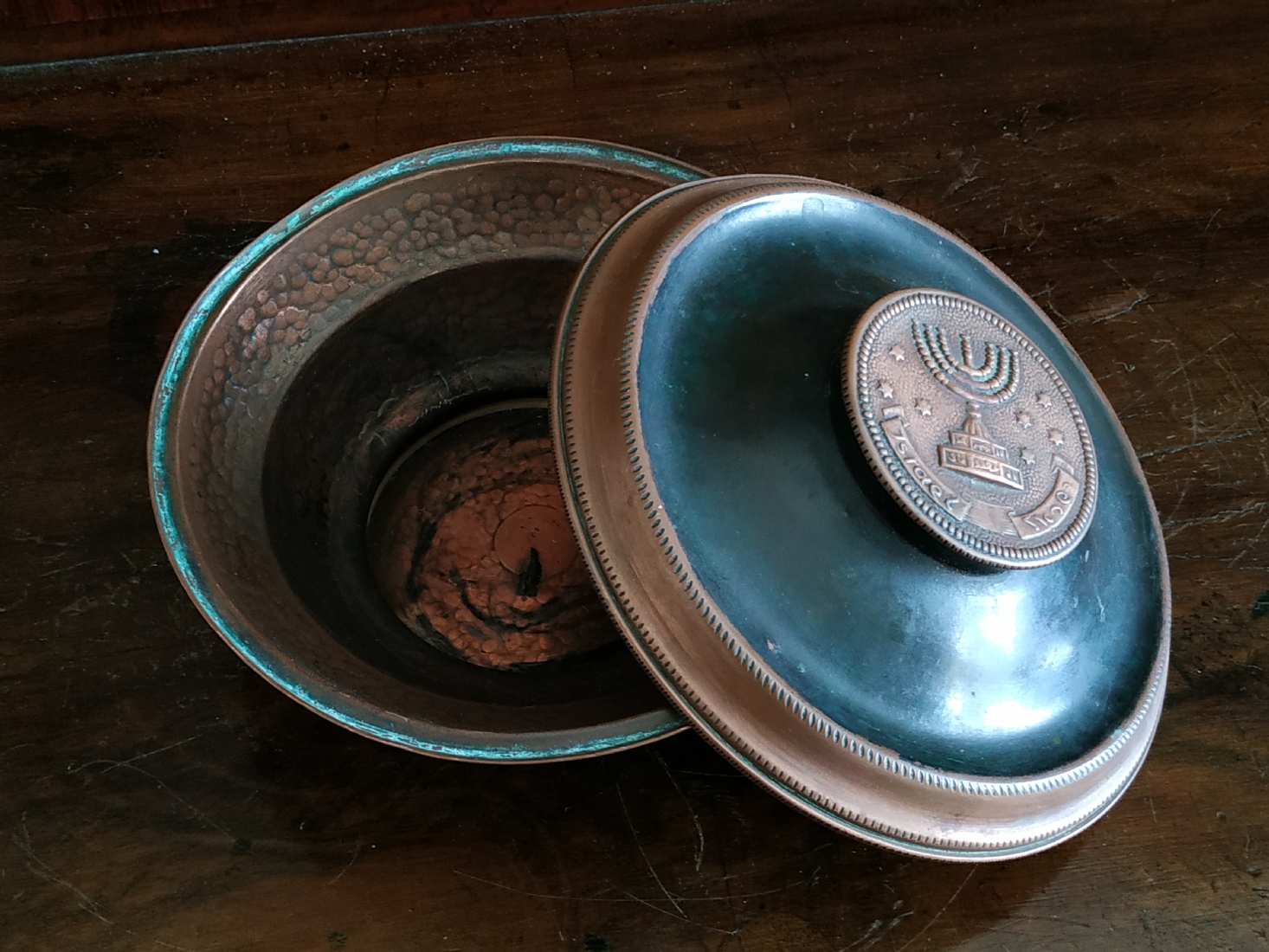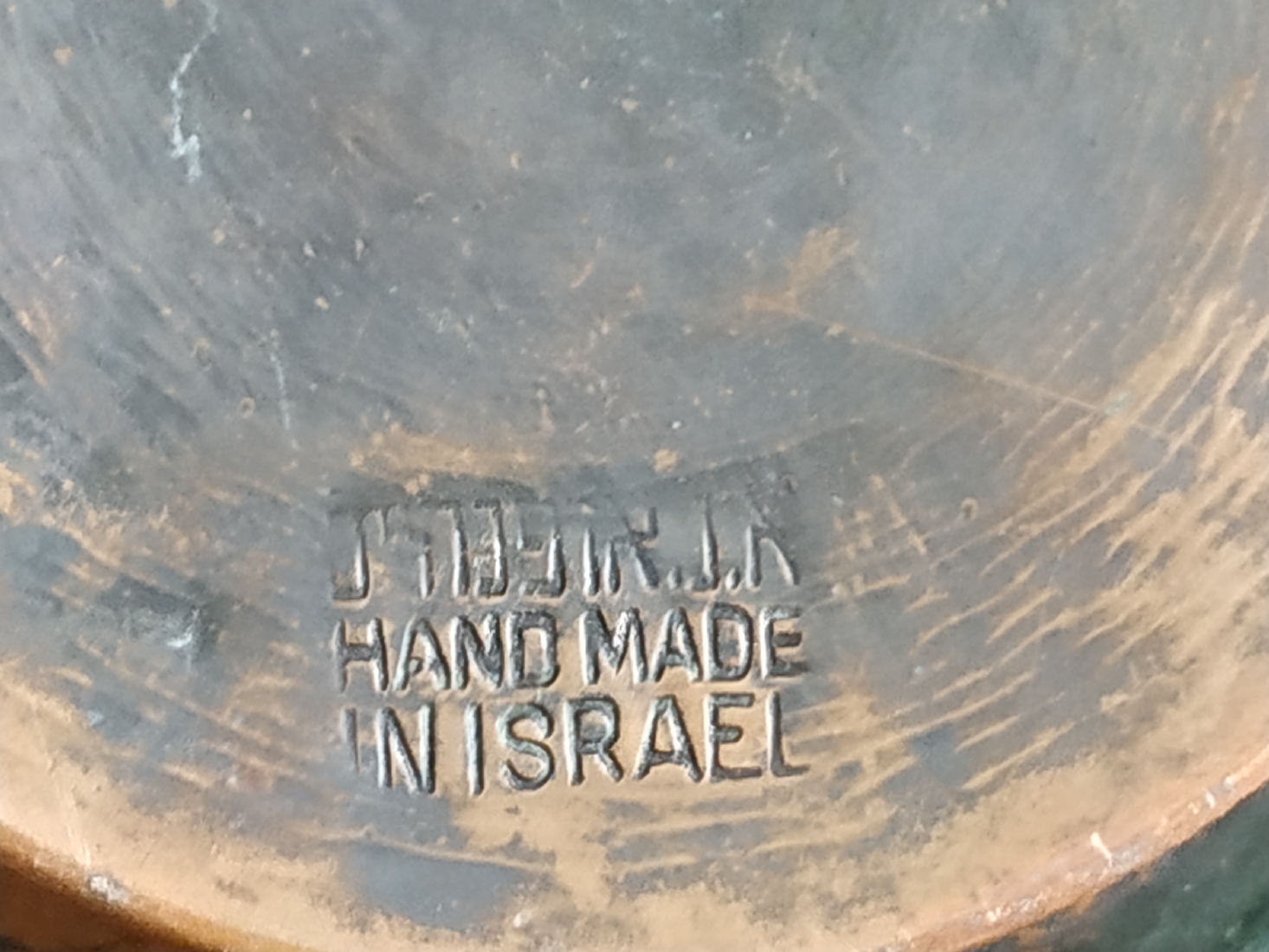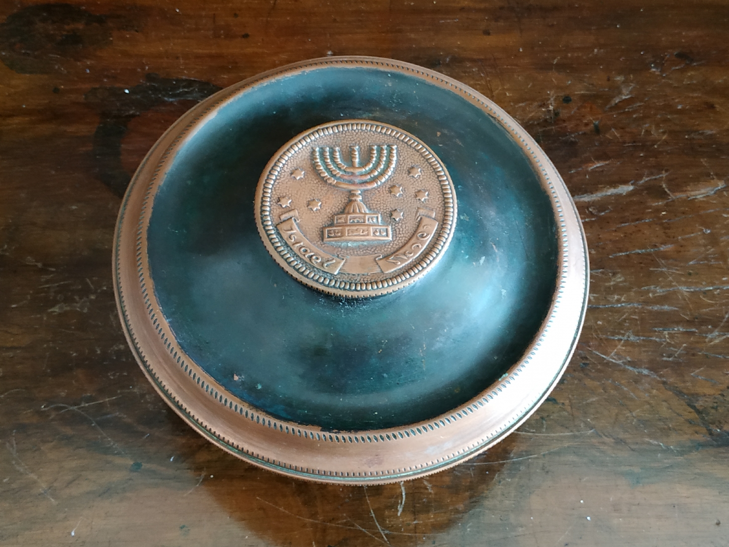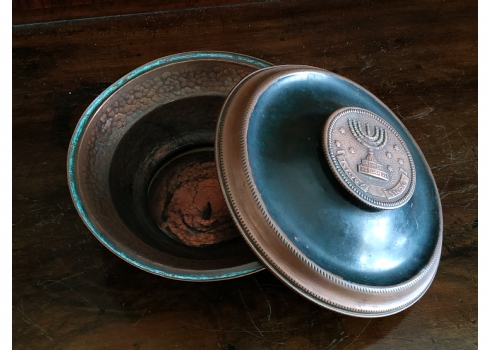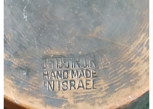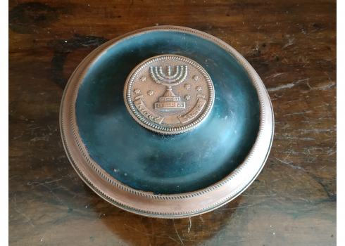 מספר הפריט בקטלוג 189לאספני ישראליאנה: כלי מתכת ישראלי ישן ומכסה תואם, מתוצרת: ('Oppenheim'), חתום : 'א.נ. אופנהיים', Made in Israel, עשוי נחושת מרוקעת, קוטר: 13 ס"מ