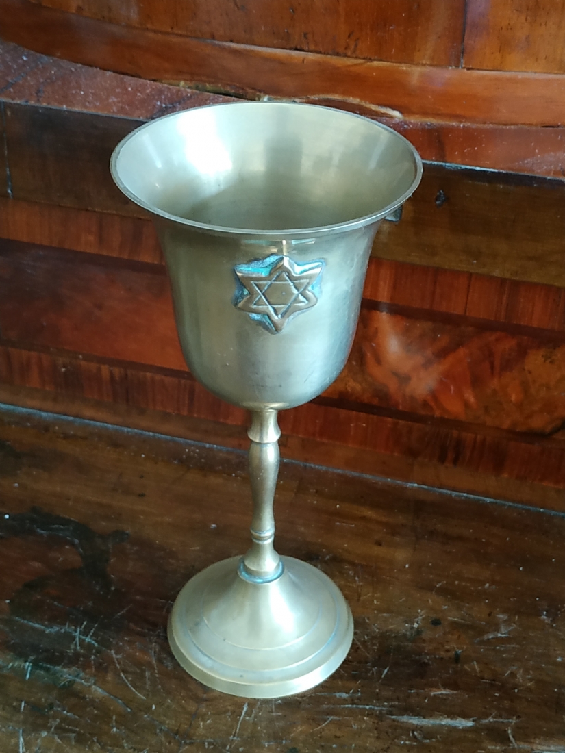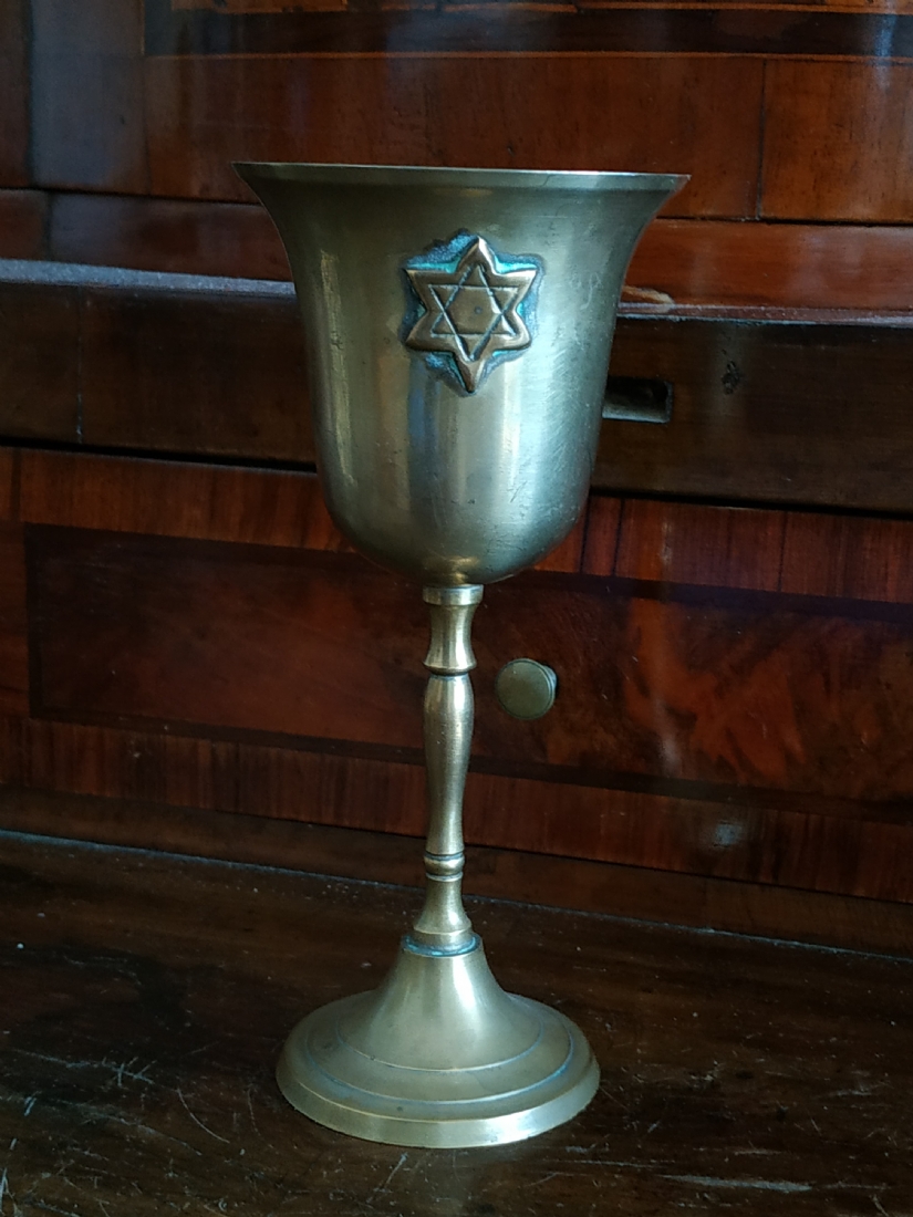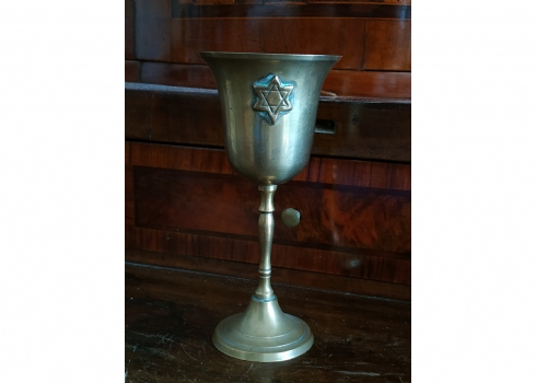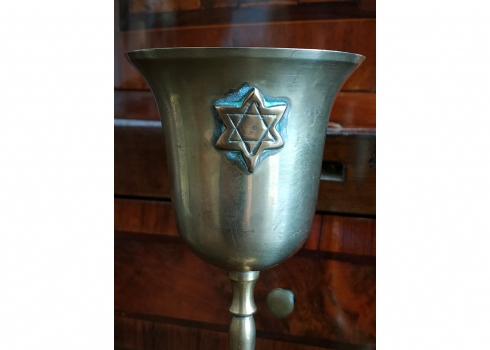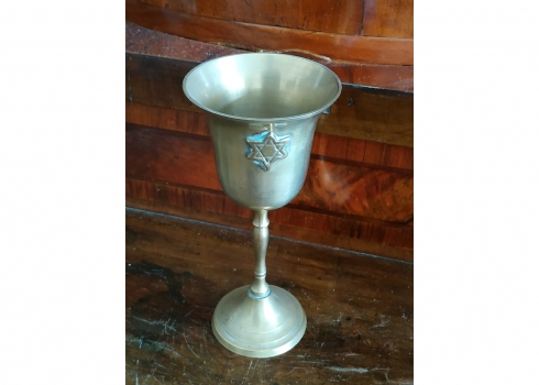 גביע קידוש ישן עשוי פליז יצוק ומעוטר בחזיתו במגן דוד, גובה: 17 ס"מ.