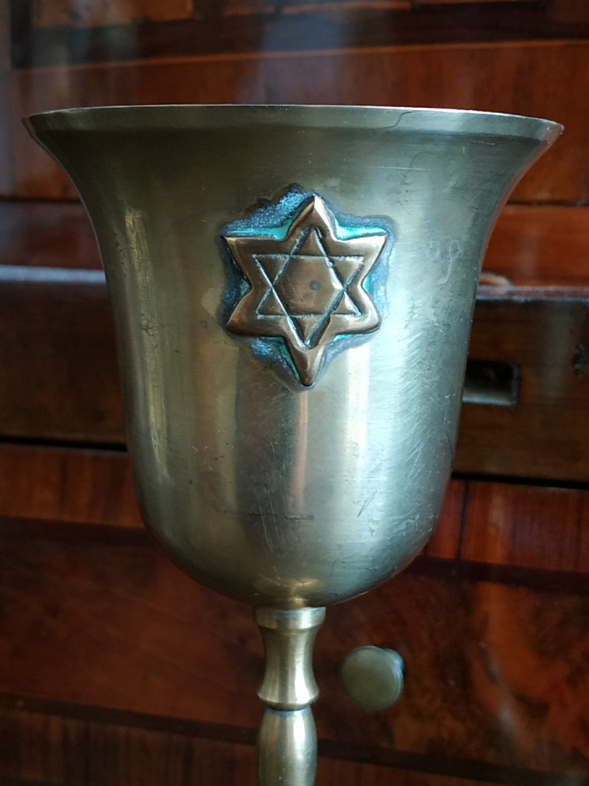 גביע קידוש ישן עשוי פליז יצוק ומעוטר בחזיתו במגן דוד