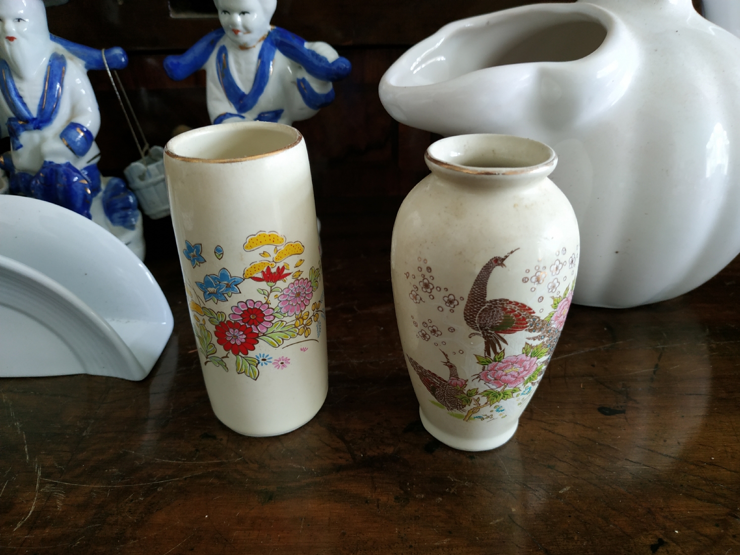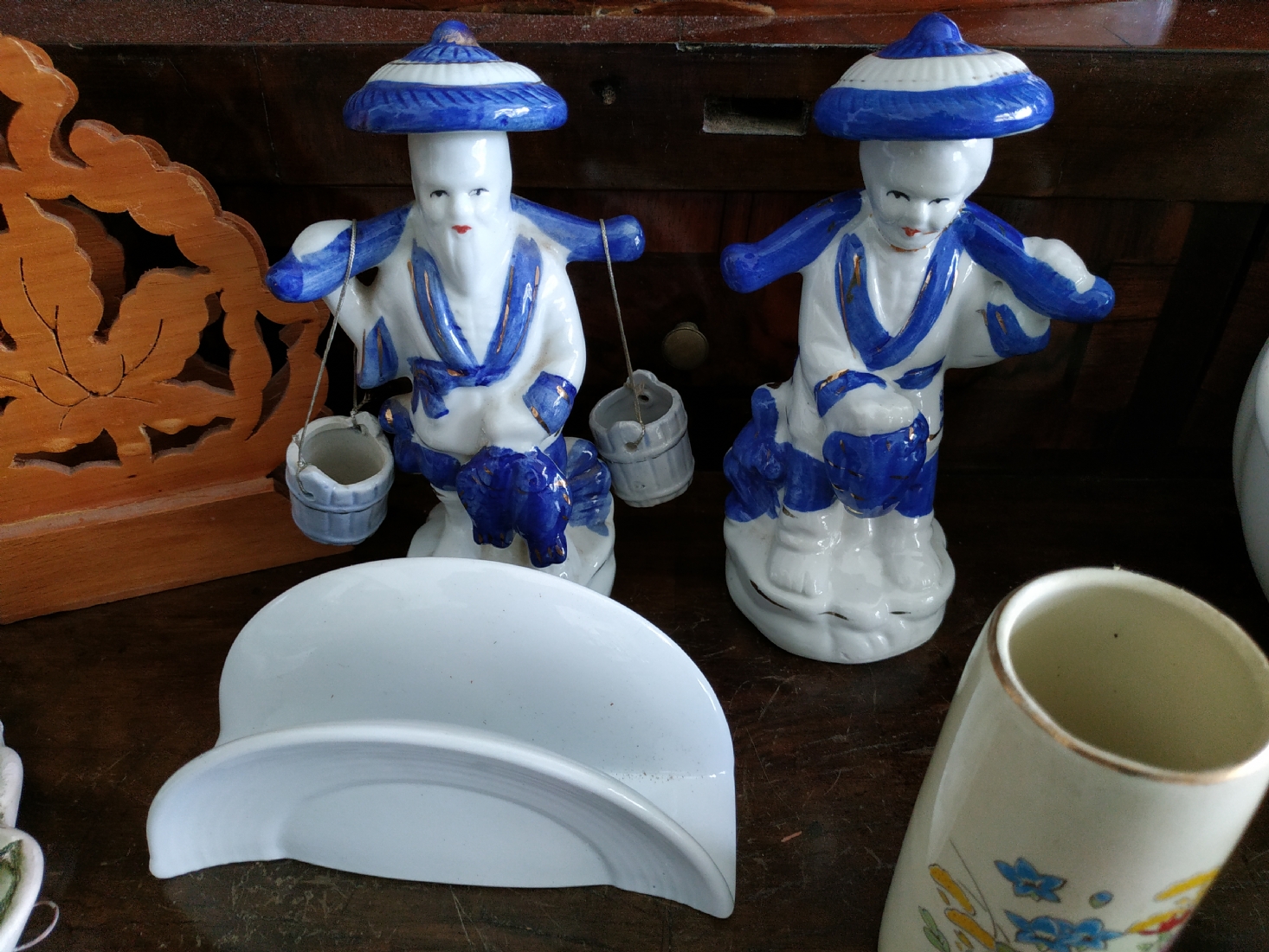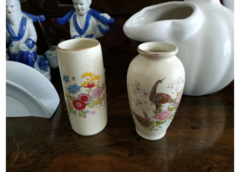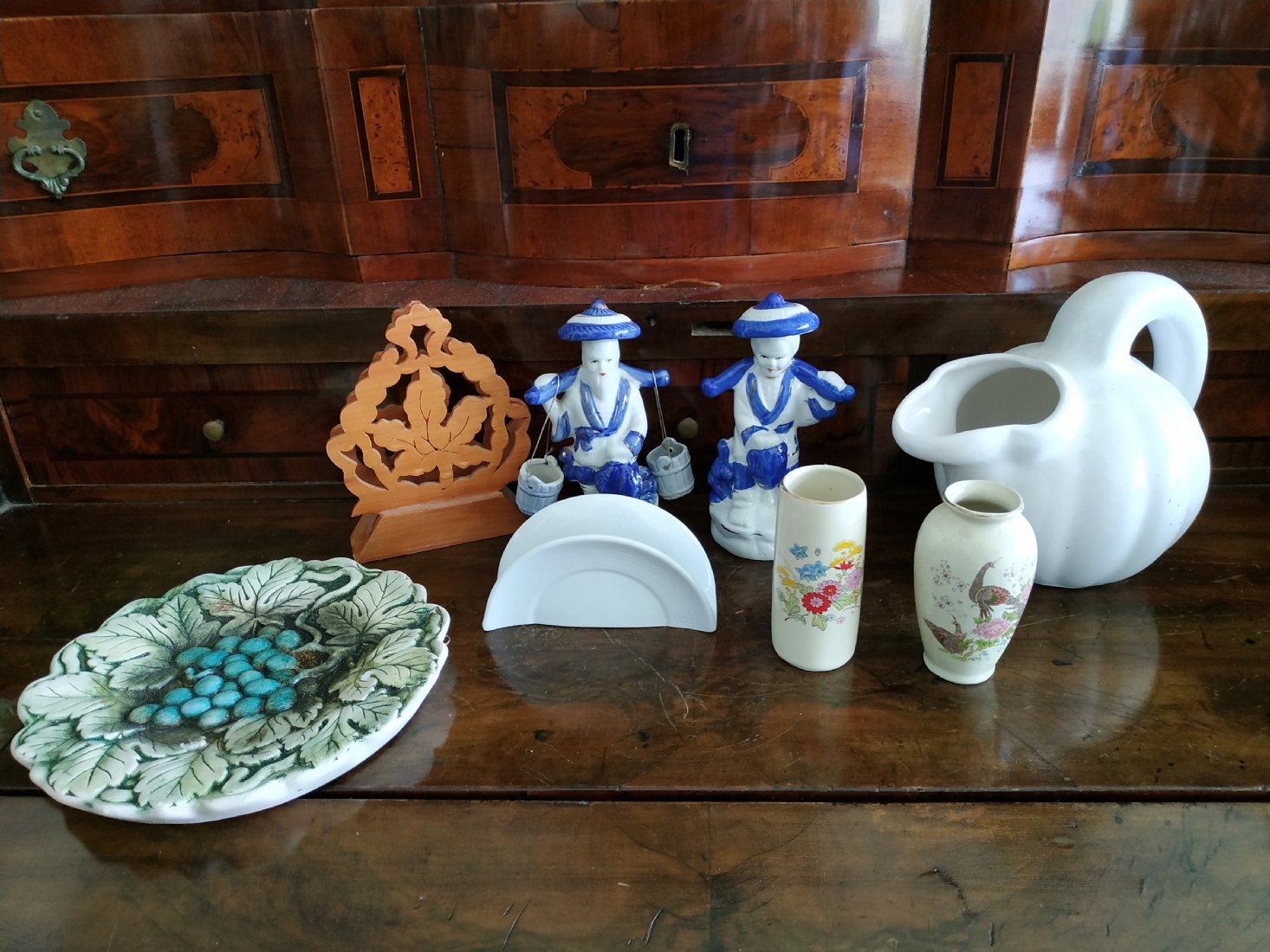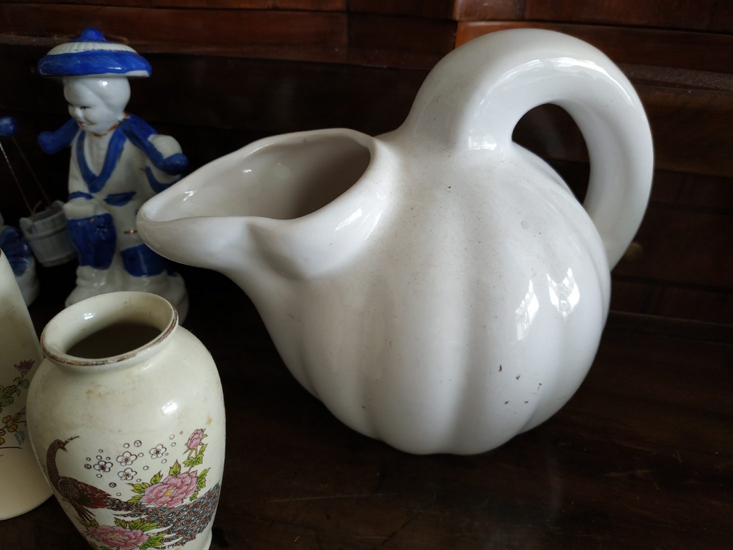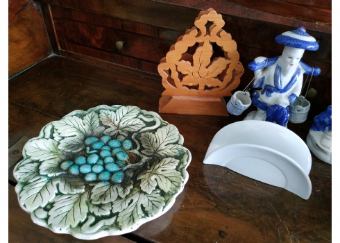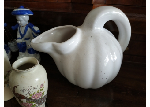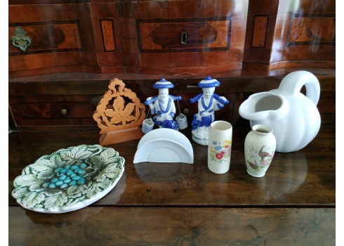 לוט של 8 חפצים ישנים עשויים קרמיקה, עץ וחומר יצוק, גובה הקנקן הלבן: 17 ס"מ.