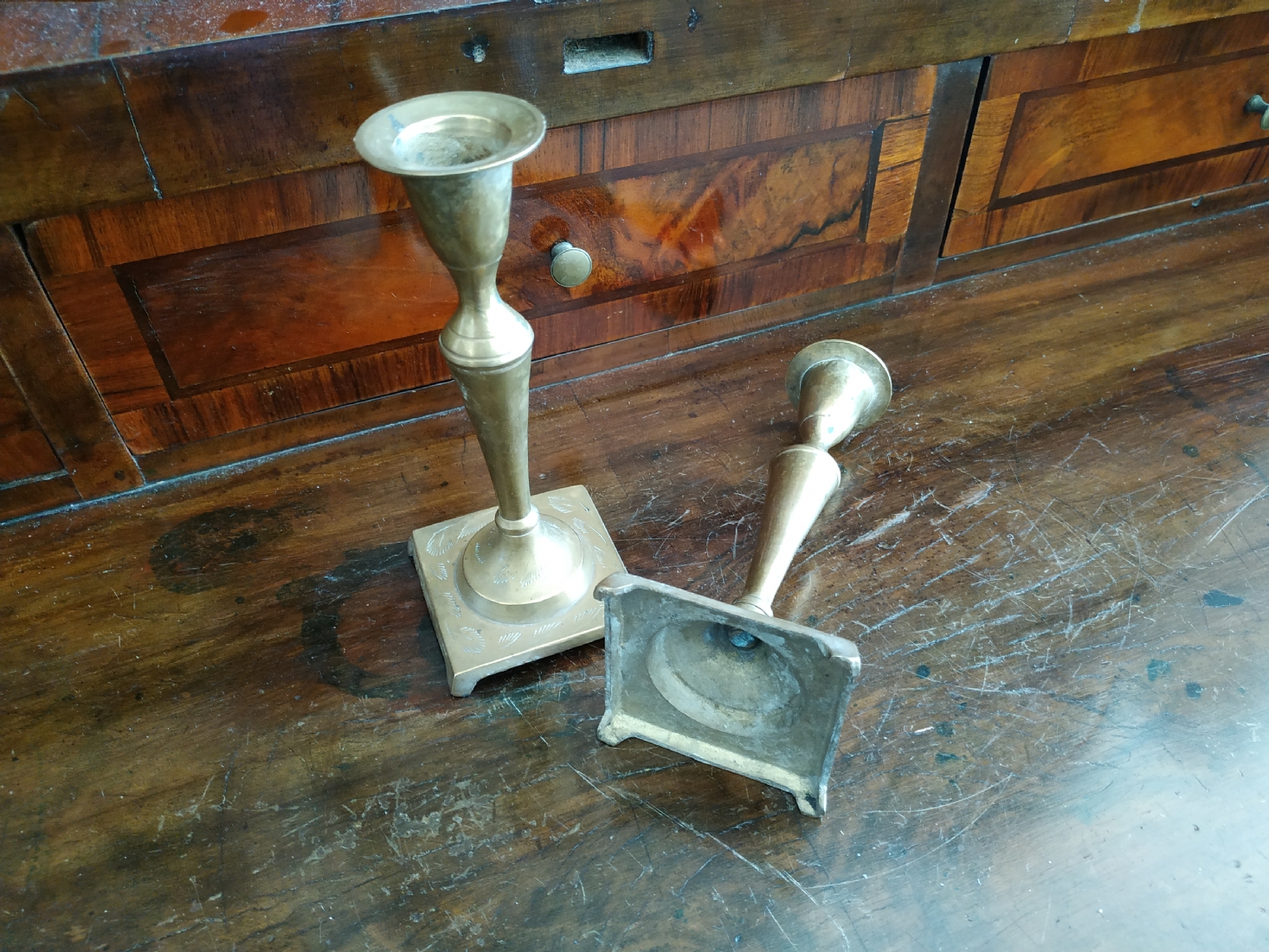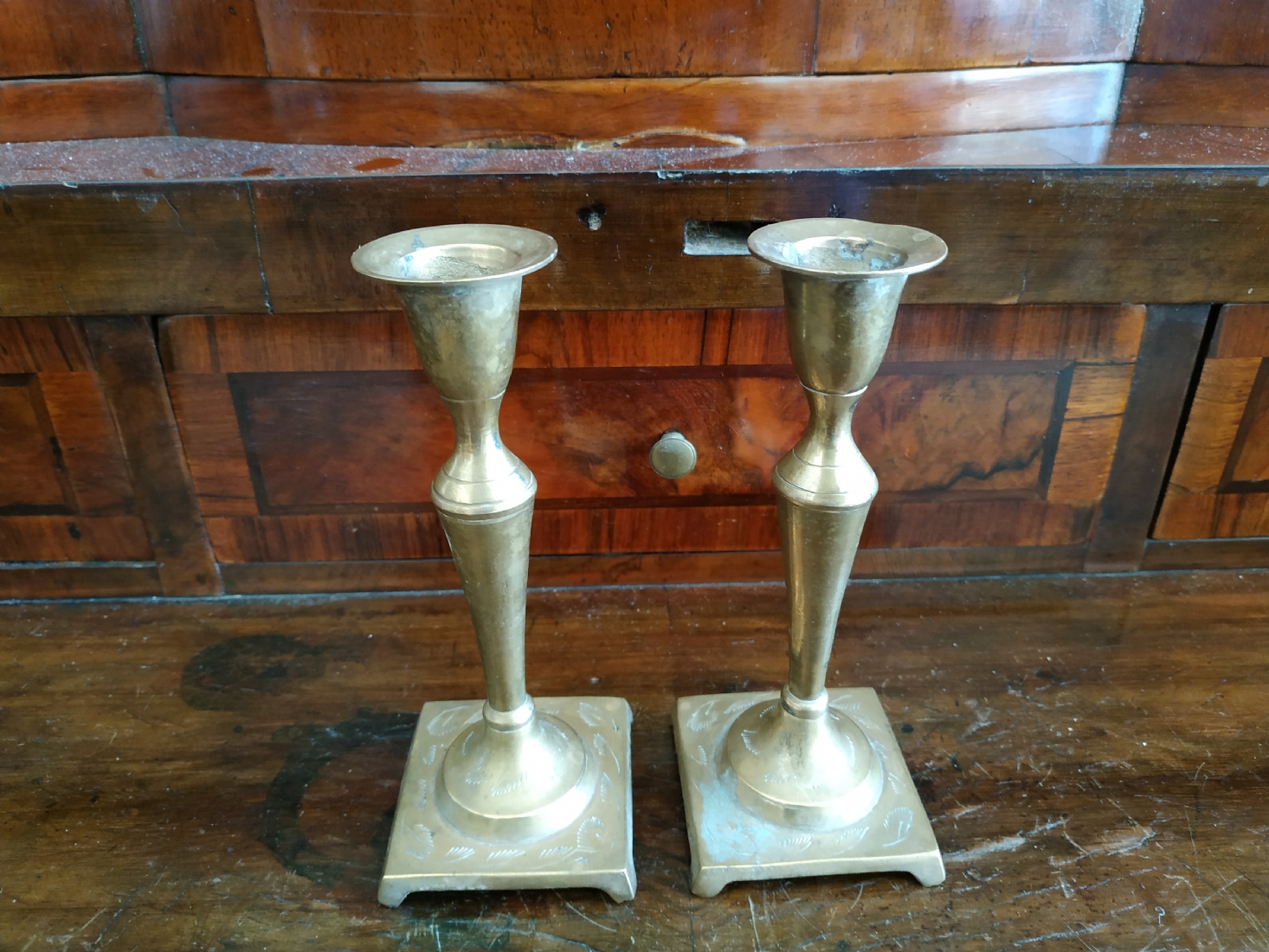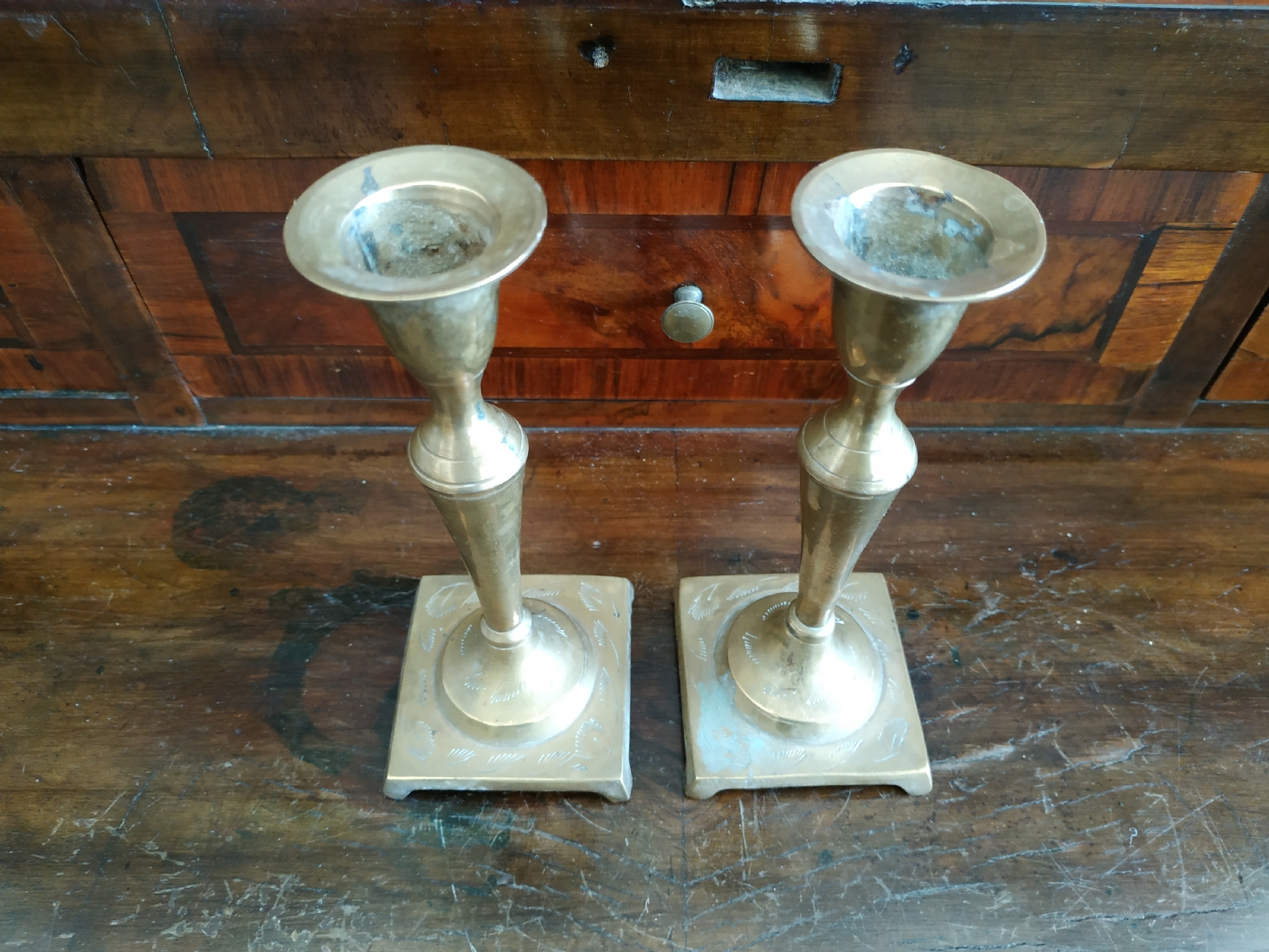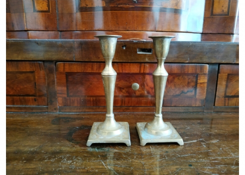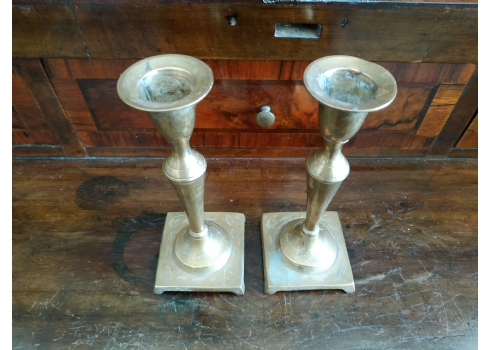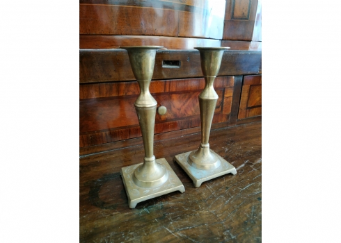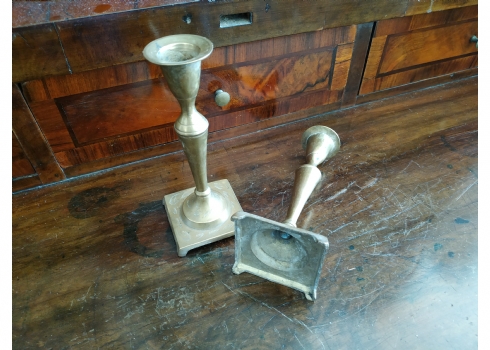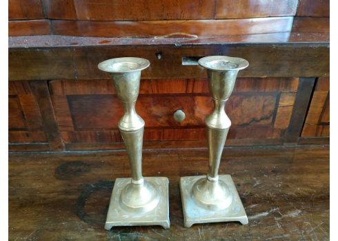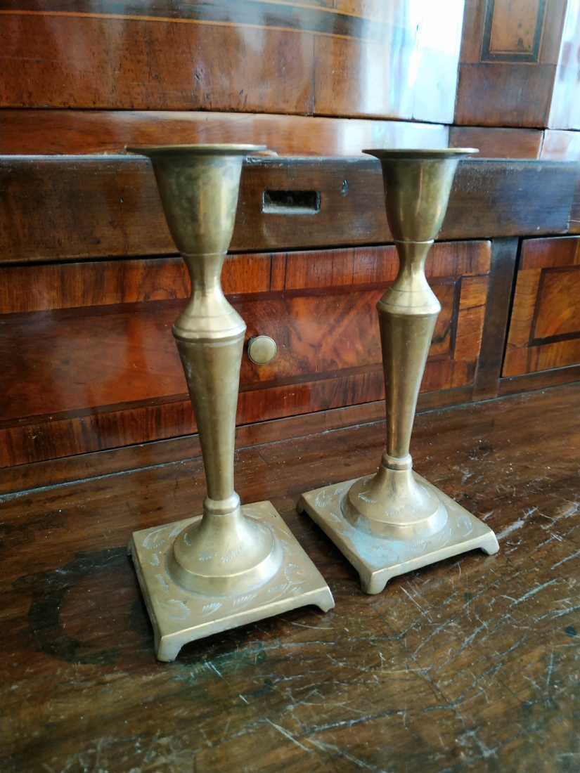 זוג פמוטים ישנים עשויים מיקשת פליז, מעוטרים בעיטור עדין, כפי הנראה הודים, גובה: 14.5 ס"מ.