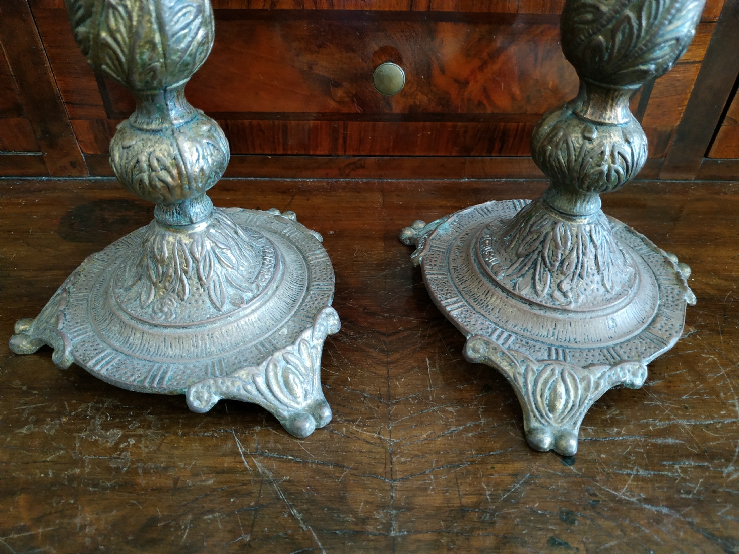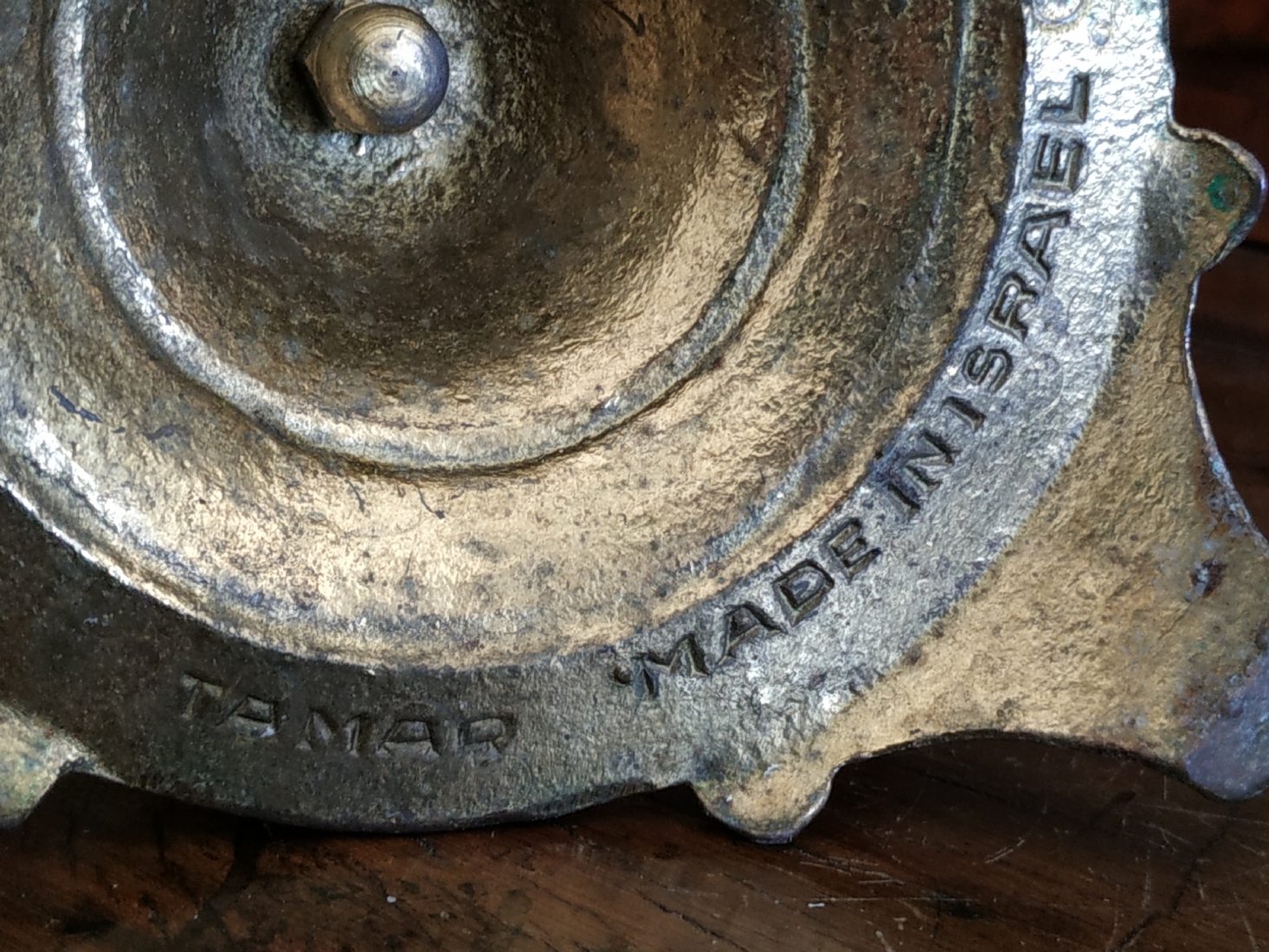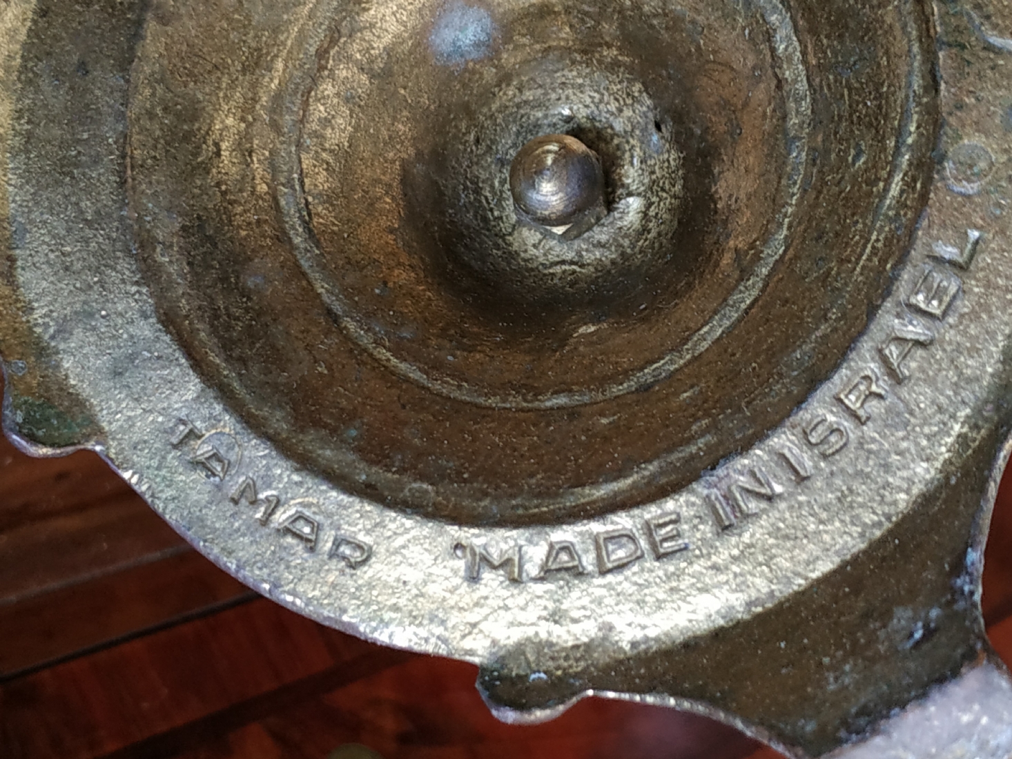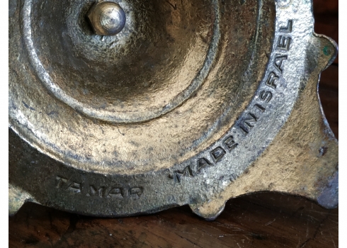 זוג פמוטים ישראלים ישנים מתוצרת: 'תמר', עשויים פליז יצוק, חתומים: 'Tamar', גובה: 25.5 ס"מ.