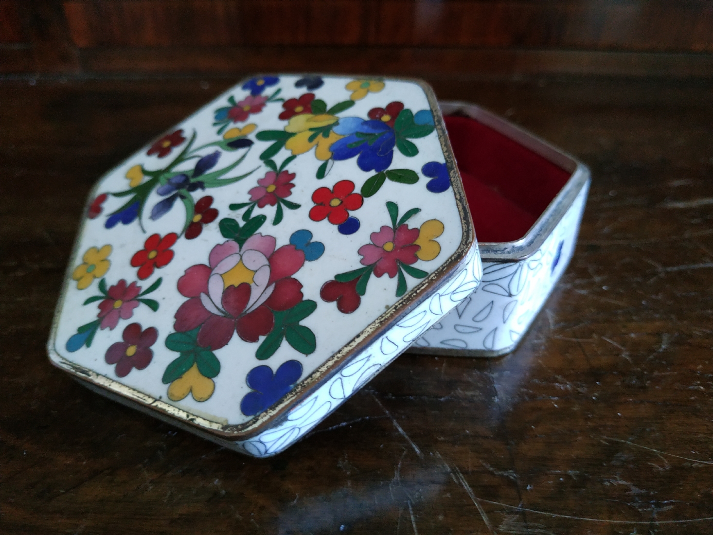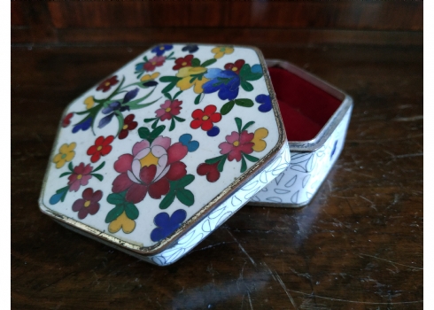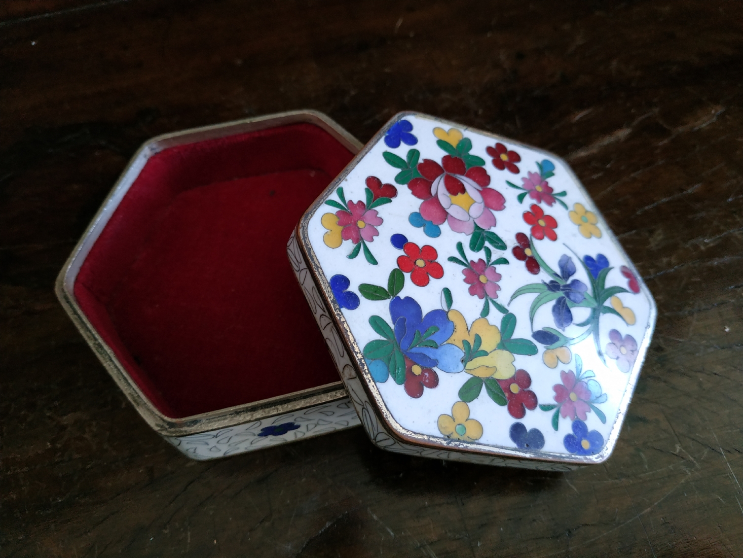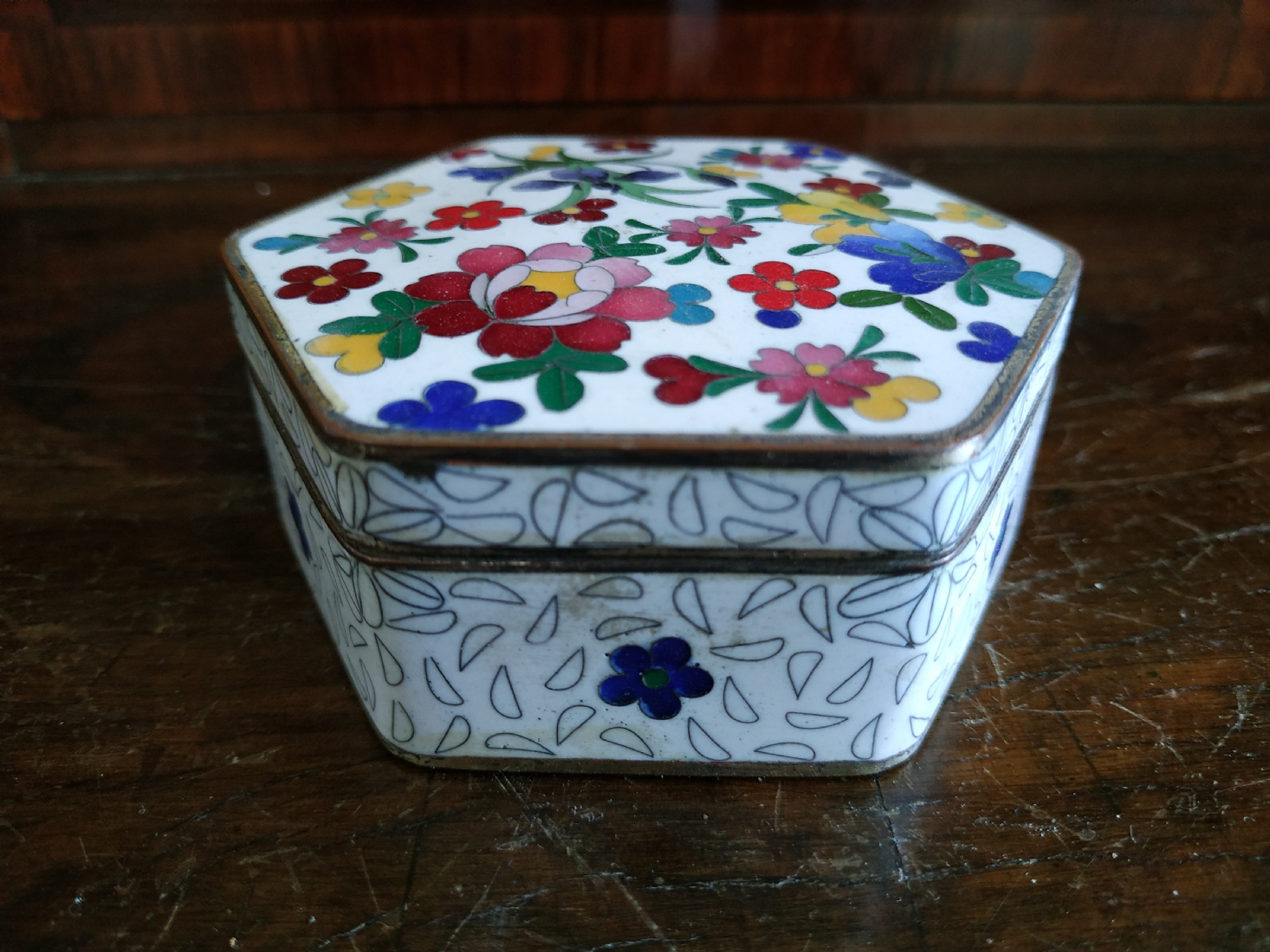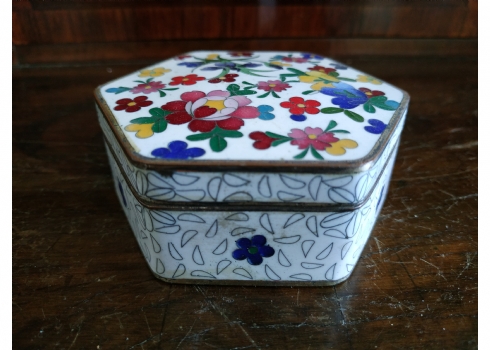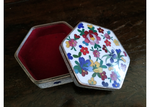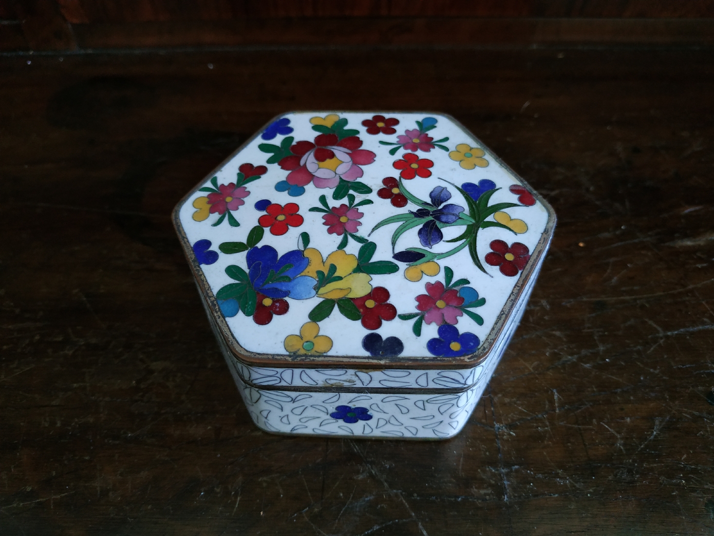 קופסא סינית ישנה משושה, עשויה מתכת מעוטרת אמייל 'קלואזונה' (Cloisonne), חיפוי פנימי עשוי בד קטיפה, רוחב: 8.5 ס"מ.