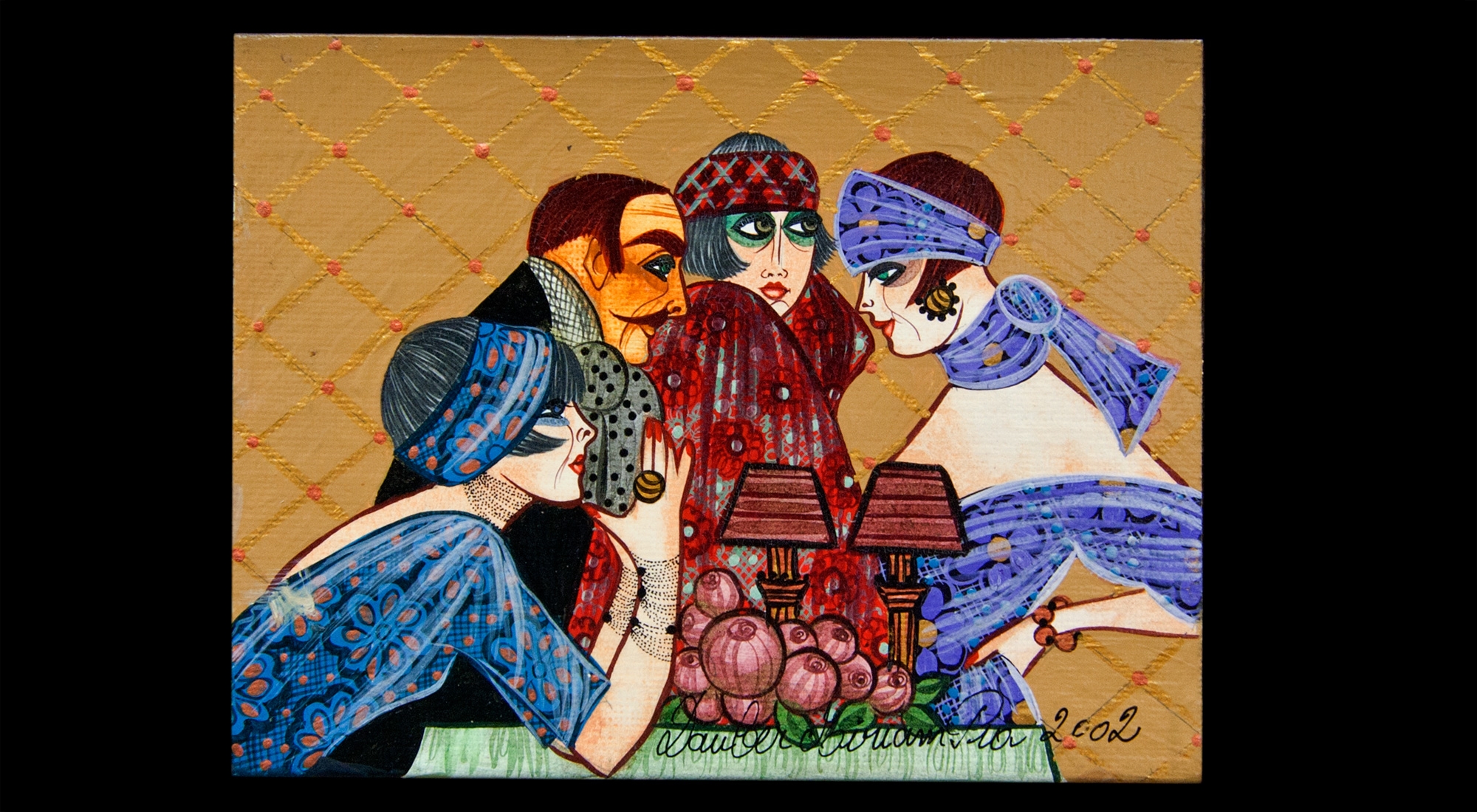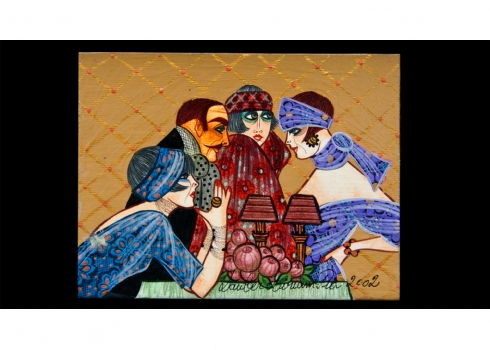 מרים דאובר (נ.1946) - 'גבר של שלוש נשים, ציור ישן , שמן בד צרפתי, חתום ומתוארך: 2002, מידות: 13X16 ס"מ.