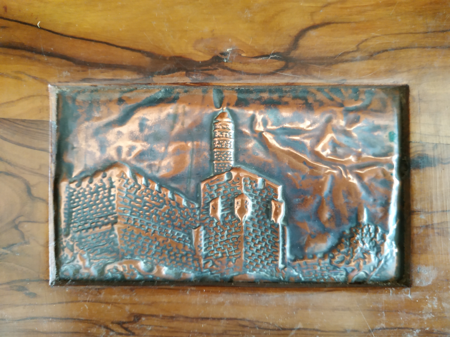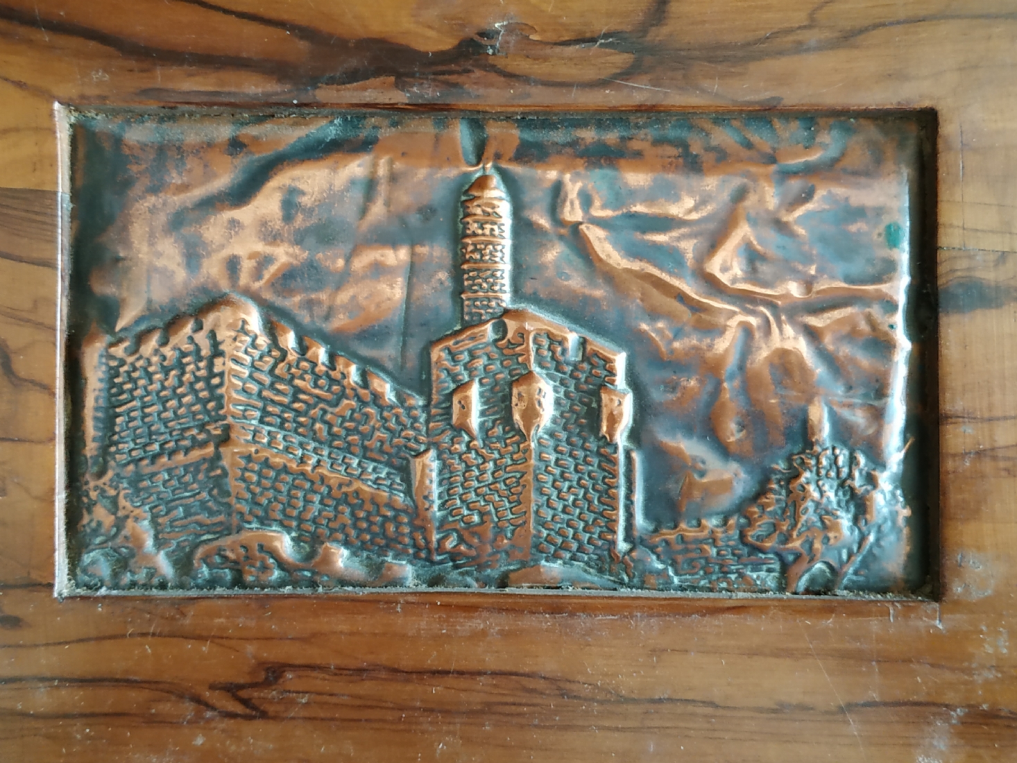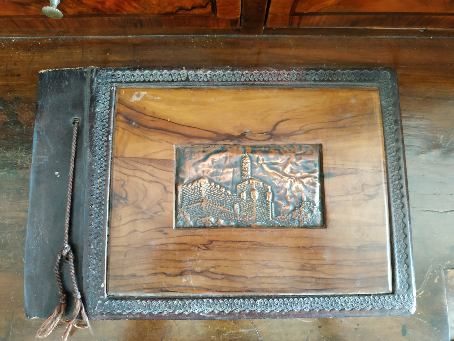 אלבום לצילומים או גלויות מתקופת פלשתינה, הכריכה הקדמית מחופה עץ זית ובמרכזו תבליט נחושת בסגנון 'בצלאל' עם דגם מגדל דוד וחומות העיר ירושלים, הגב חתום: 'made in palestine', מידות: 20X30 ס"מ.