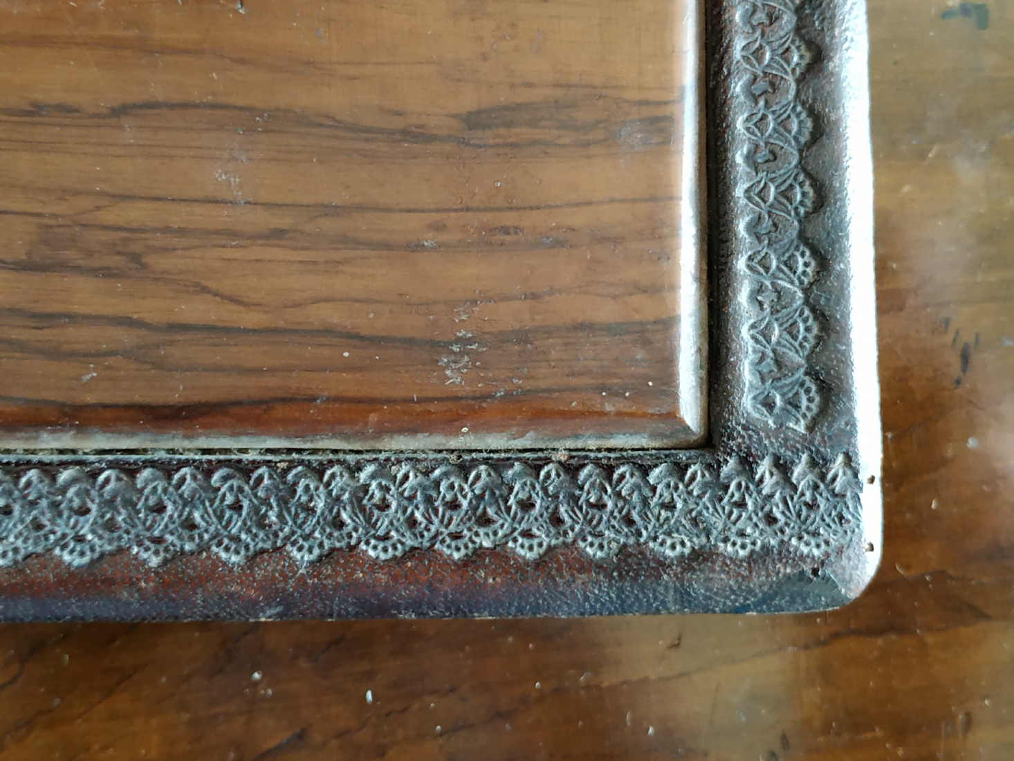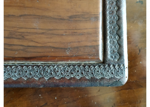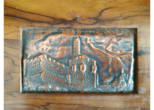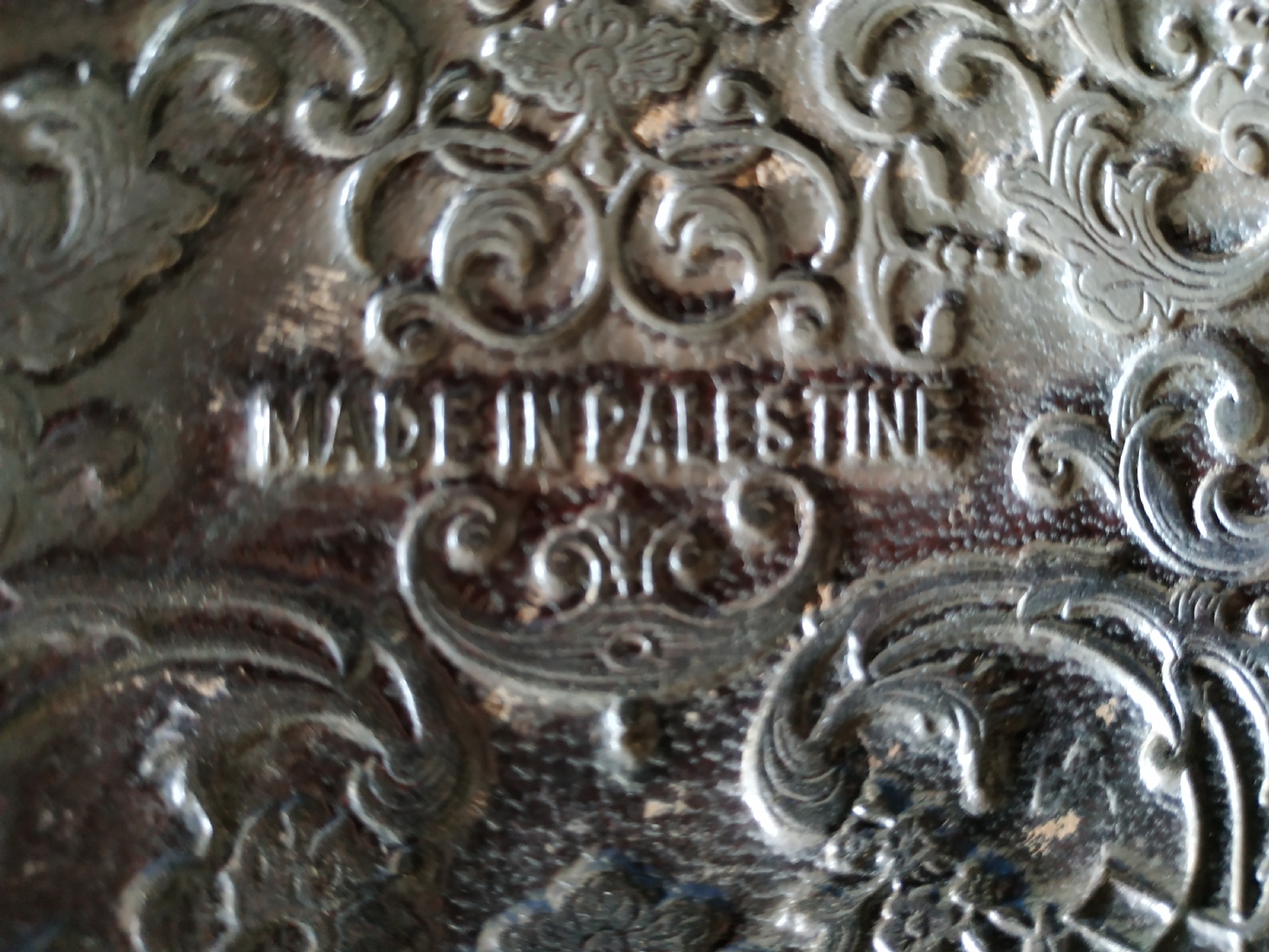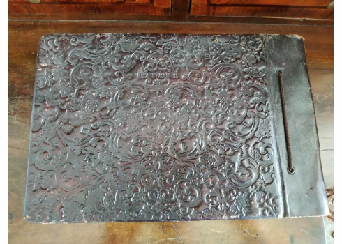 אלבום לצילומים או גלויות מתקופת פלשתינה, הכריכה הקדמית מחופה עץ זית ובמרכזו תבליט נחושת בסגנון 'בצלאל' עם דגם מגדל דוד וחומות העיר ירושלים, הגב חתום: 'made in palestine', מידות: 20X30 ס"מ.