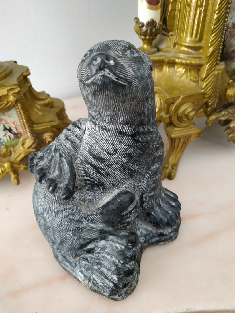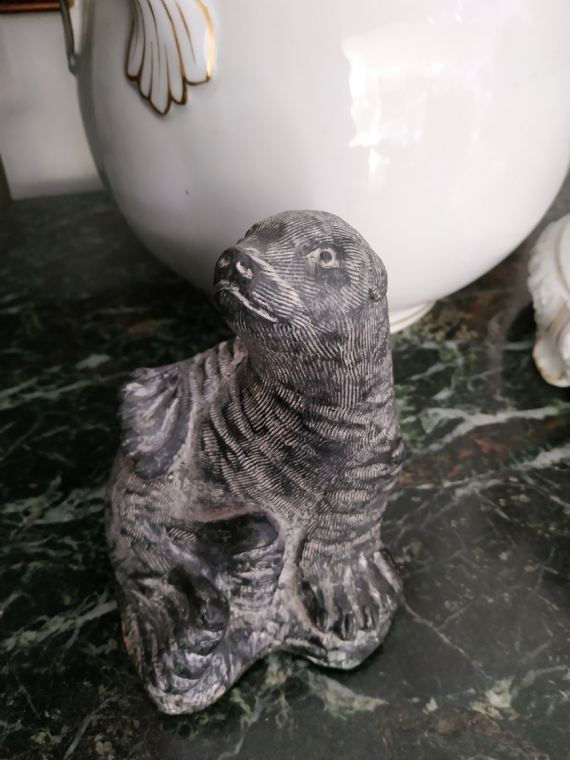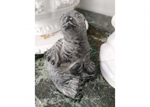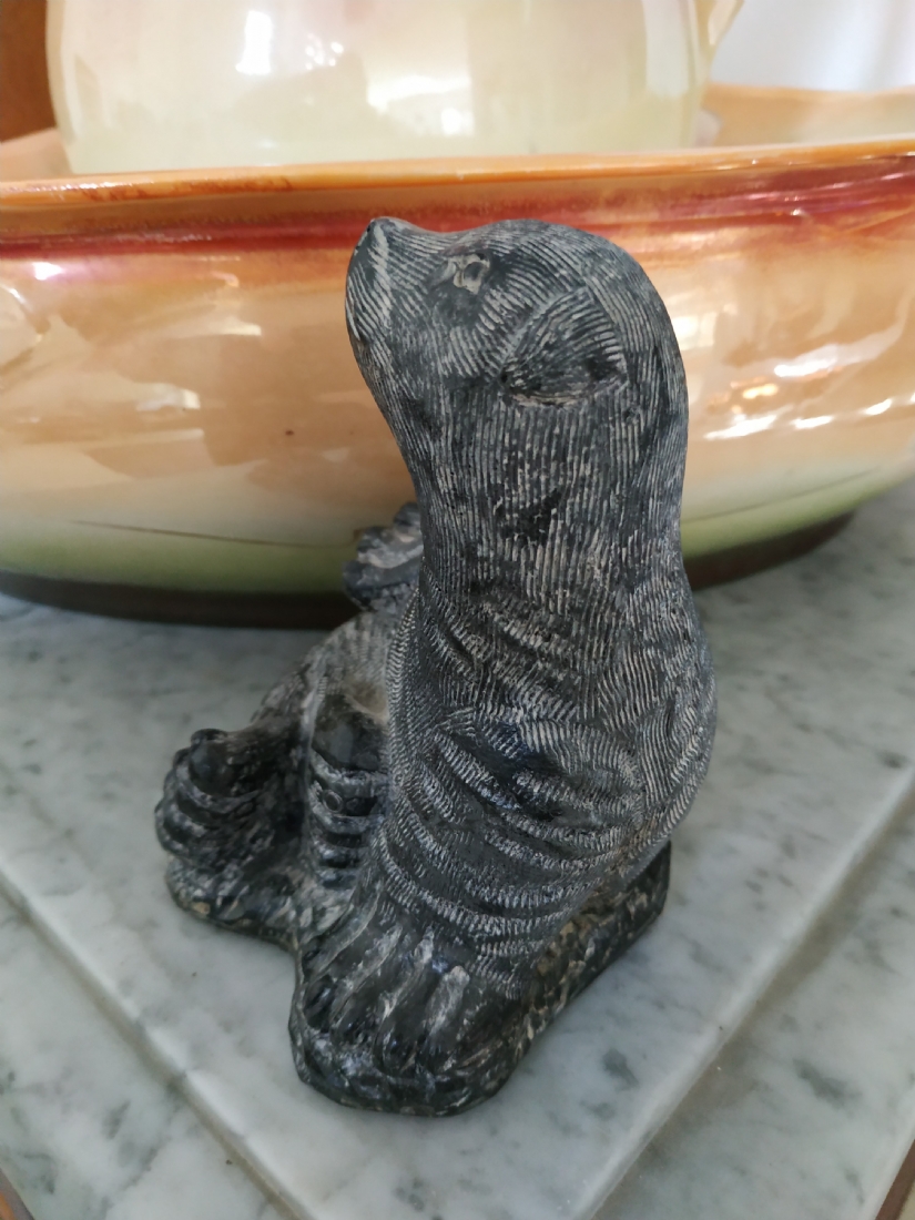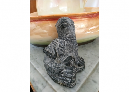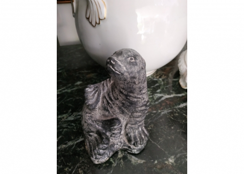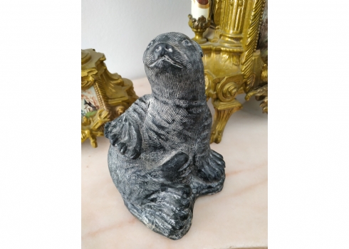 פסל קנדי בדמות כלב ים, עשוי אבן מגולפת