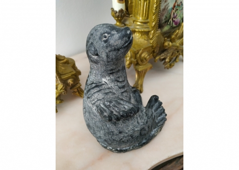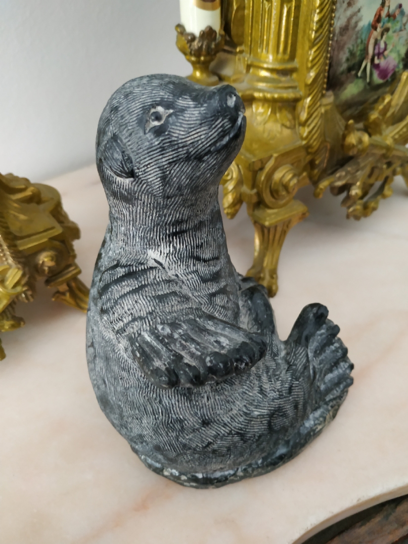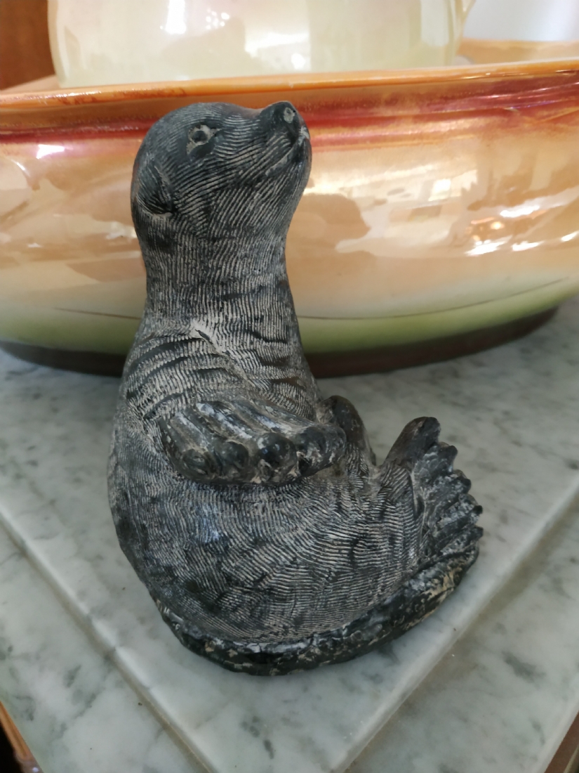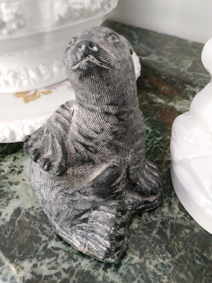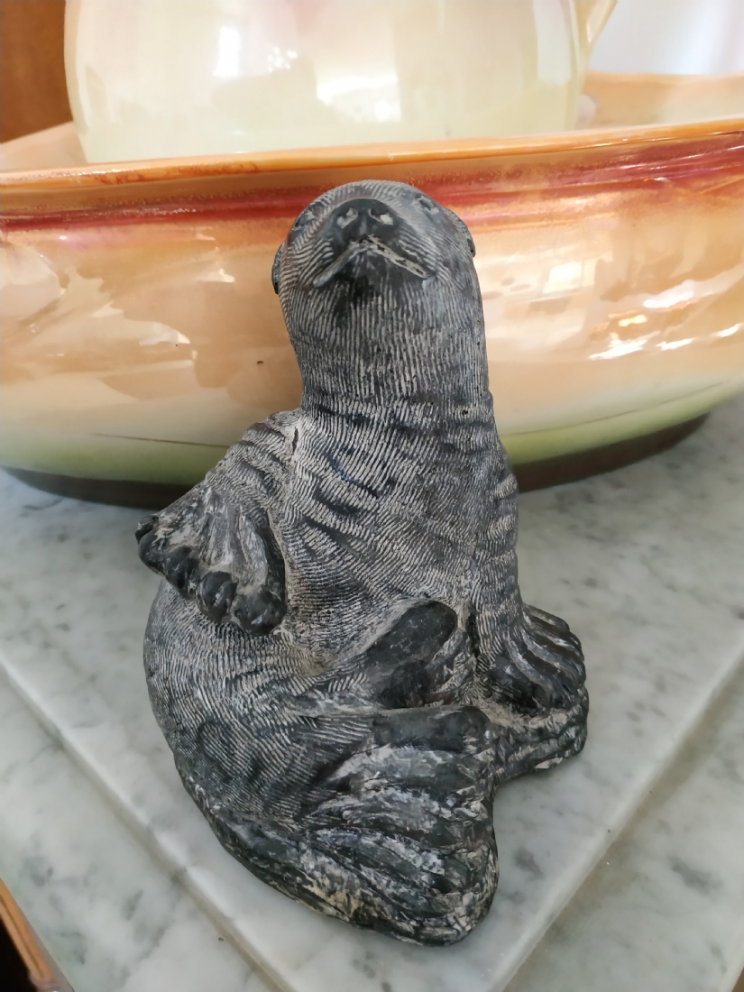 פסל קנדי בדמות כלב ים, עשוי אבן מגולפת