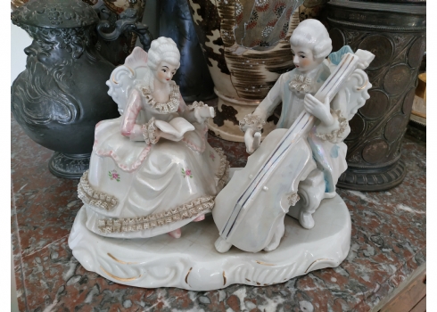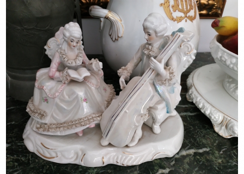 פסל חרסינה בדמות זוג אצילים בקונצרט, לא חתום, גובה: 22 ס"מ, רוחב: 28 ס"מ.