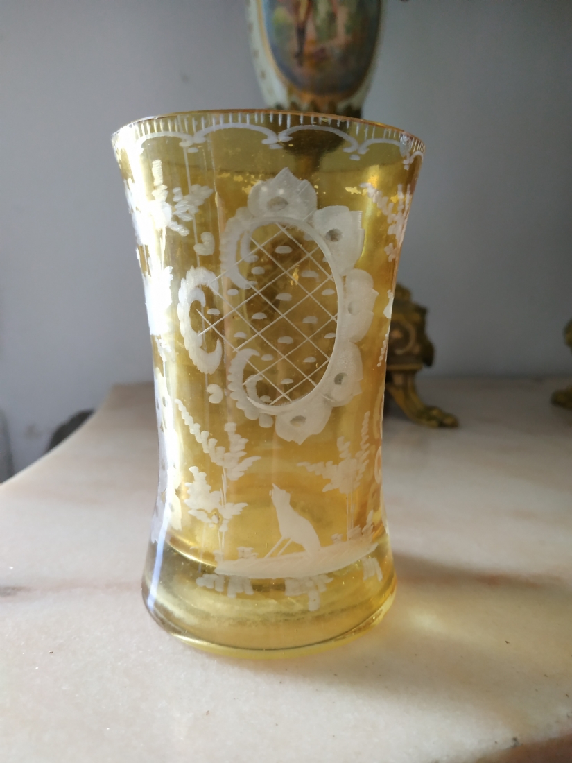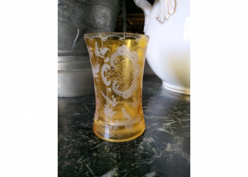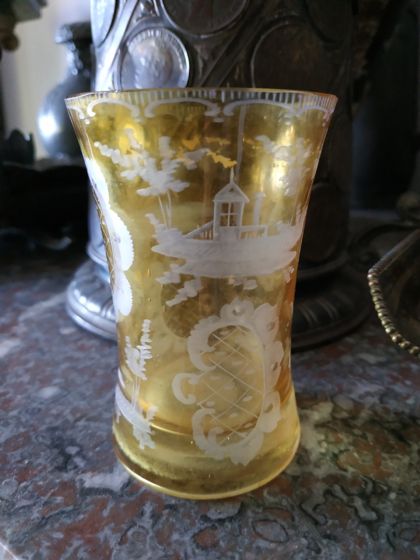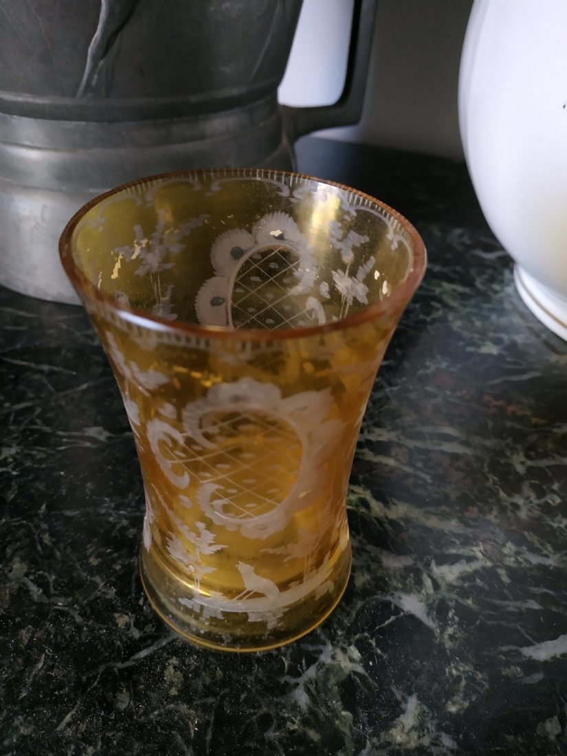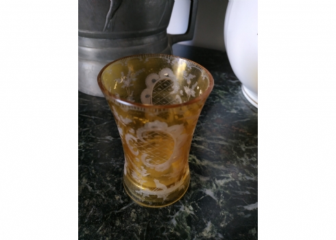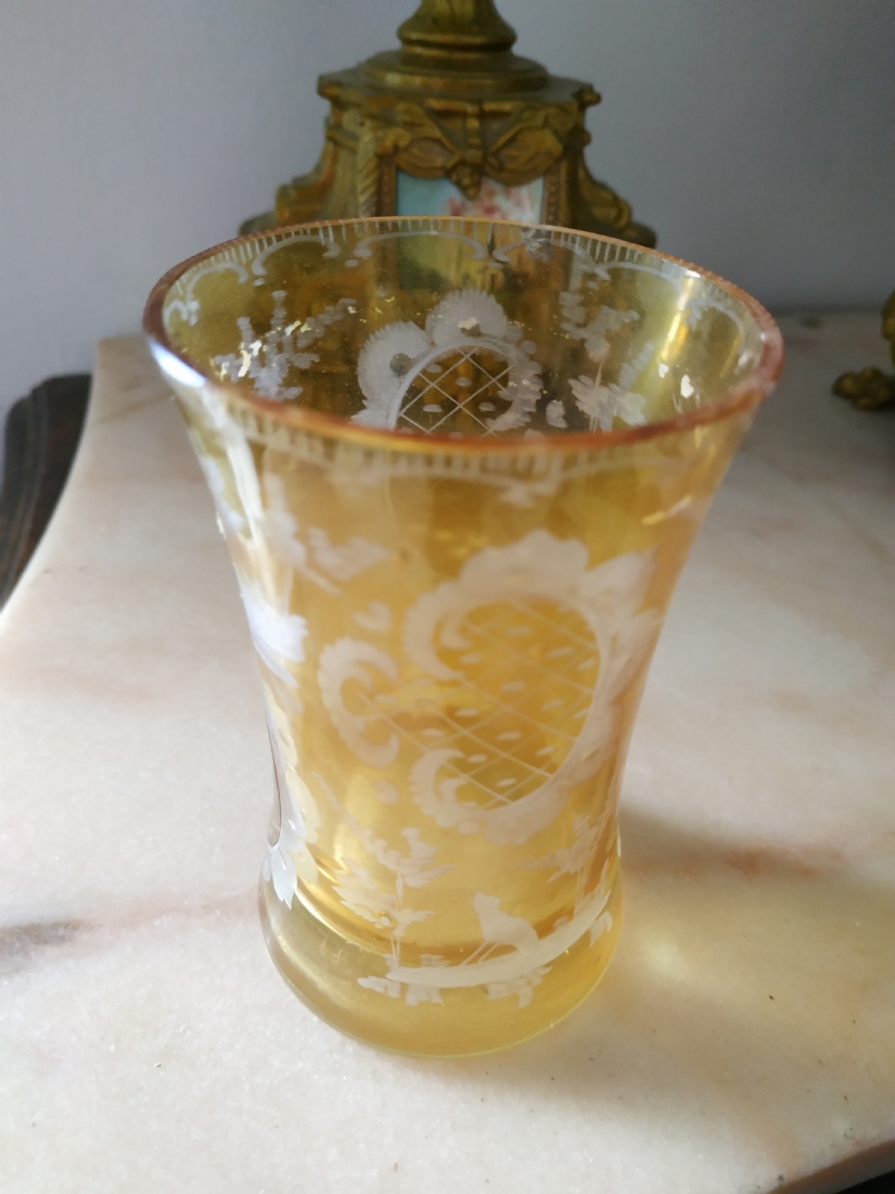 כוס בוהמית עתיקה מהמאה ה-19, עשויה זכוכית מרובדת בגוון ענבר