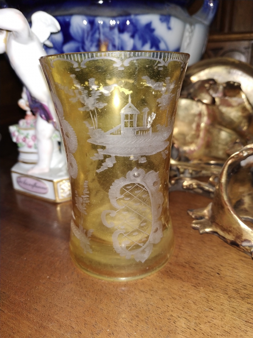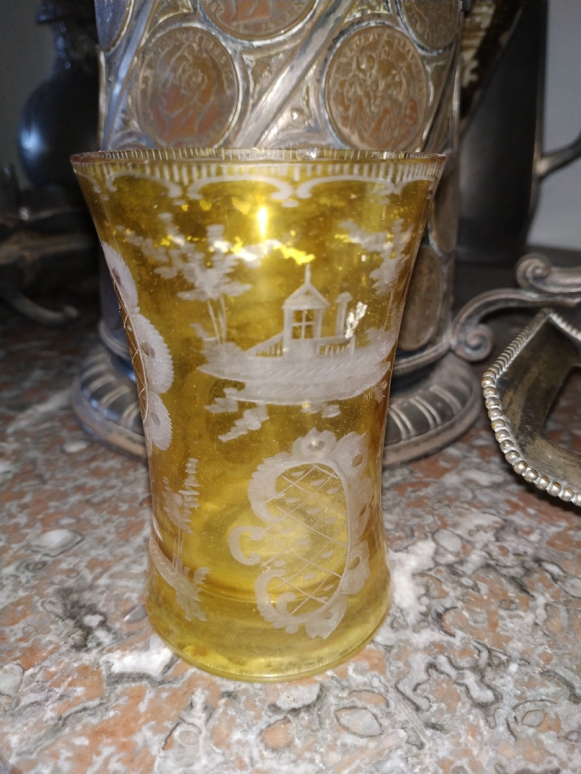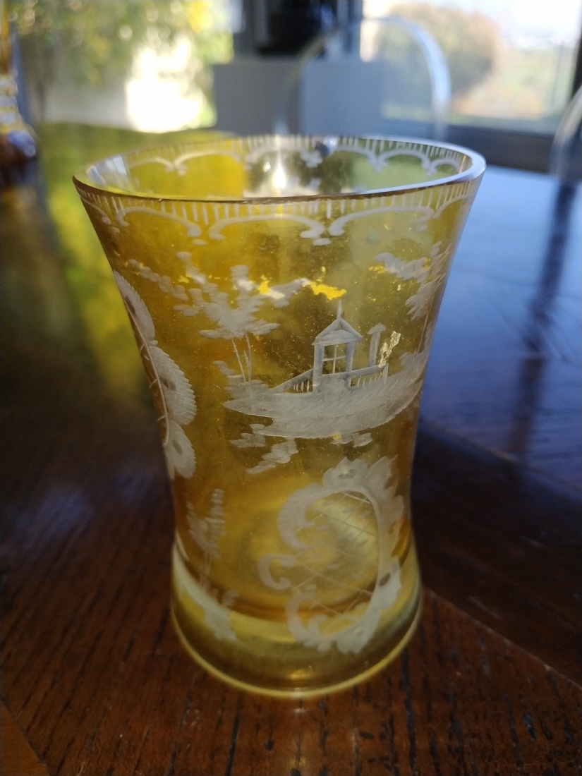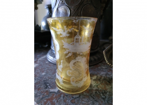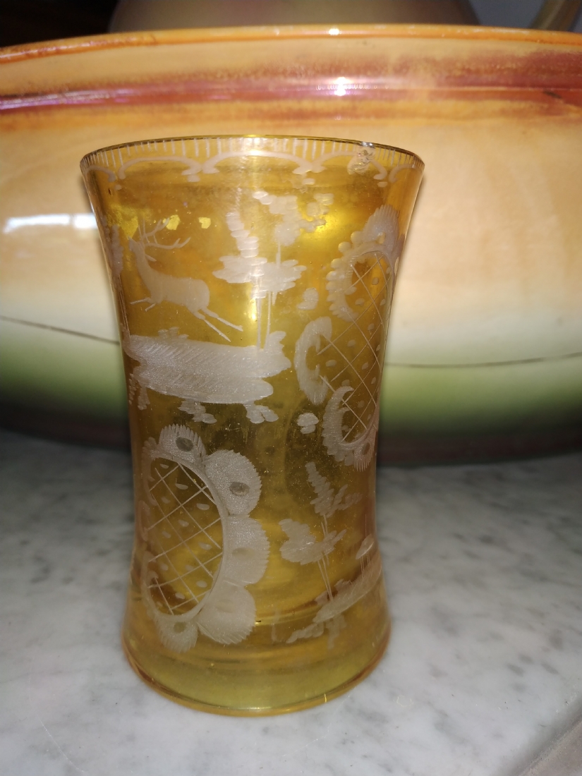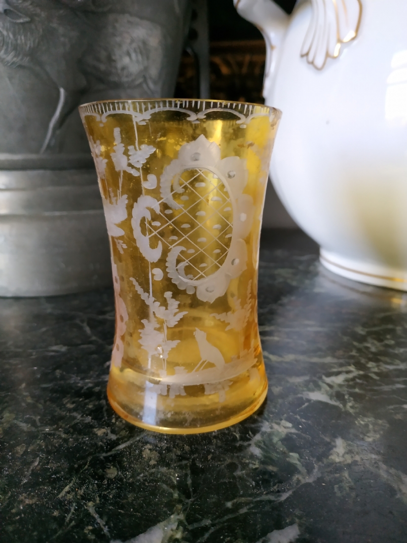 כוס בוהמית עתיקה מהמאה ה-19, עשויה זכוכית מרובדת בגוון ענבר