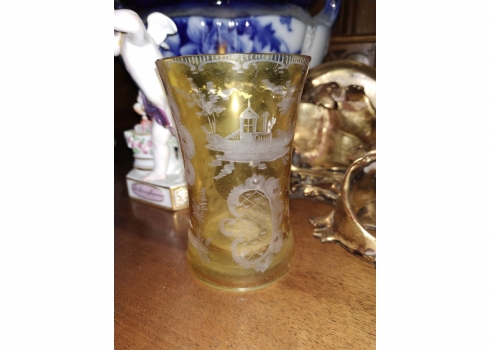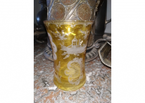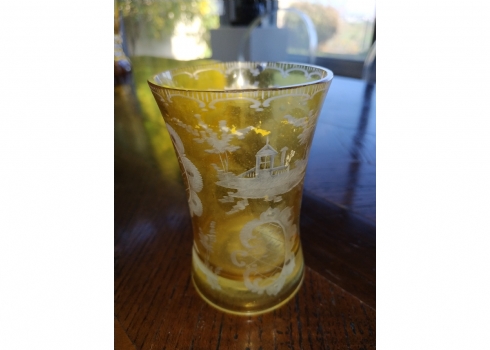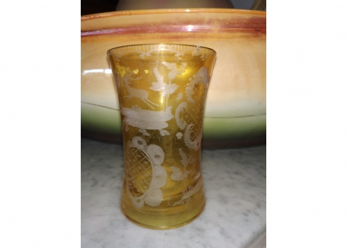 מספר הפריט בקטלוג 74כוס בוהמית עתיקה מהמאה ה-19, עשויה זכוכית מרובדת בגוון ענבר על שקוף, מעוטרת בליטוש ידני בשיטת: 'cut to clear', צ'יפים מינוריים לשפה, גובה: 10 ס"מ.