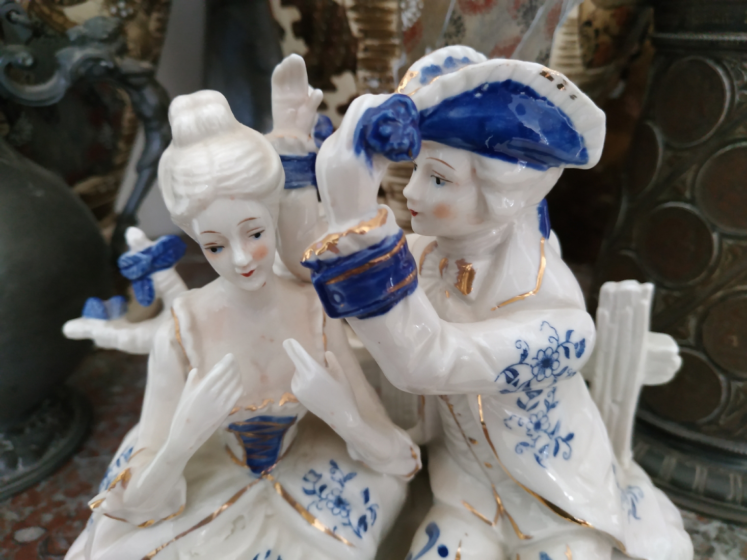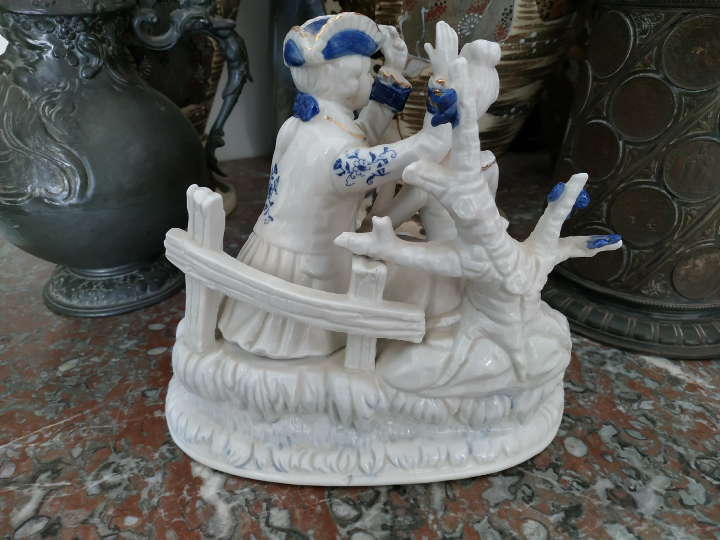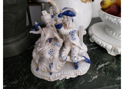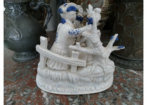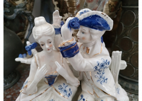 'הבאתי לך פרח כחול' - פסל חרסינה ישן, מעוטר בקובלט כחול, גובה: 20 ס"מ, רוחב: 20 ס"מ.