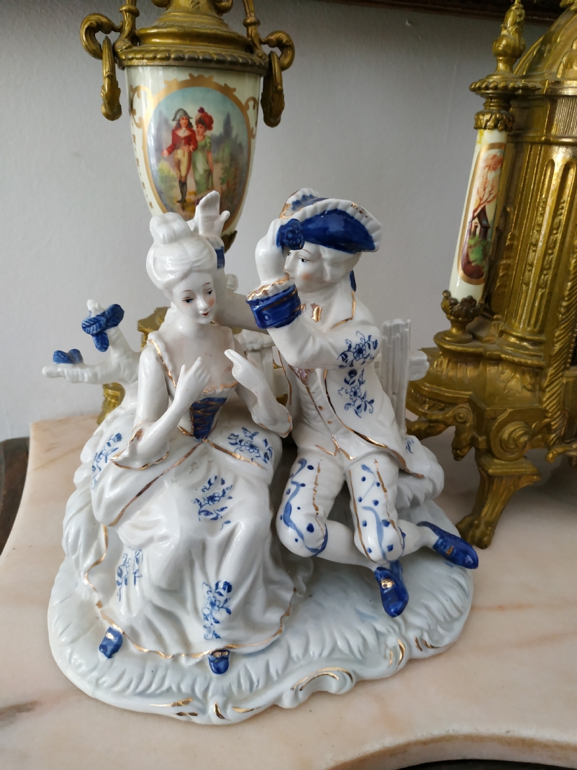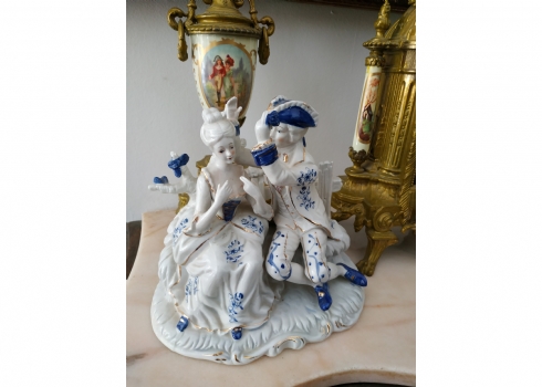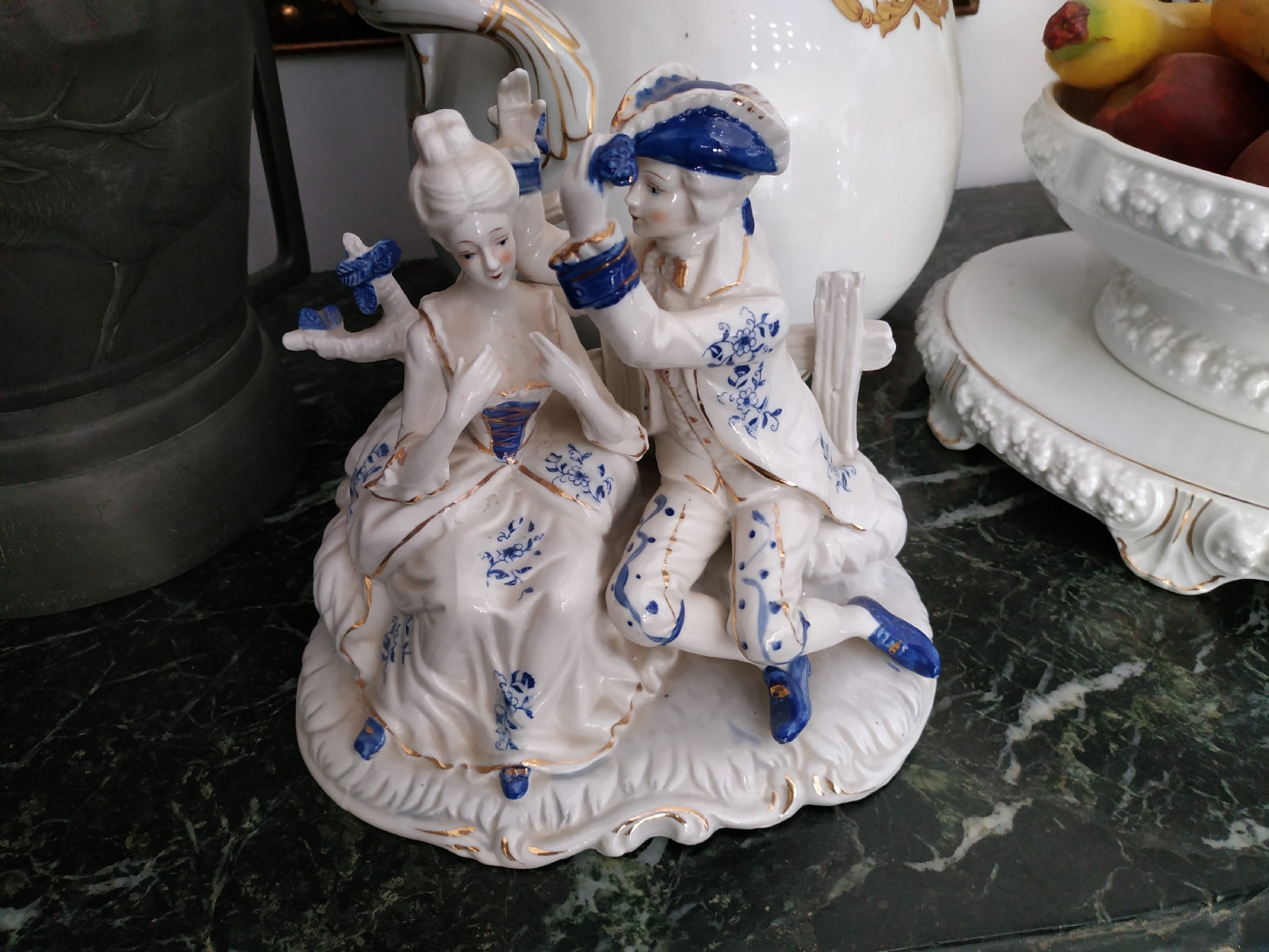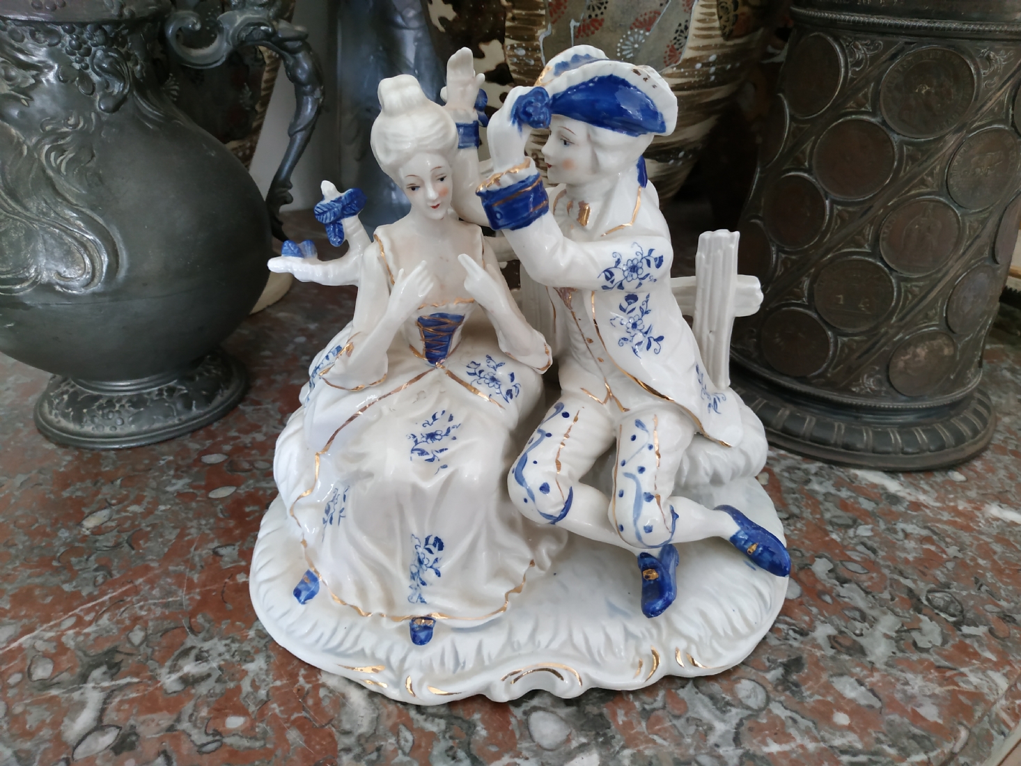 'הבאתי לך פרח כחול' - פסל חרסינה ישן, מעוטר בקובלט כחול, גובה: 20 ס"מ, רוחב: 20 ס"מ.