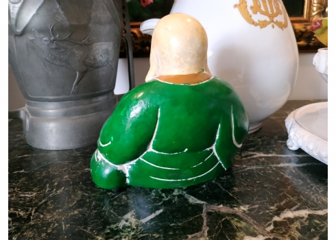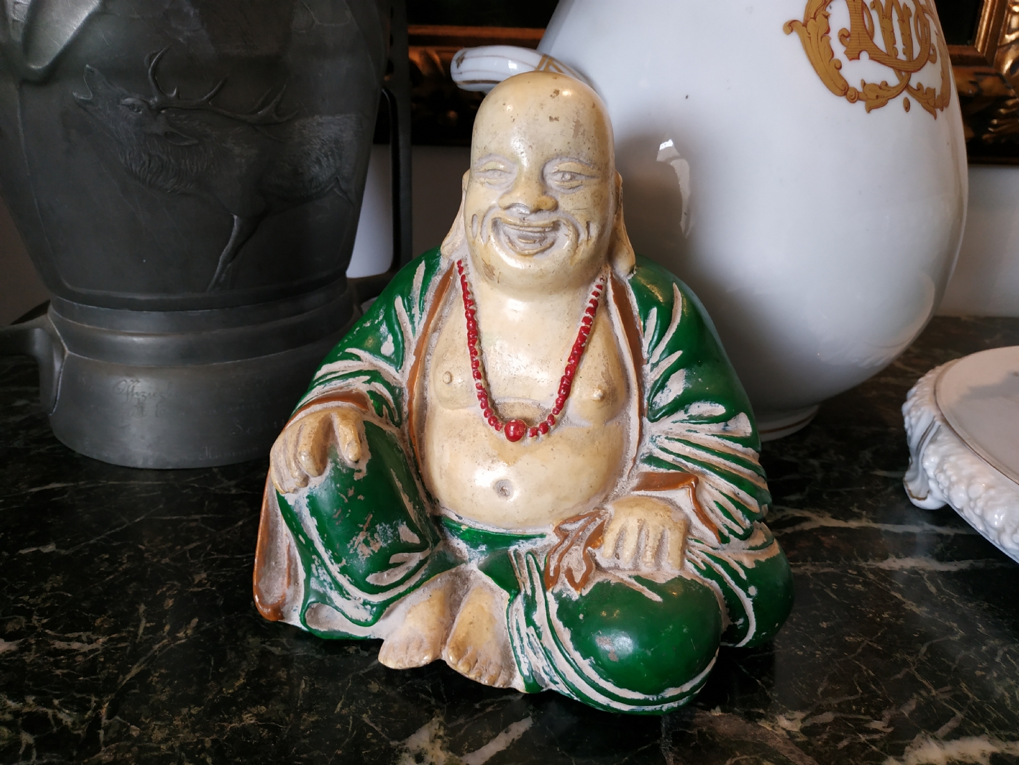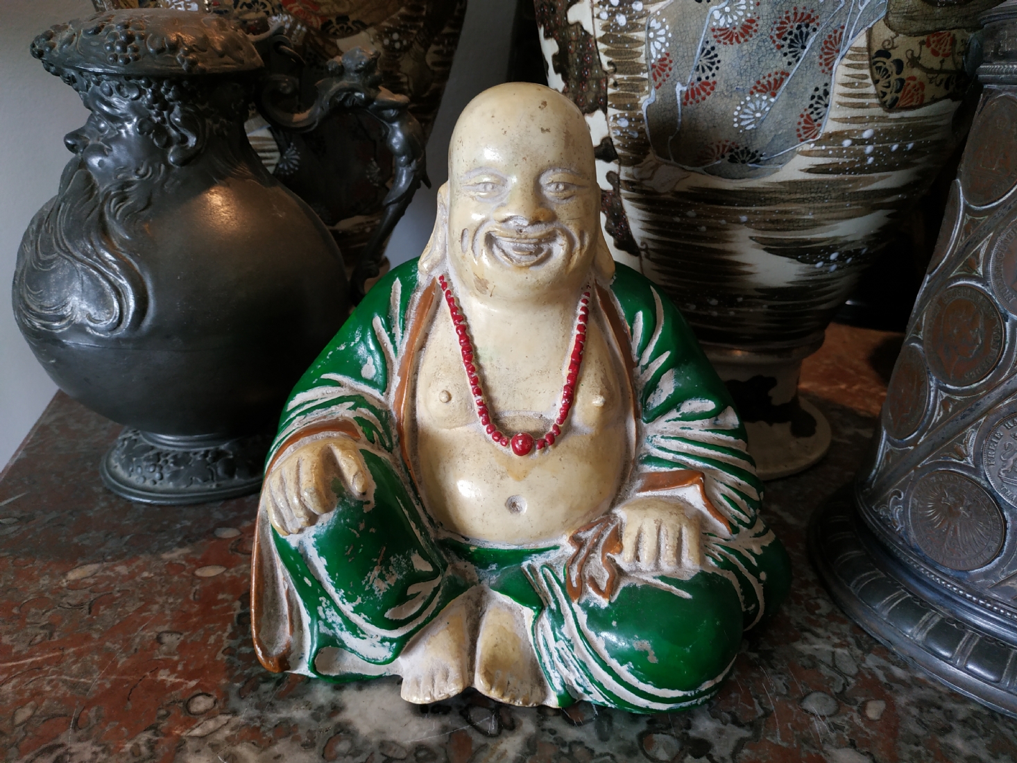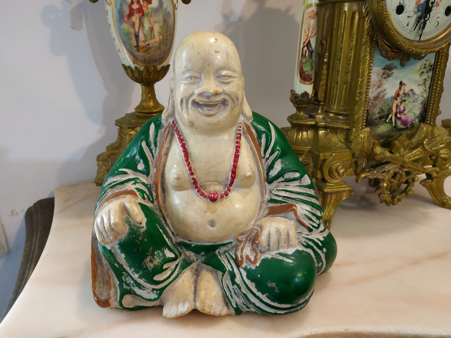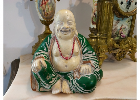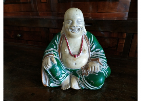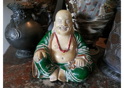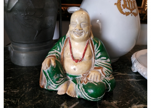 מספר הפריט בקטלוג 87לחובבי וינטג' - פסל סיני ישן משנות החמישים, בדמות בודהה חייכן ושמנמן, צבוע ביד, עשוי חרס, גובה: 20 ס"מ. במצב ישן משומש.