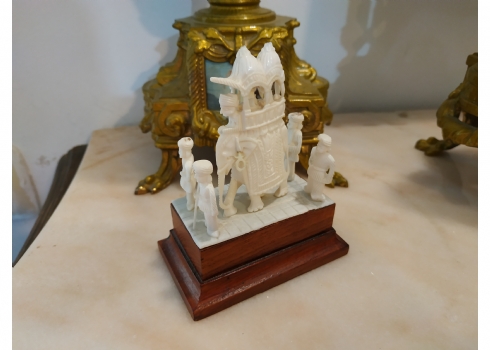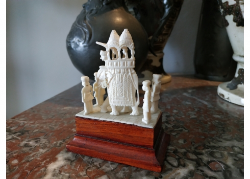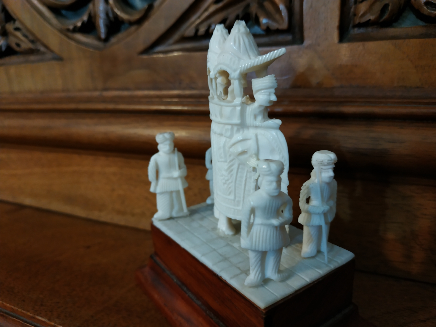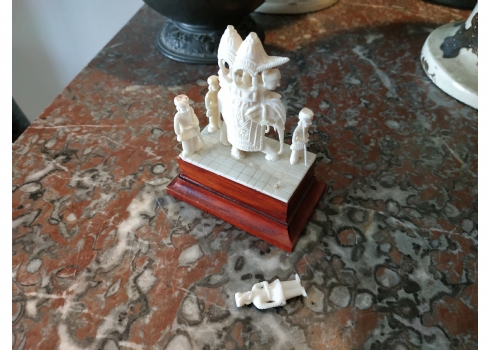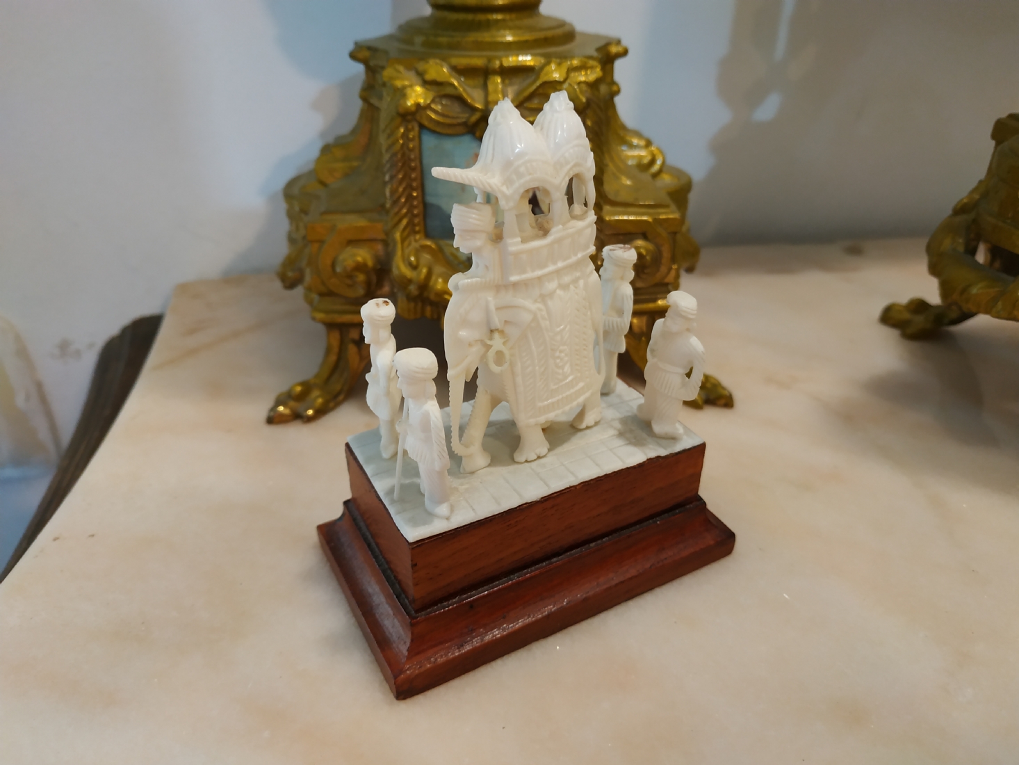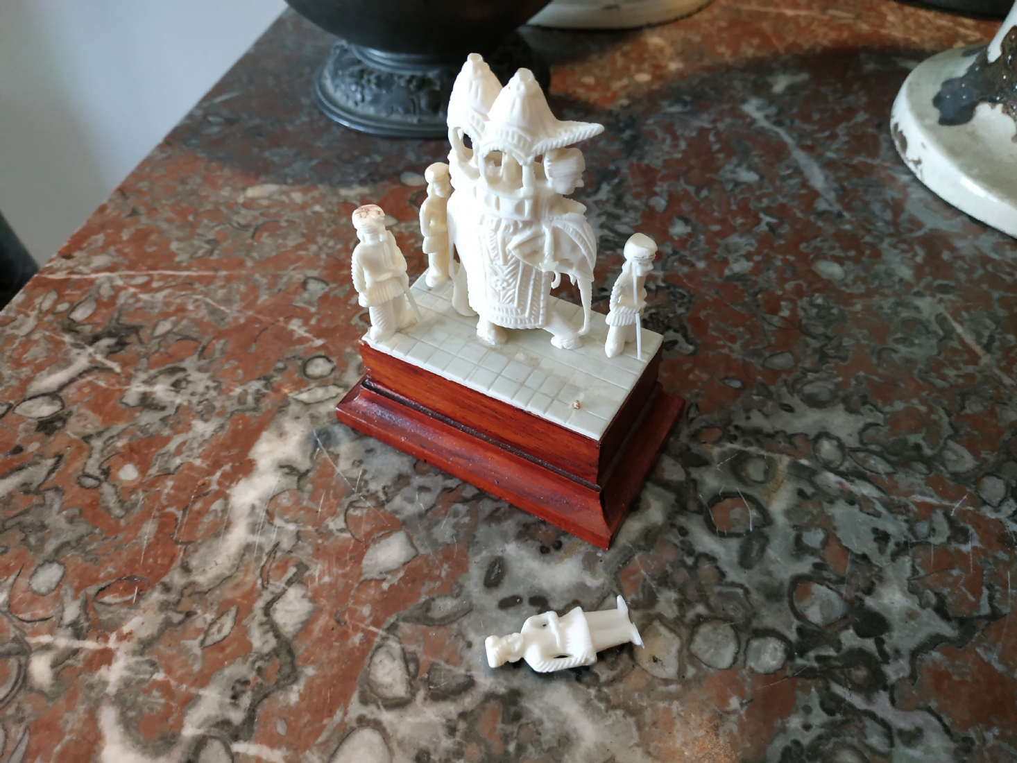 פסלון שנהב מניאטורי הודי על בסיס עץ, דמות אחת צריכה הדבקה לפין המתכת שמעגן אותו לבסיס, גובה: 10.5 ס"מ.