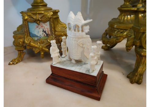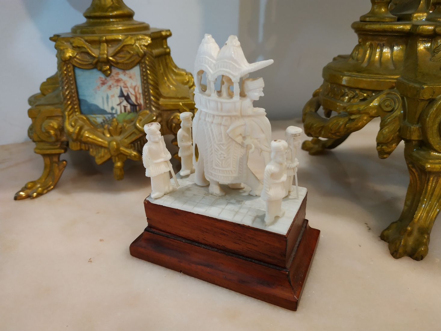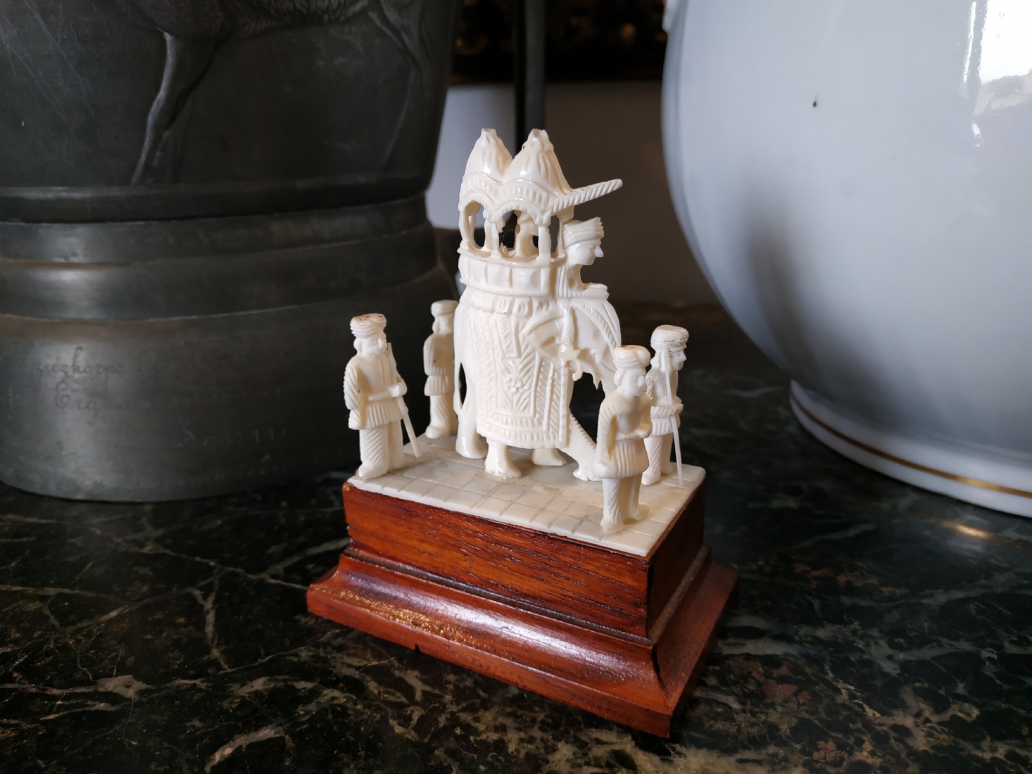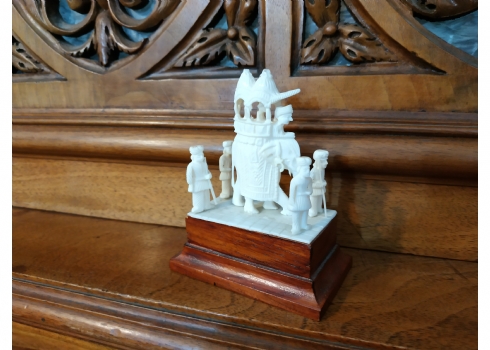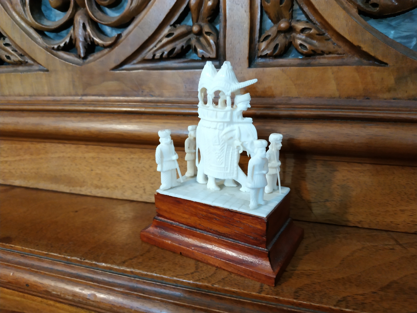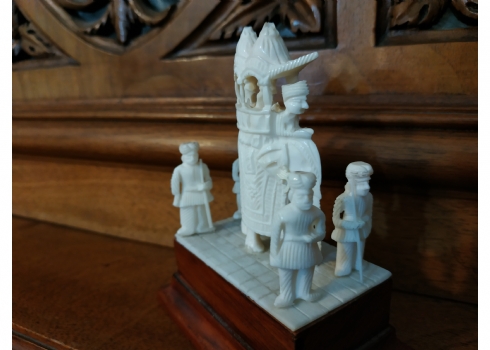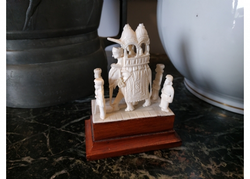 פסלון שנהב מניאטורי הודי על בסיס עץ, דמות אחת צריכה הדבקה לפין המתכת שמעגן אותו לבסיס, גובה: 10.5 ס"מ.