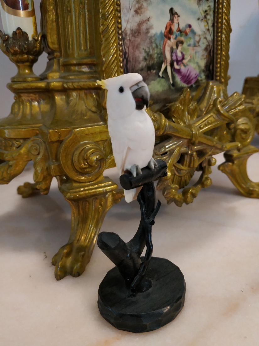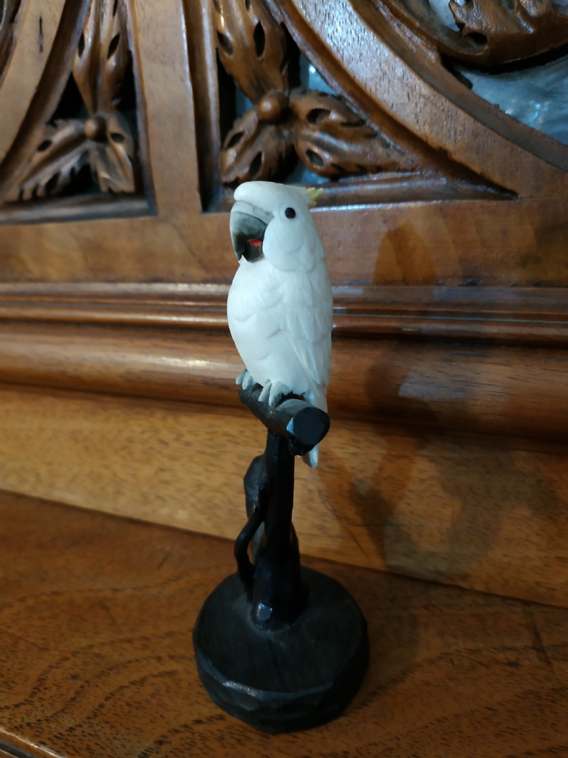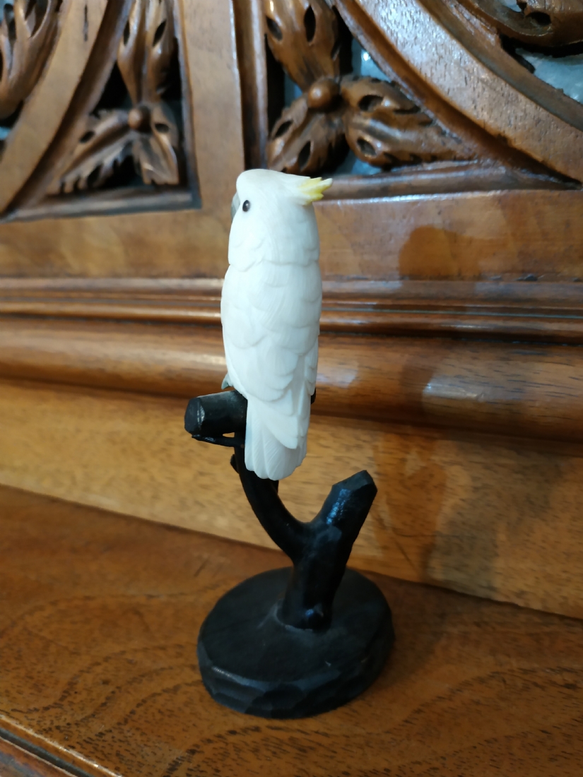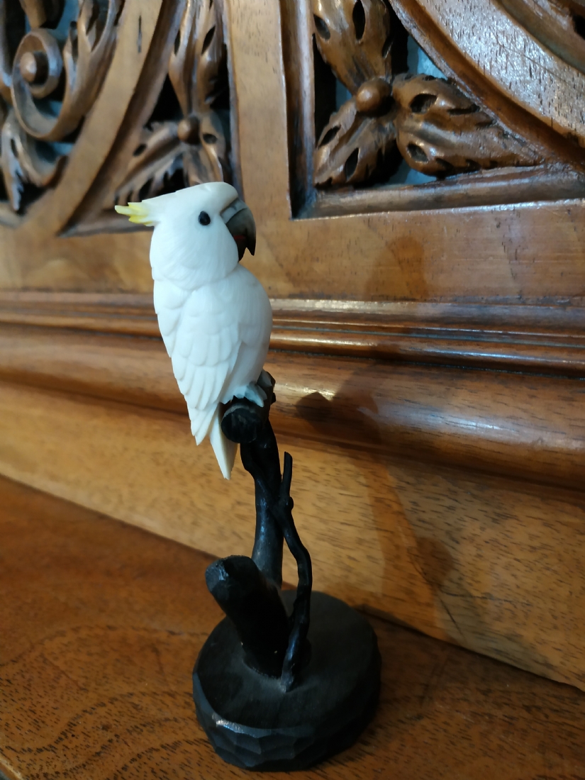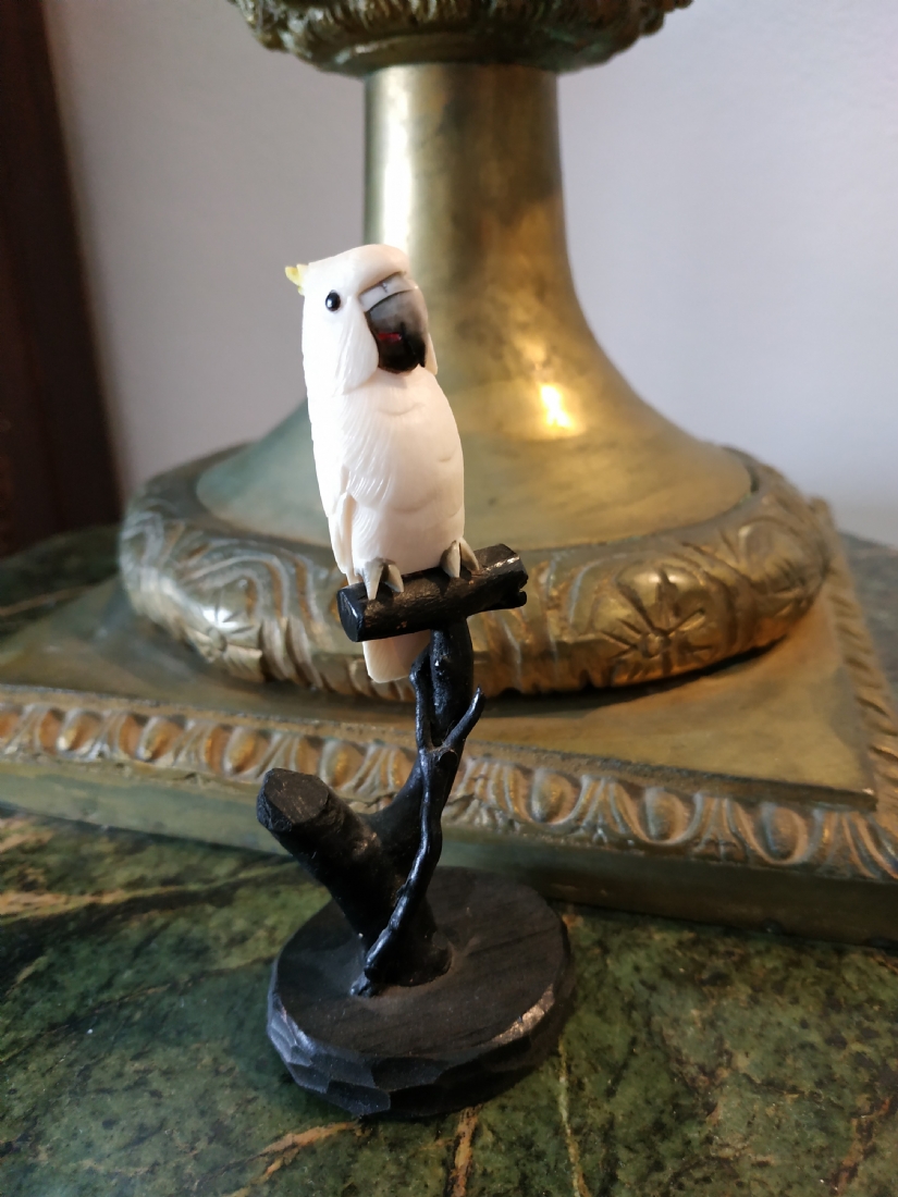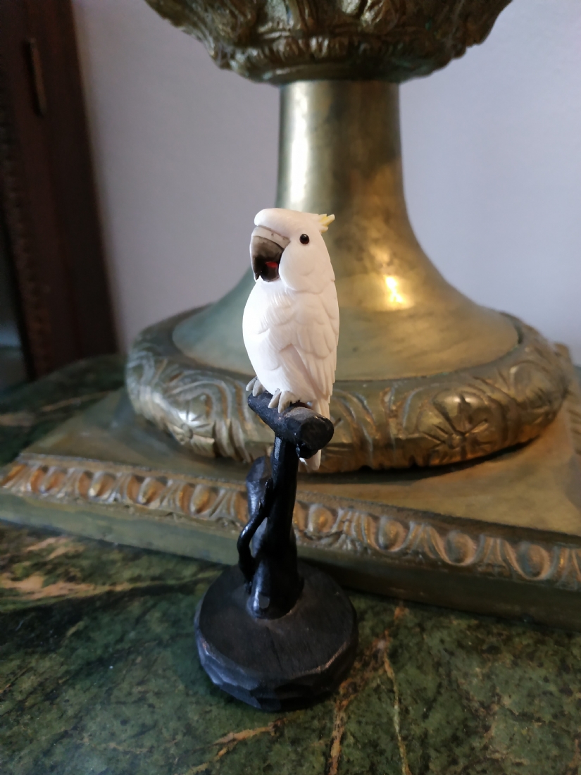 קישוט שנהב מגולף בעבודת יד אמן בדמות תוכי קקדו, בסיס עץ, גובה כולל: 10.5 ס"מ.