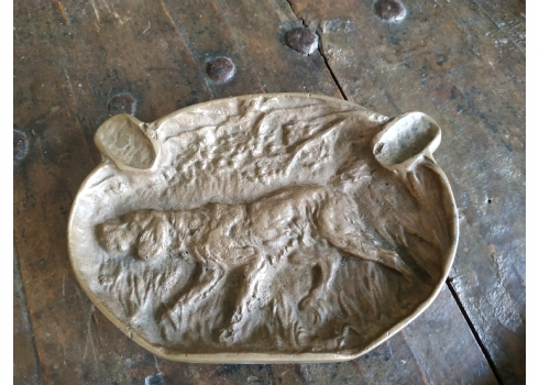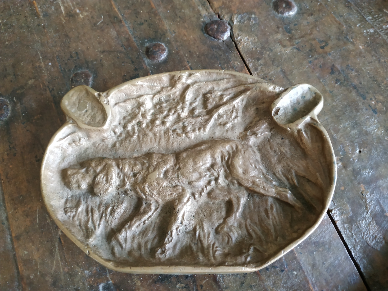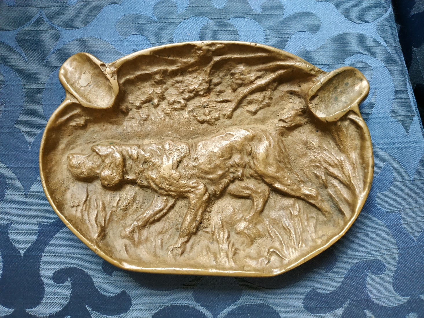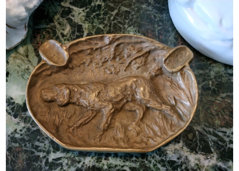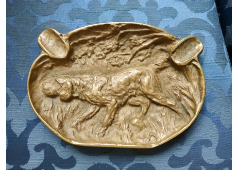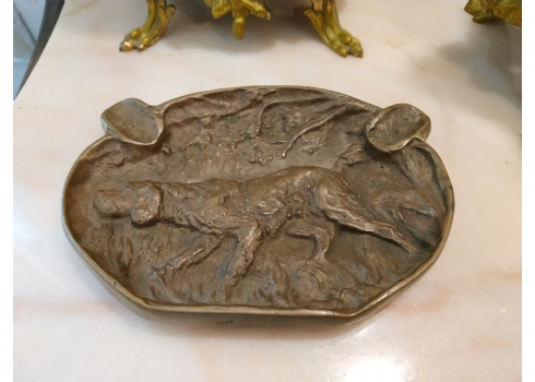 מאפרה צרפתית עתיקה עשויה ברונזה, מעוטרת עיטורי בלט בדמות כלב, רוחב: 15 ס"מ.