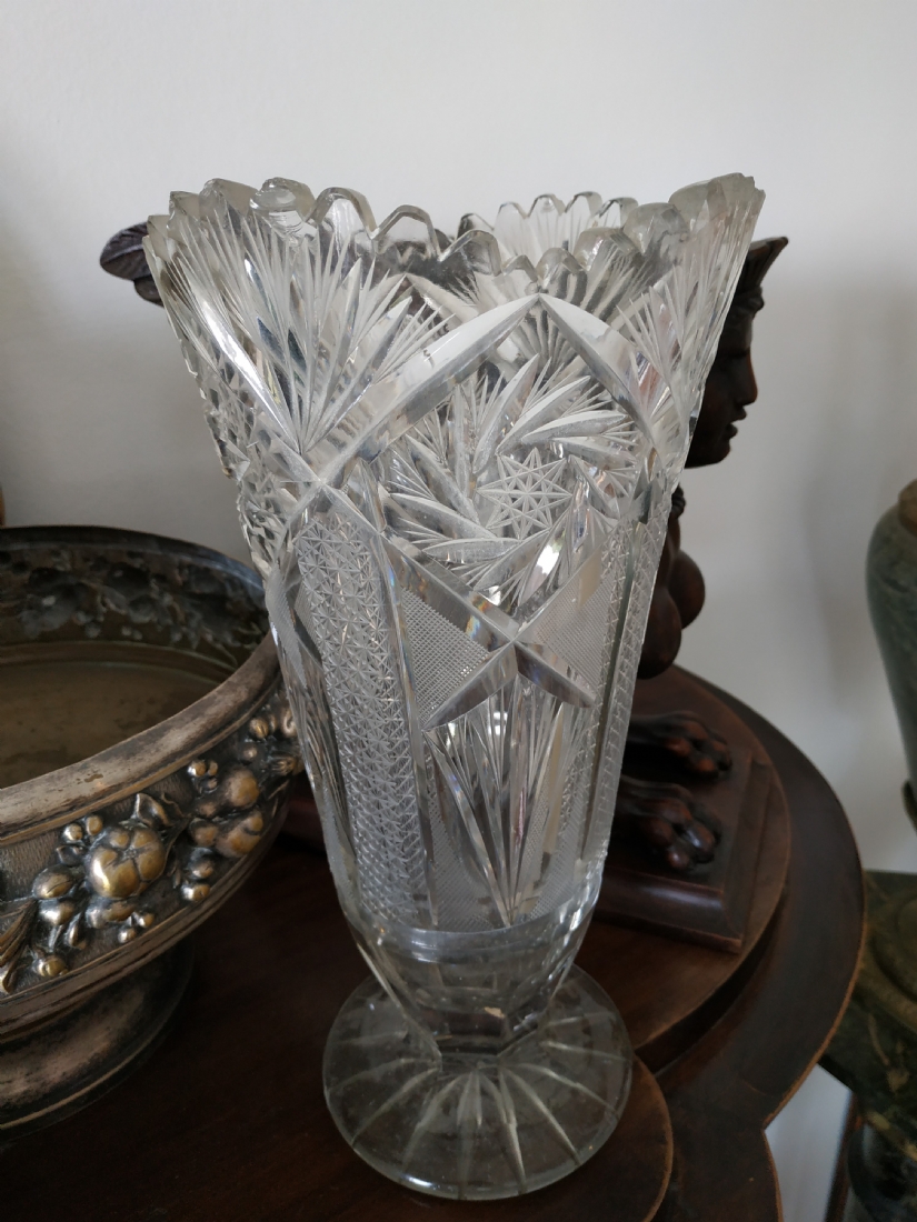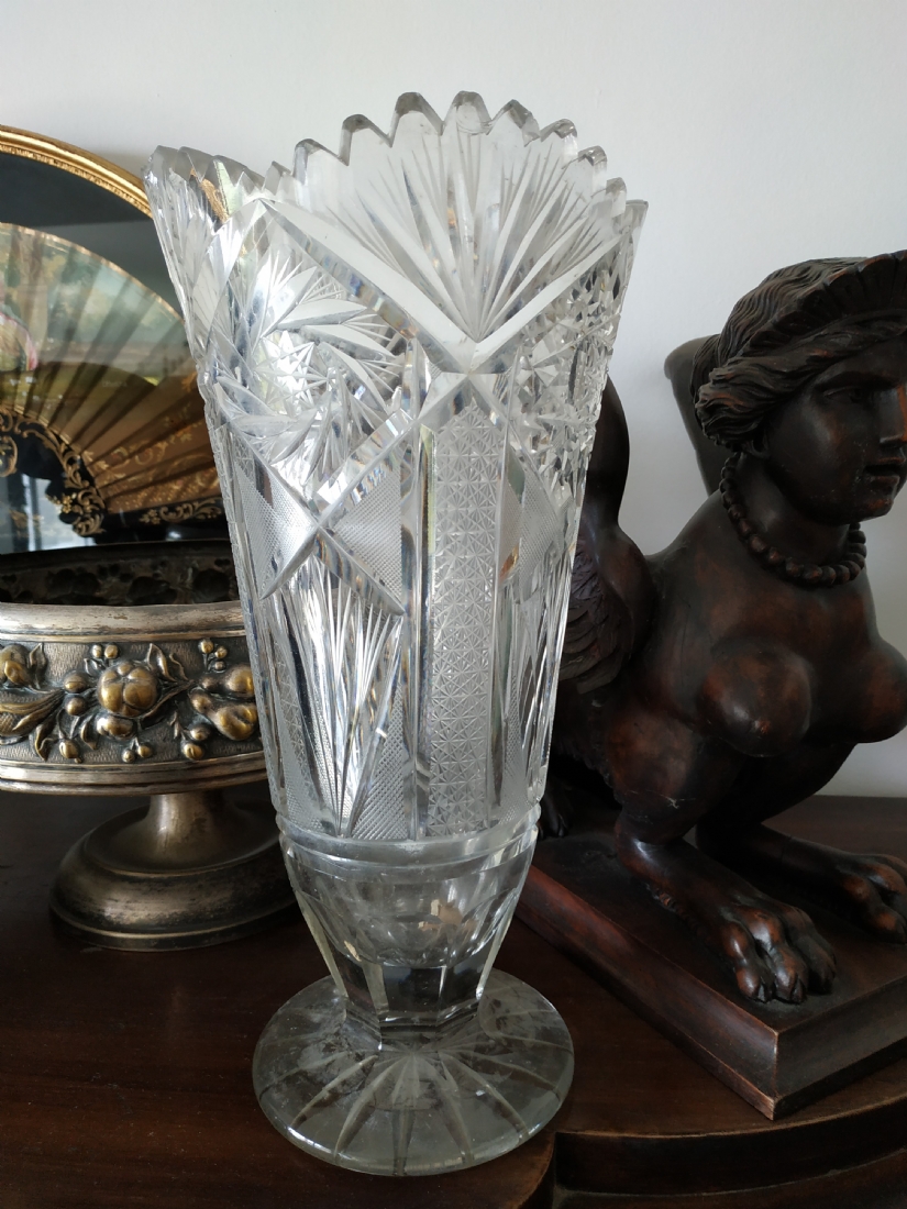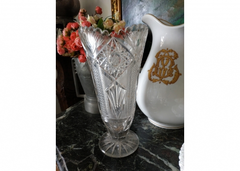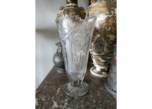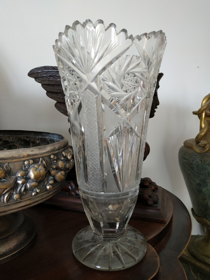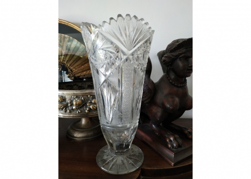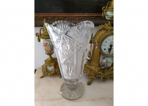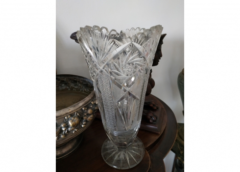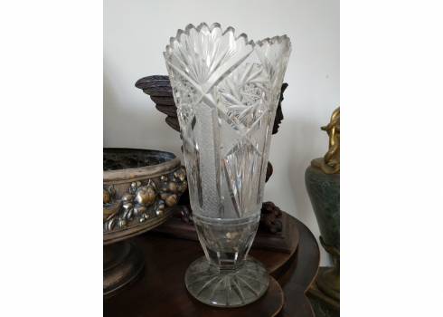 מספר הפריט בקטלוג 152אגרטל קריסטל צ'כי גדול רחב ואיכותי, מלוטש ביד, פגמים לשפה ולבסיס (צ'יפים) אבל בהחלט ניתן לשימוש, גובה: 31 ס"מ.
