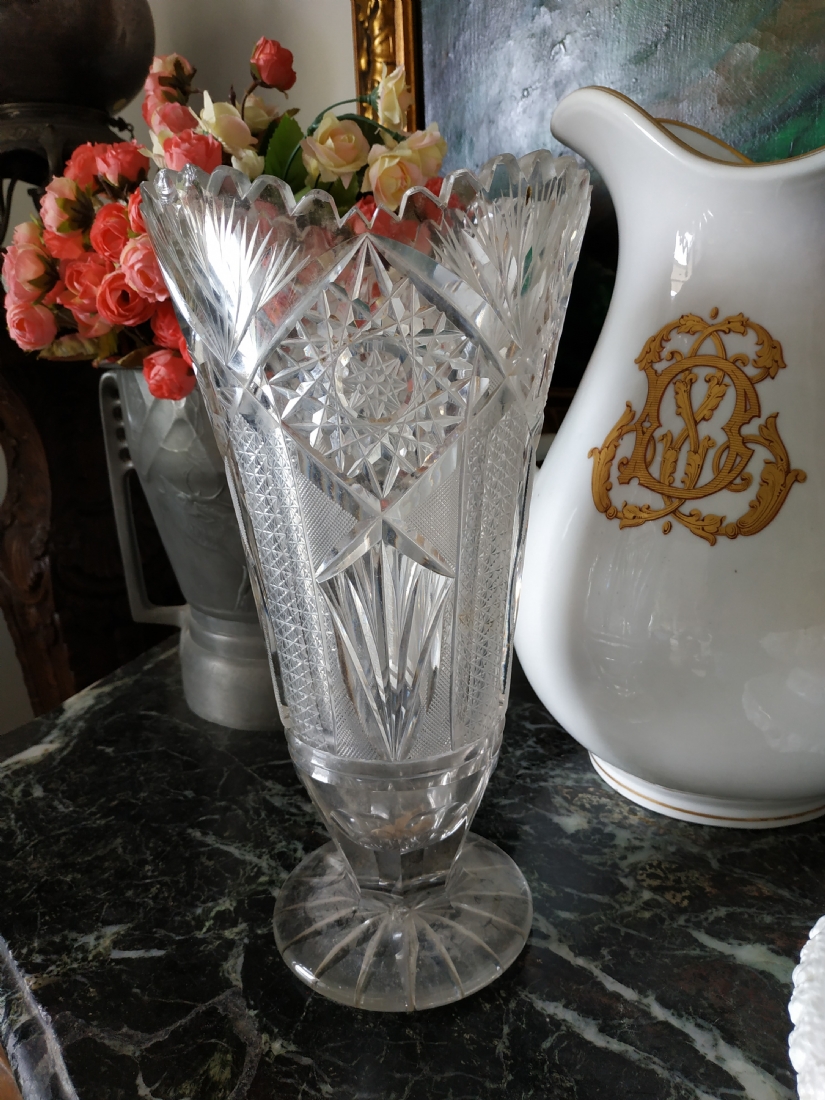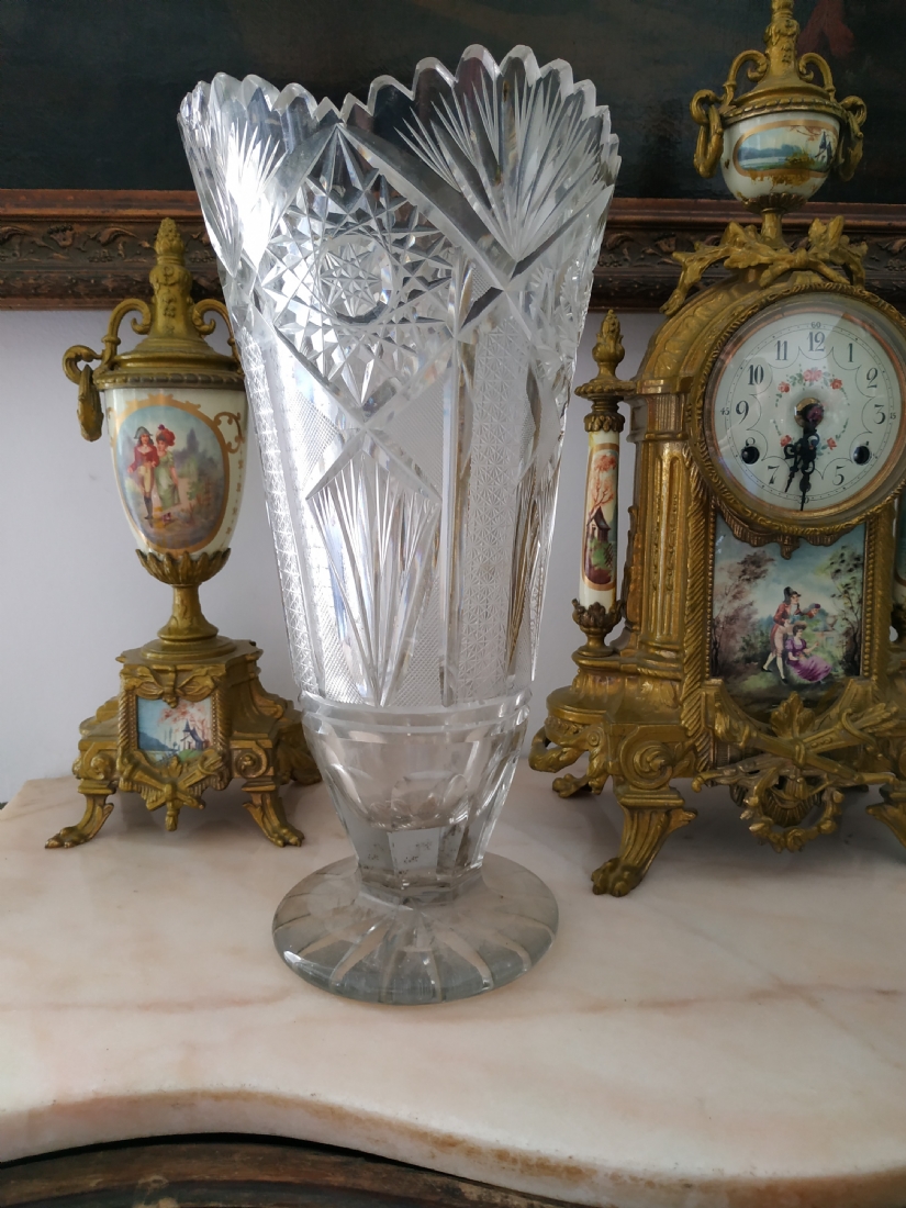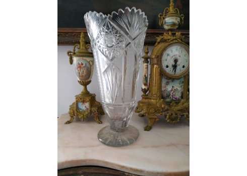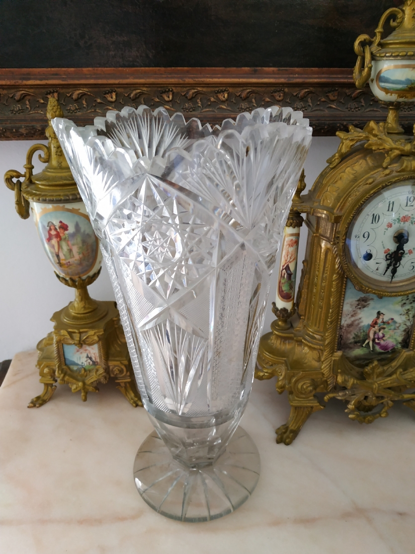 מספר הפריט בקטלוג 152אגרטל קריסטל צ'כי גדול רחב ואיכותי, מלוטש ביד, פגמים לשפה ולבסיס (צ'יפים) אבל בהחלט ניתן לשימוש, גובה: 31 ס"מ.
