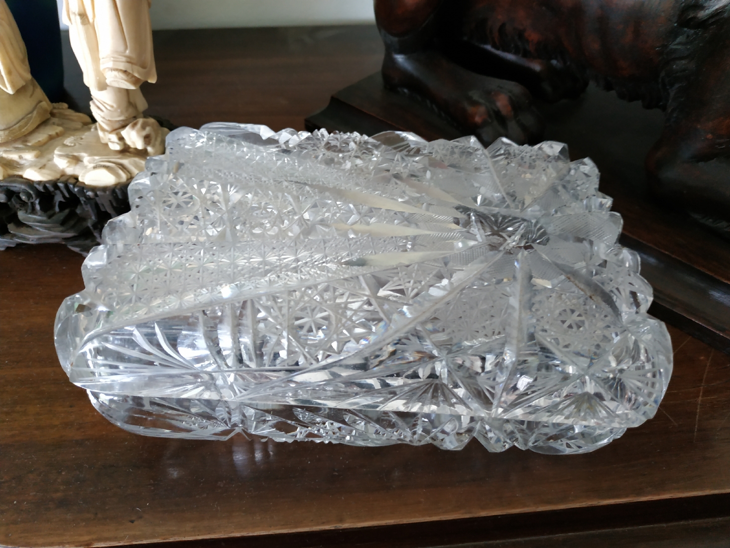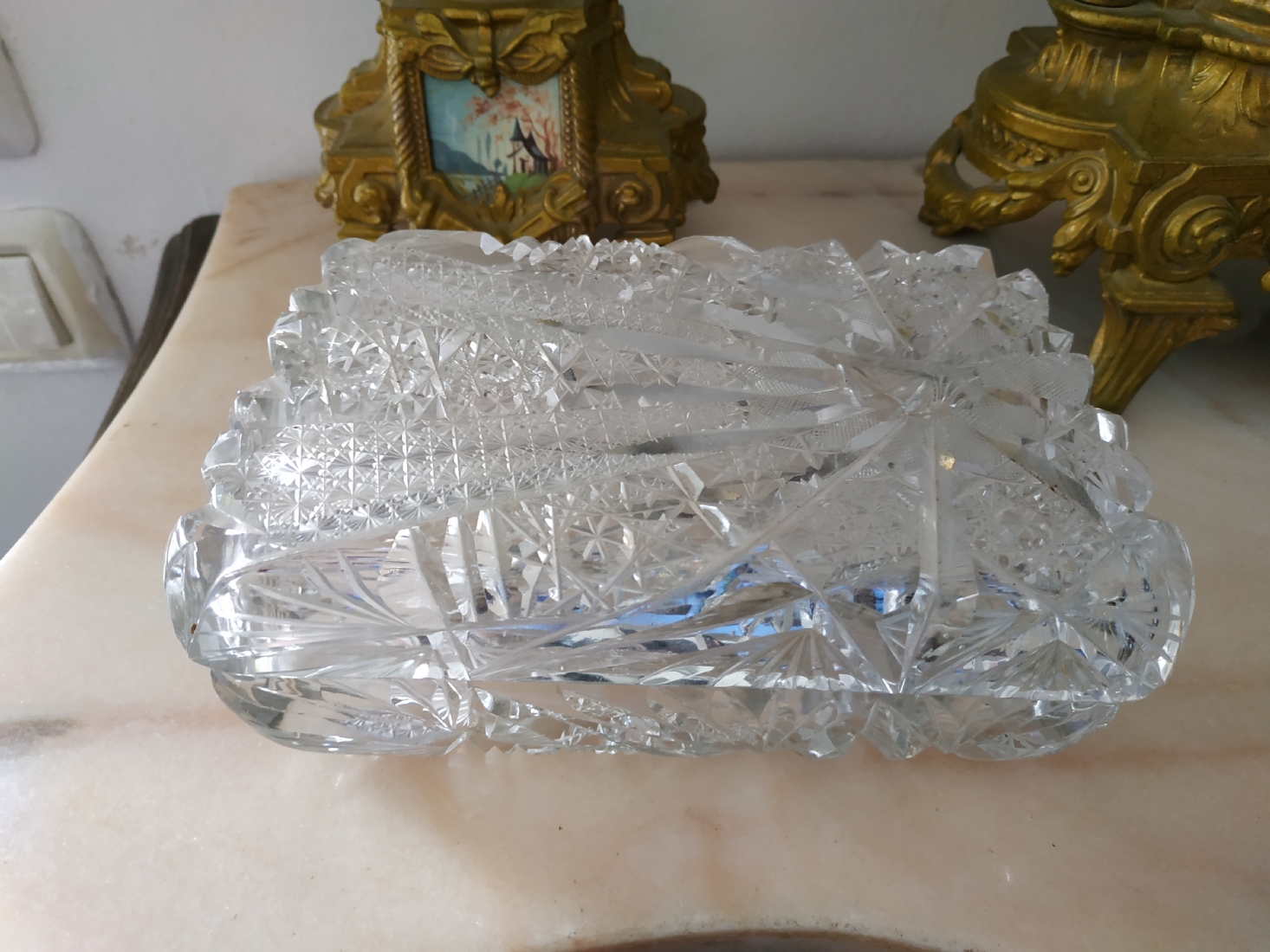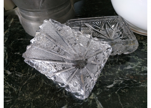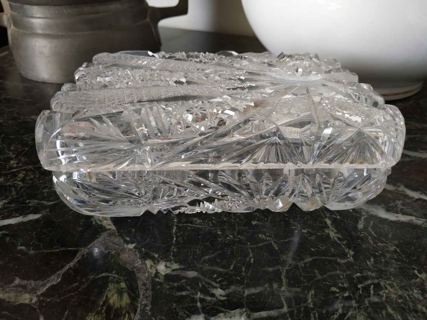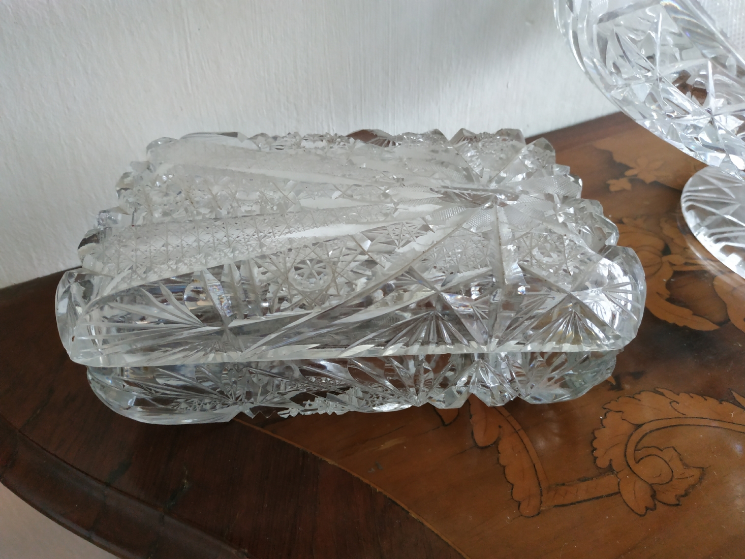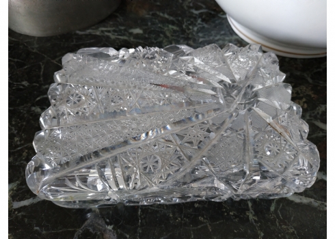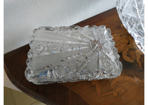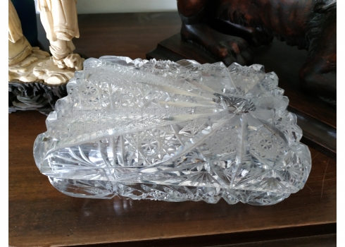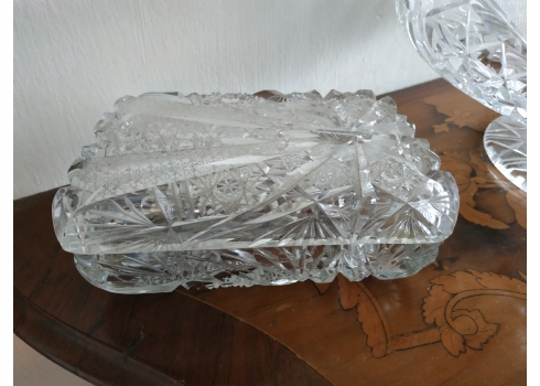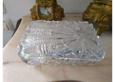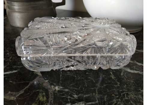 קופסאת קריסטל ישנה ואיכותית ומכסה תואם, ליטוש ידני, גובה: 7 ס"מ, מידות הבסיס: 11X17 ס"מ.